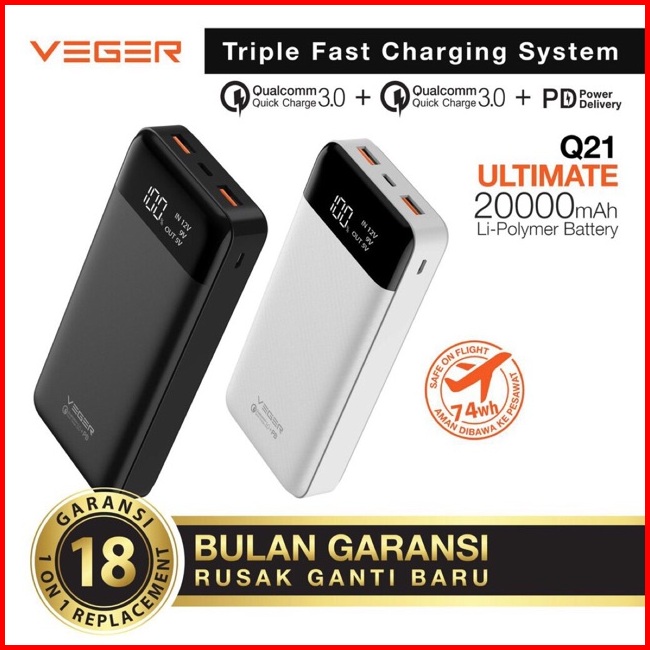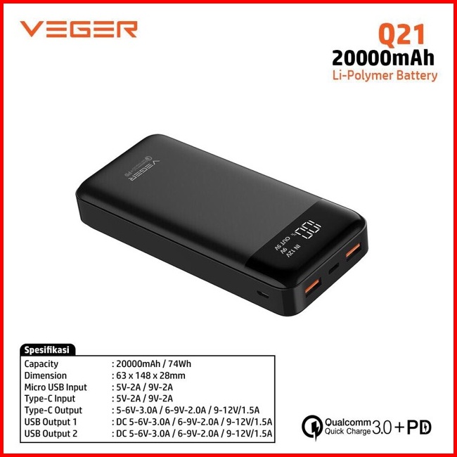 Powerbank Veger Ultimate Q21 20000mah Quick Charge 3.0 Qualcomm 2output Original Garansi Resmi 18bln