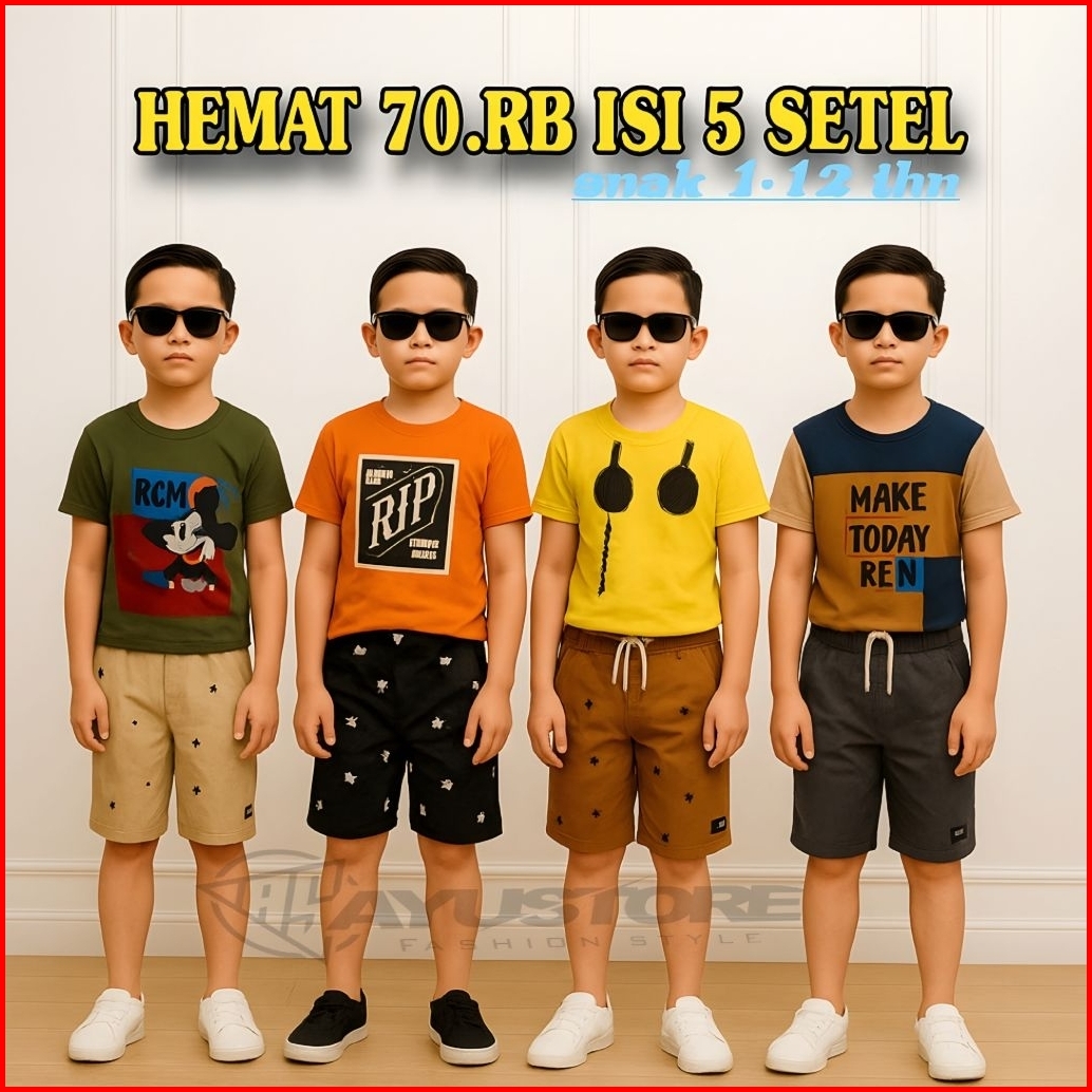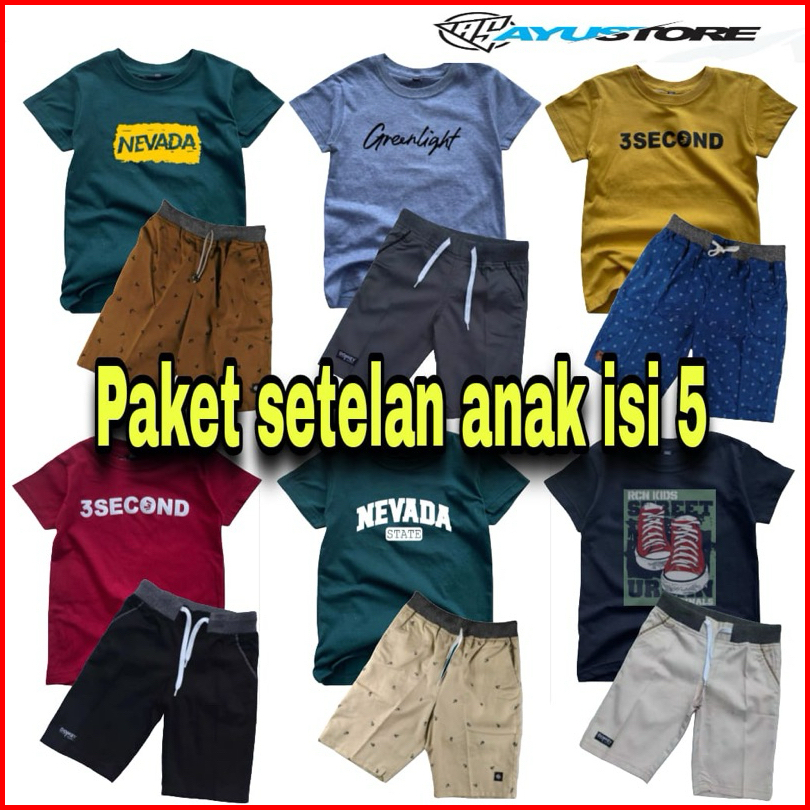 Setelan Anak Cowok Isi 5 Baju Stel Celana Motif Polos Unisex Kaos Anak Laki Perempuan