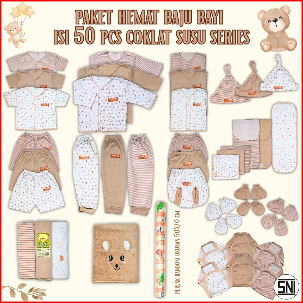 50 Pcs Paket Hemat Bundling Baju Bayi Baru Lahir Setelan Newborn 0 Sd 3 Bulan Serian Coklat Susu