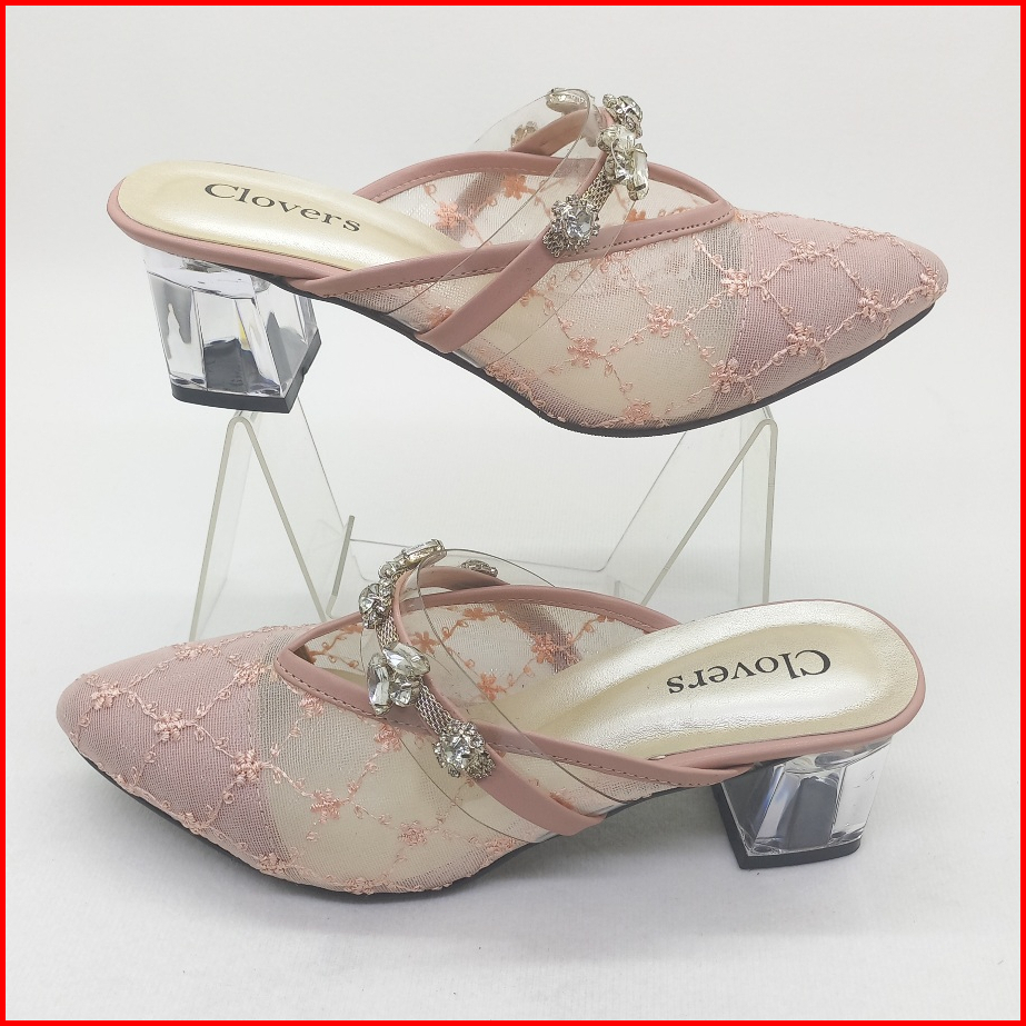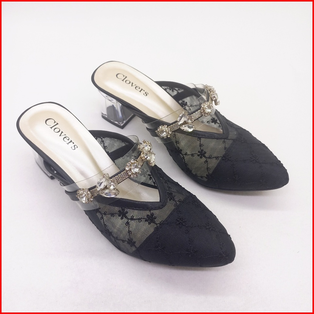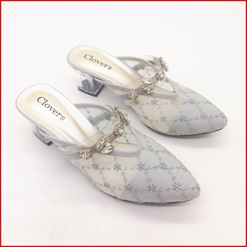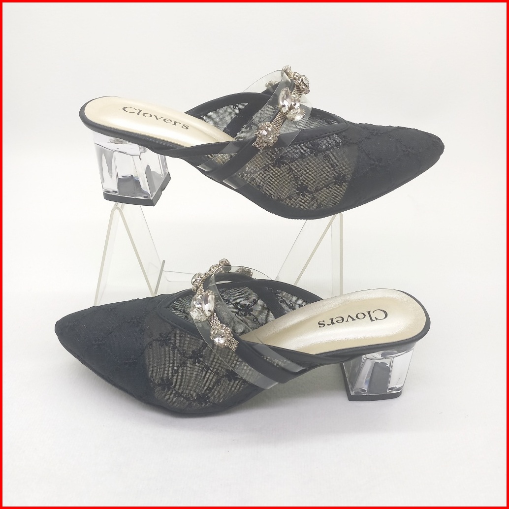 Clovers Shoes Sandal Wanita Pesta Pernikahan Sandal Wisuda High Heels Brukat Permata Hak Kaca 5 Cm