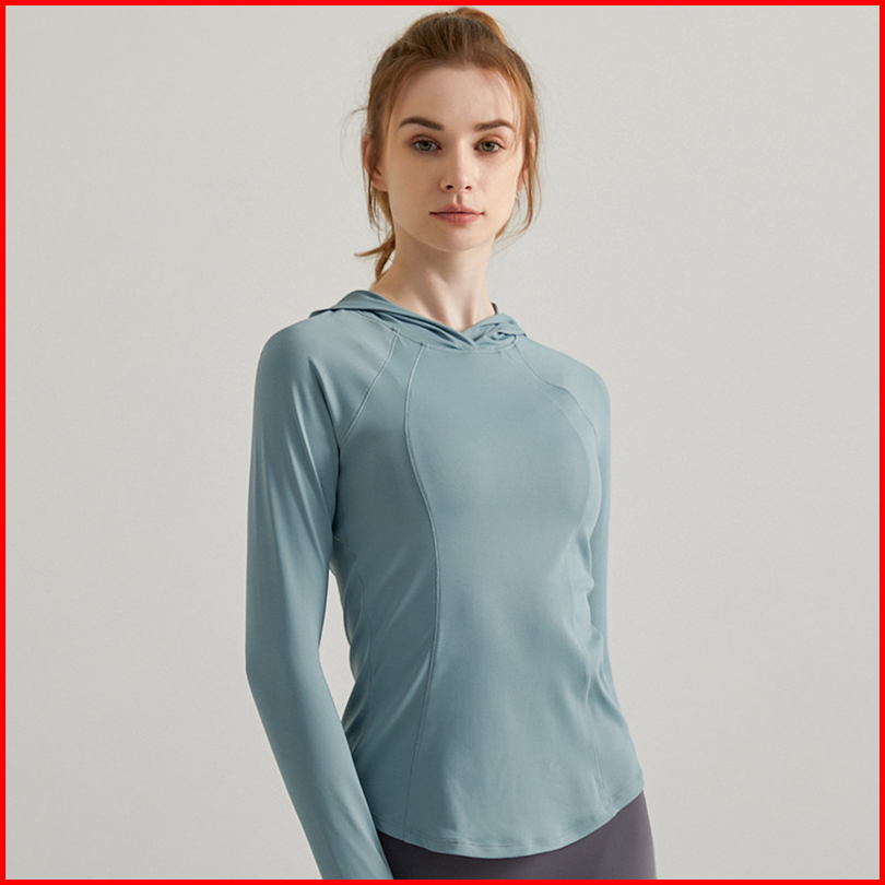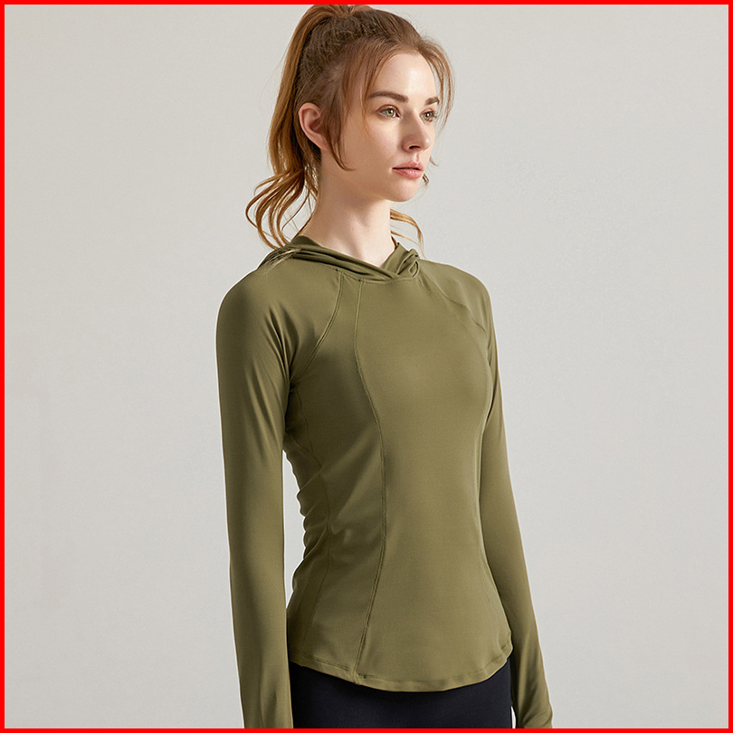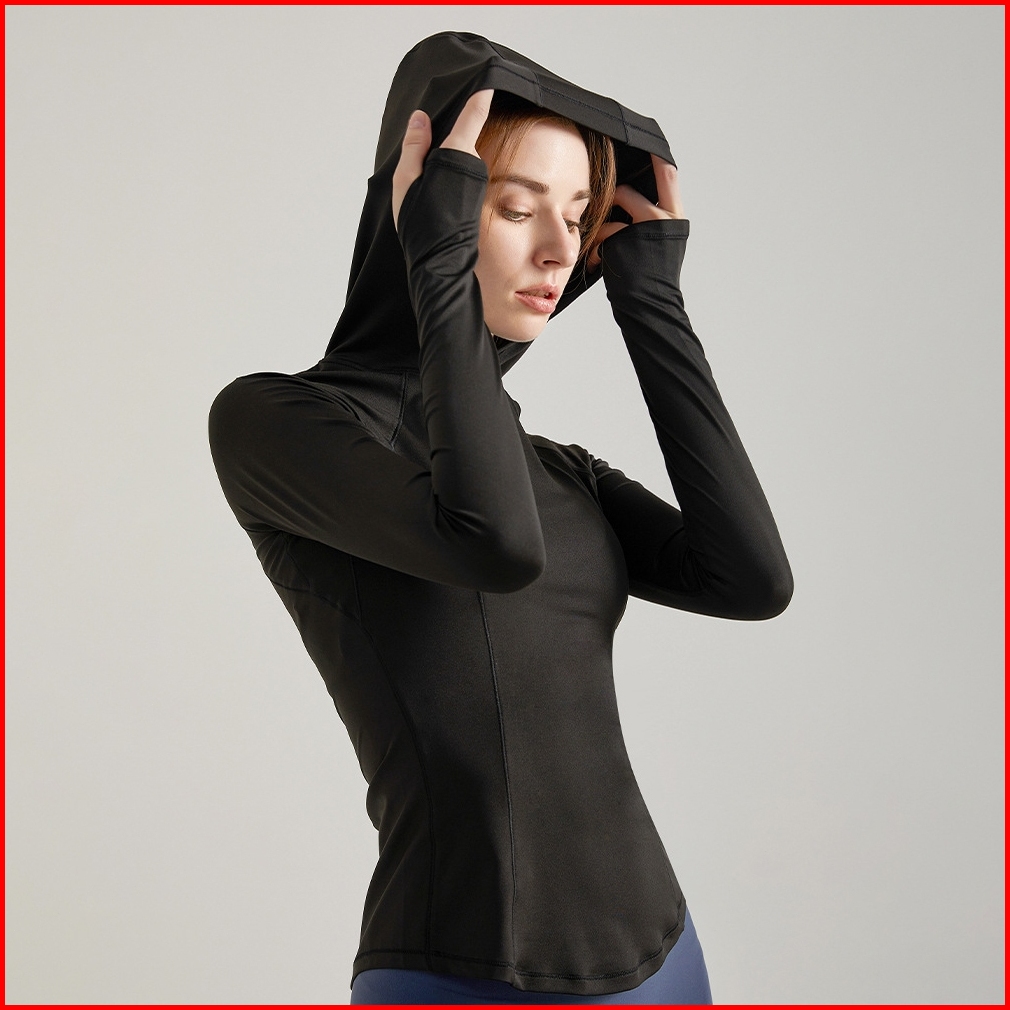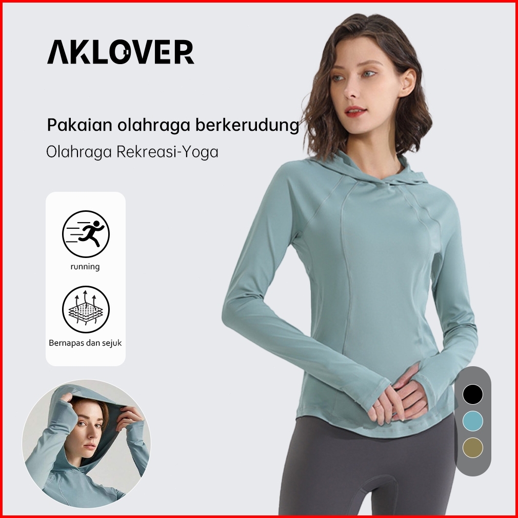 Aklover Pakaian Yoga Berkerudung Atasan Lengan Panjang Lari Wanita Slim Fit Bernapas Cepat Kering