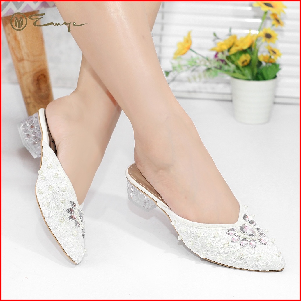 Emye - Sepatu Slop Brukat Payet Glitter Original Wanita Hak Kaca 3cm Sepatu Pesta Payet Pengantin Sandal Pesta Kondangan