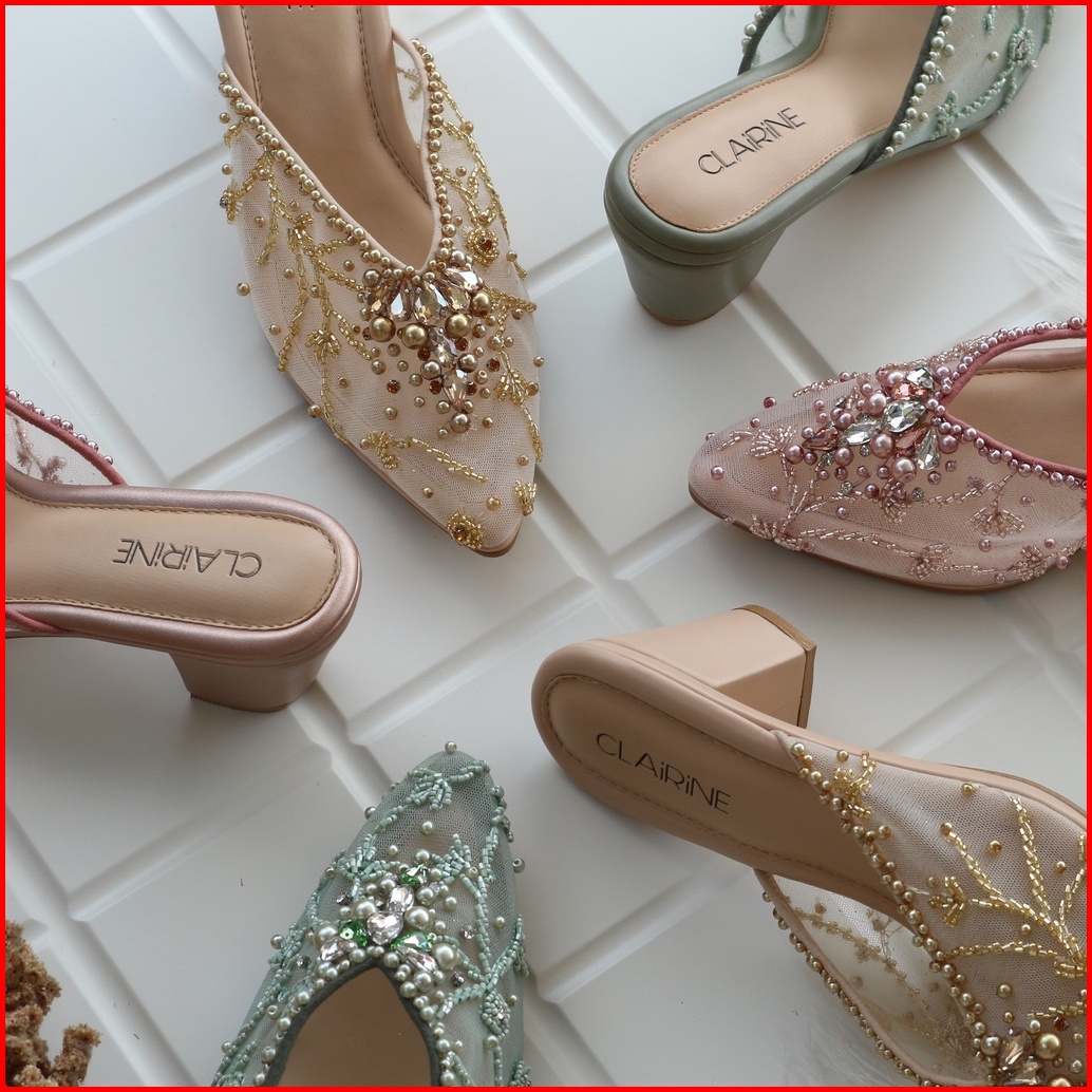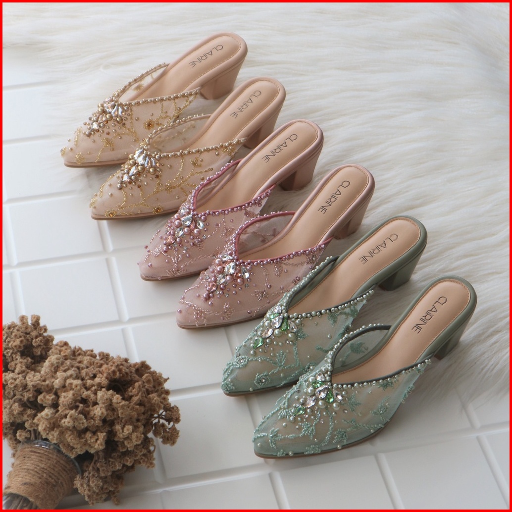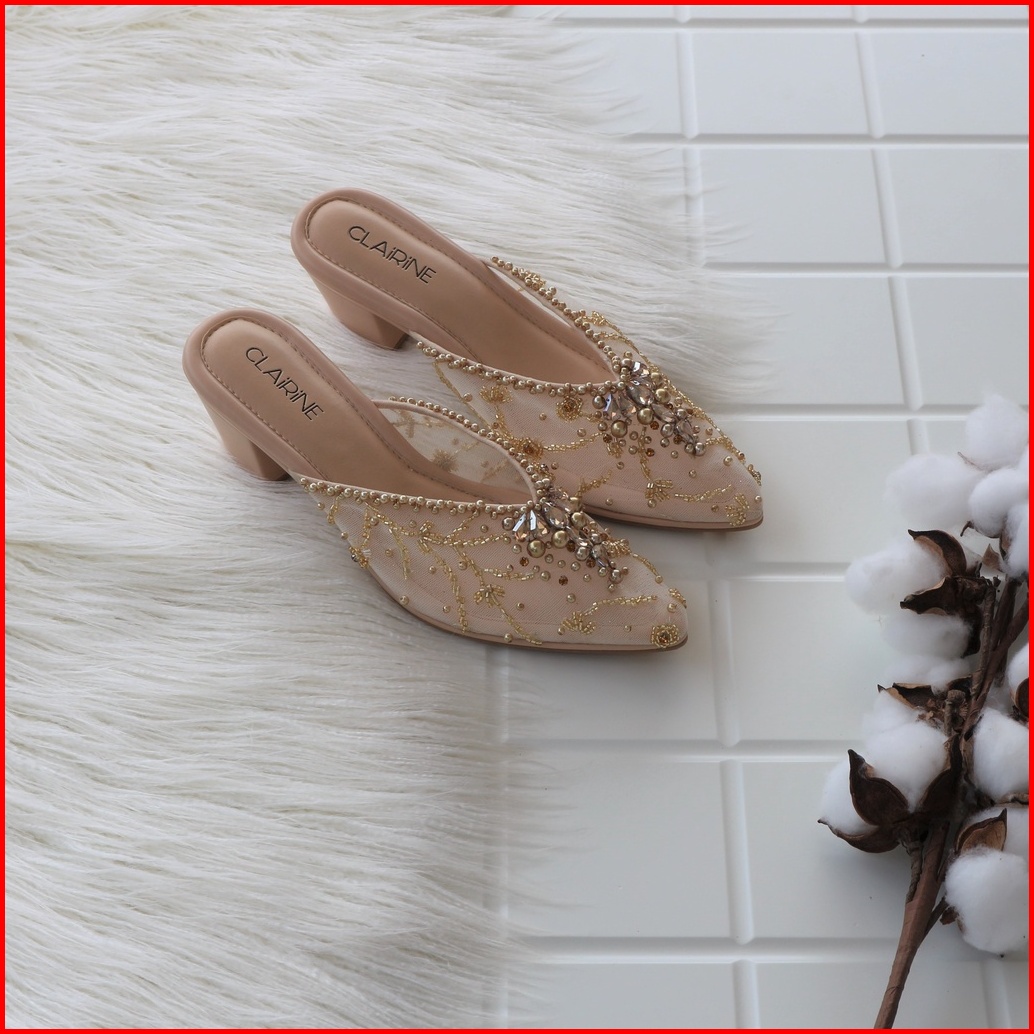 Clairine - Ziva Mules Readystock Wedding Shoes Heels Pesta Kondangan Wanita V-line Brokat Bunga