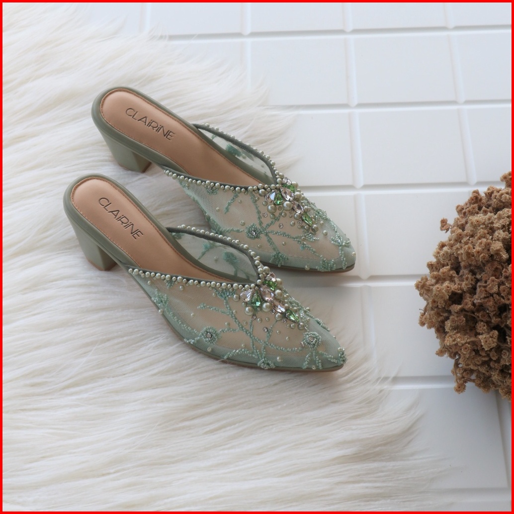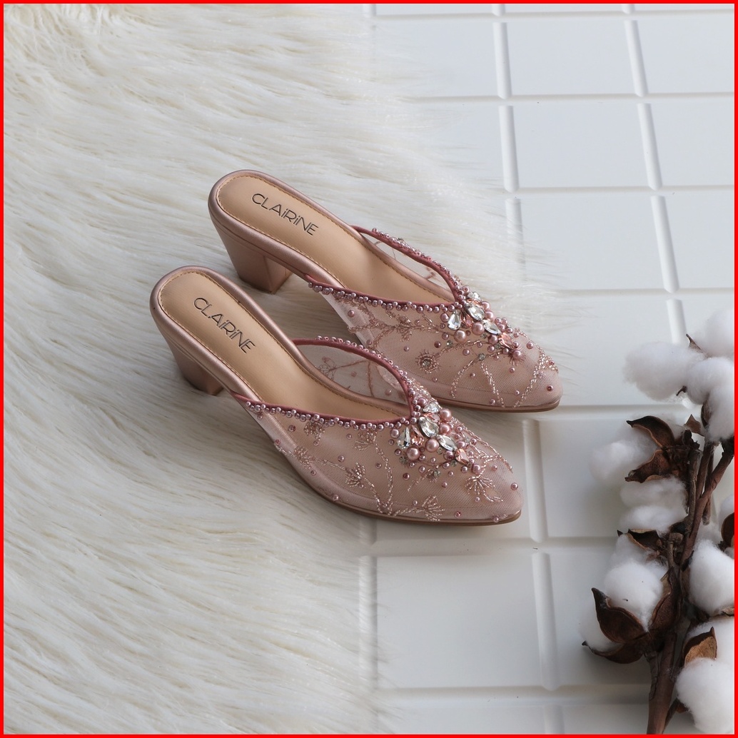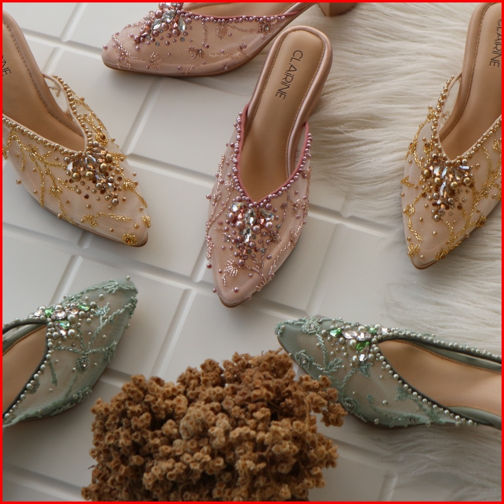 Clairine - Ziva Mules Readystock Wedding Shoes Heels Pesta Kondangan Wanita V-line Brokat Bunga