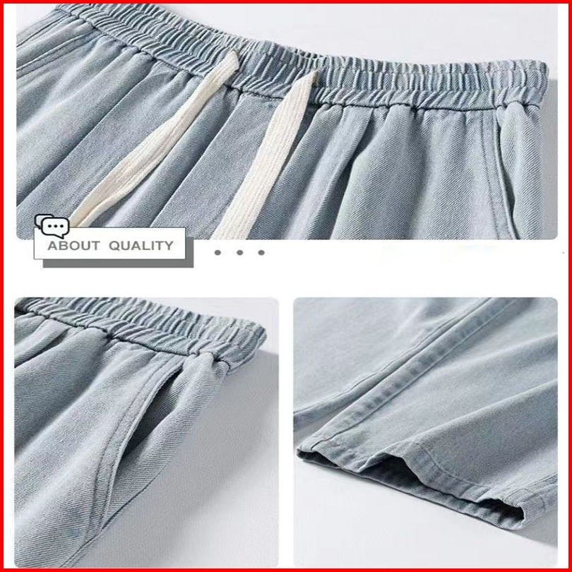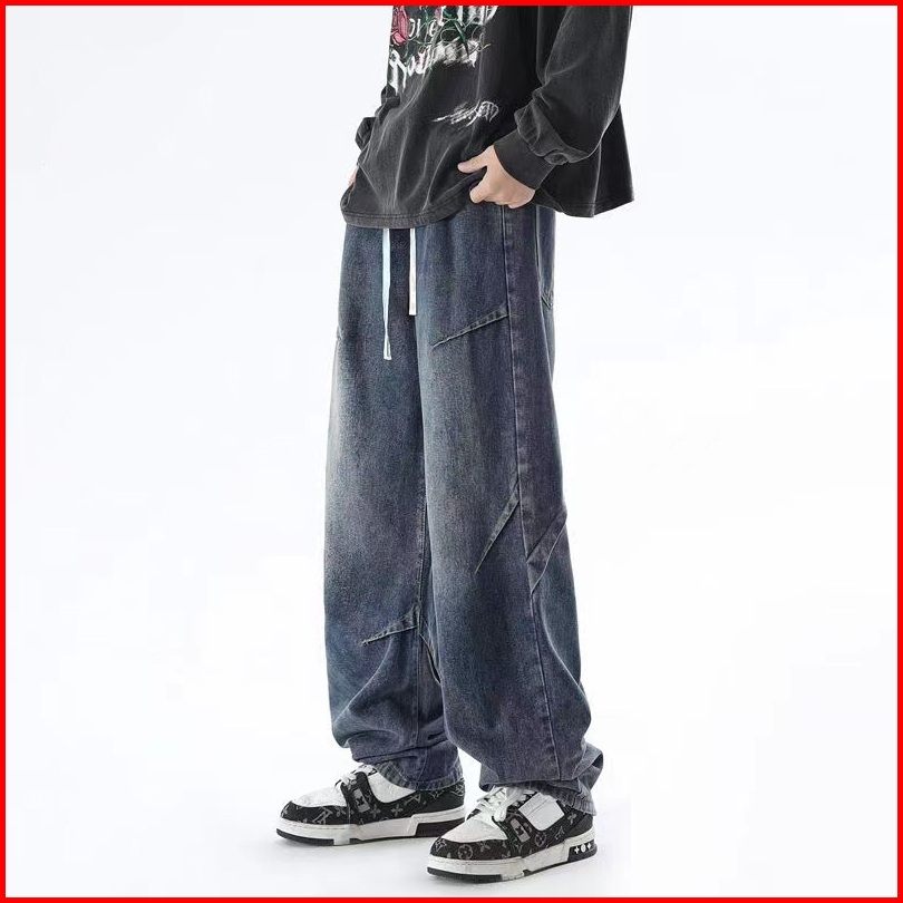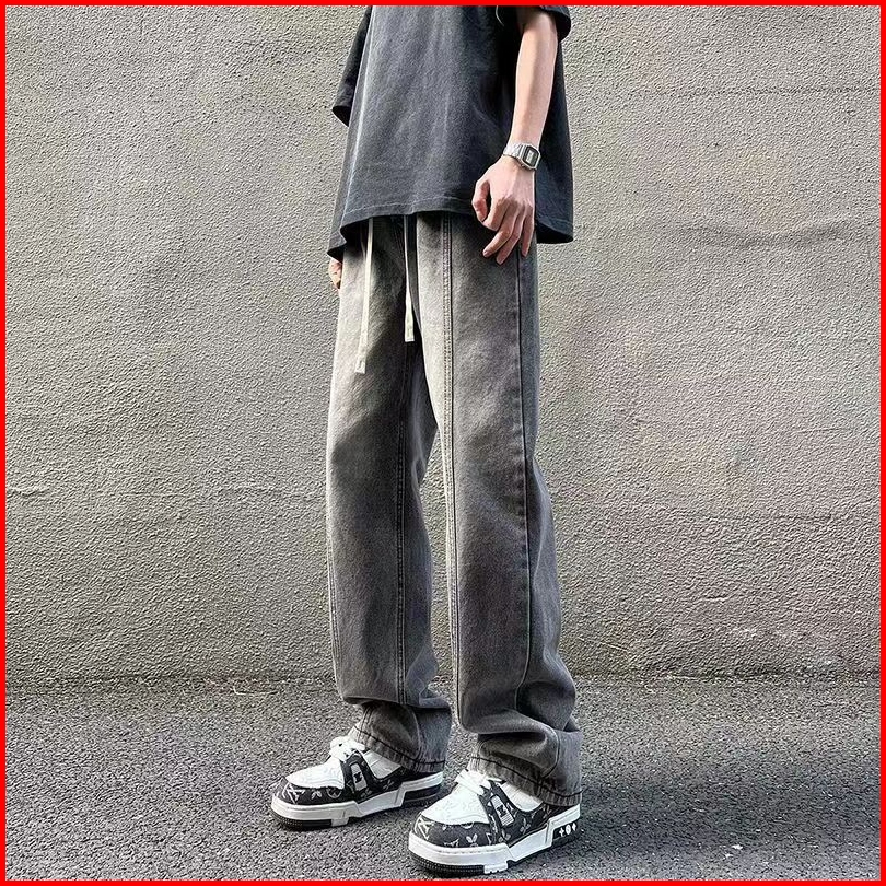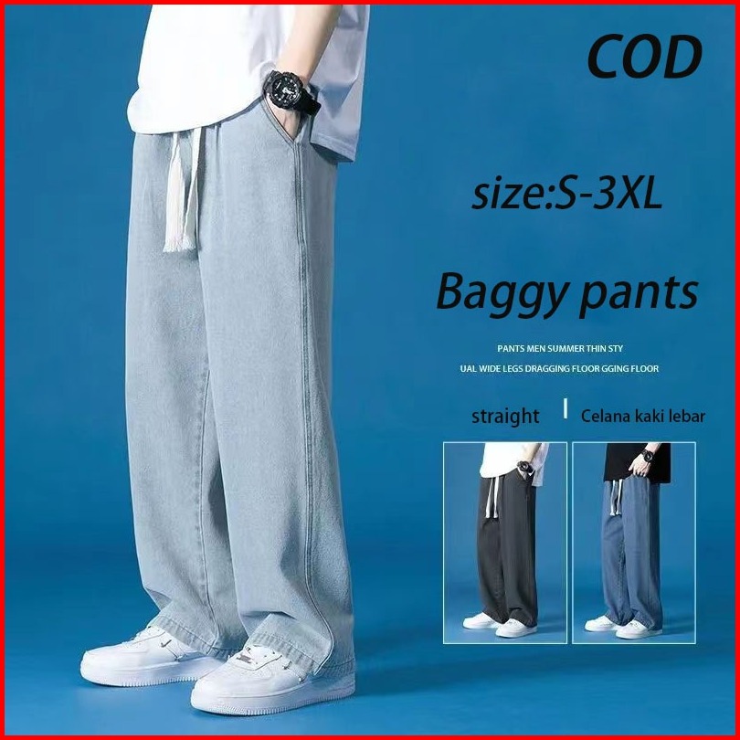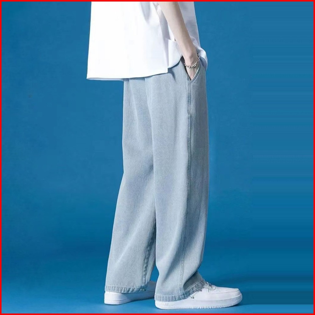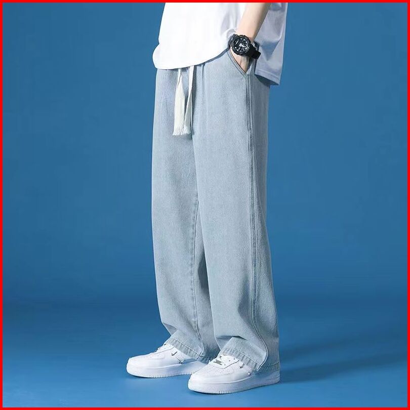 Keyboy Celana Jeans Pria Baggy Panjang Straight Korean Style Casual Loose Pants Biru Pinggang Karet Celana Denim Fashion