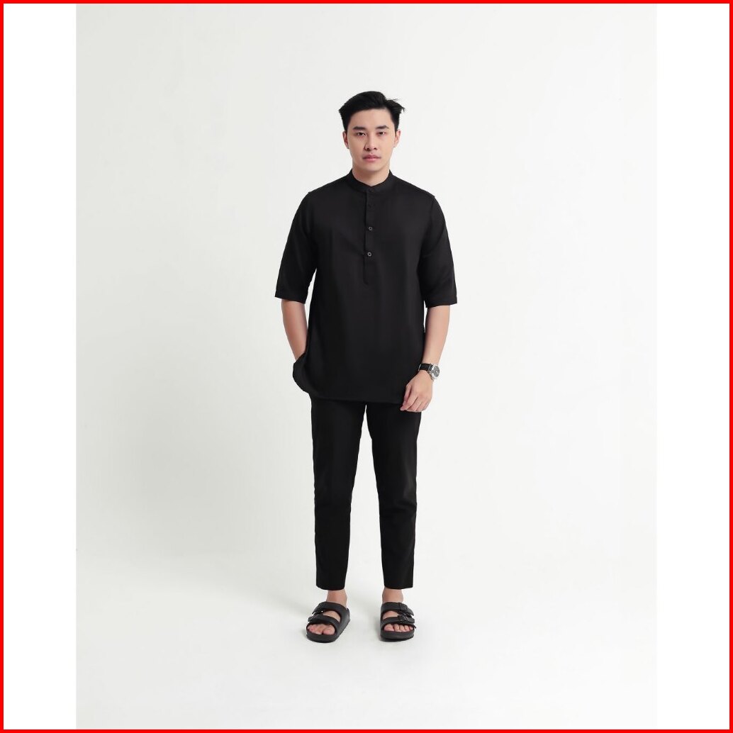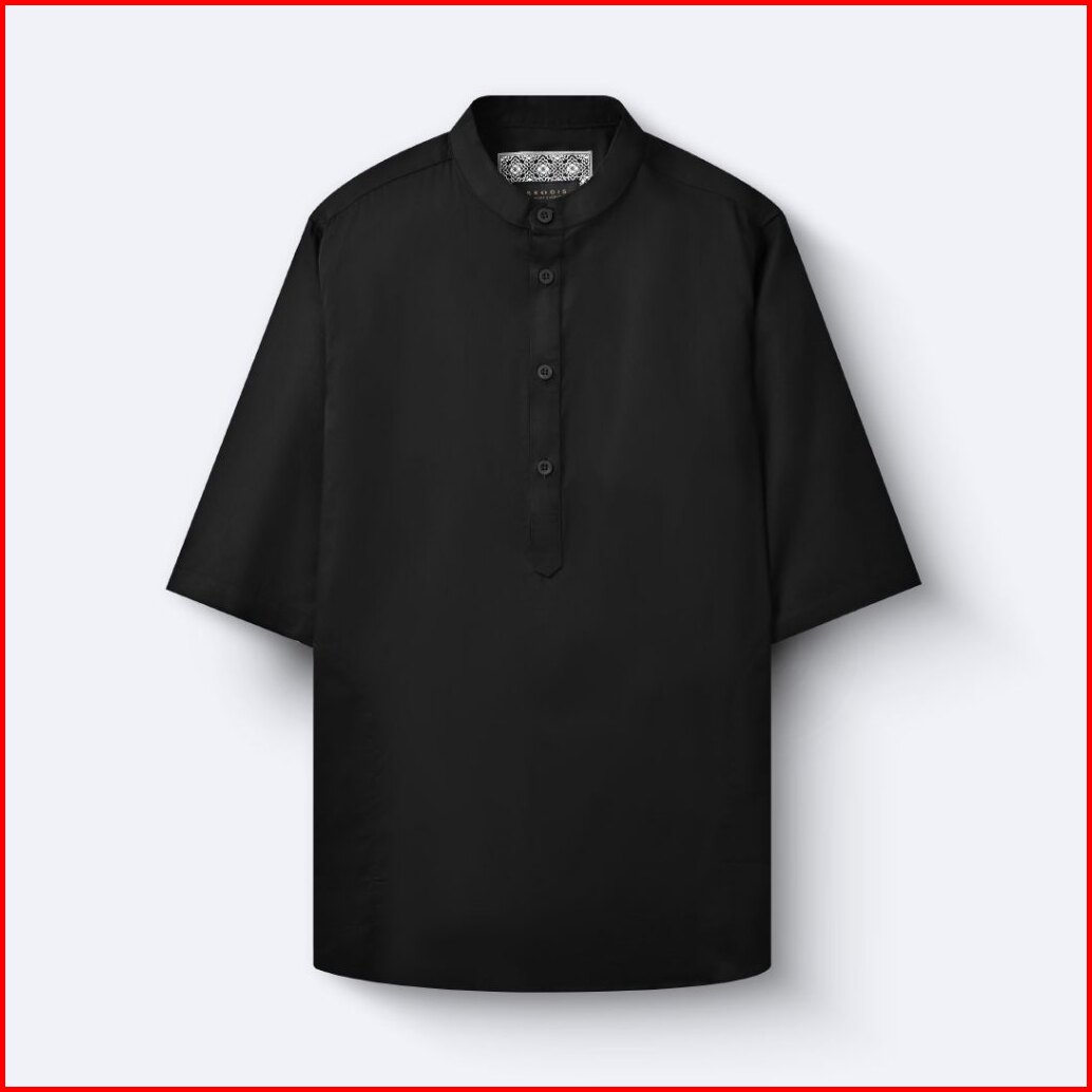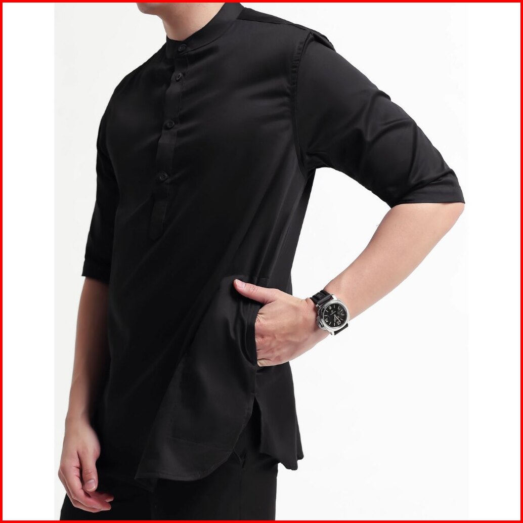 Broodis Kemeja Koko Kurta Pria Cotton Sateen Black Kerah Shanghai Lengan Panjang - Qudsy Black Series