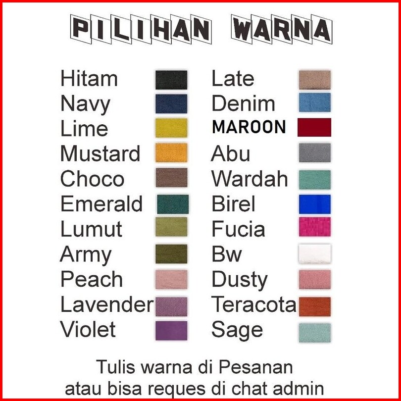 RANDOM, PILIH WARNA, Hitam + Choco + Lime, Choco+Lime+Teracta, Hitam+Choco+Maroon, Denim+Lavender+Dusty, Grey+Mustard+Navy, Denim+Teracta+Emerld, Hitam+Emerald+Violet, Denim+Hitam+Teracota, Hitam+Lumut+Teracota, Late+Sage+Lavender, Hitam+Fucia+Violet, Lime+Wardah+ Lavnder, Hitam+Fucia+Maroon, Maroon+Violet+Emerld, Mustard+Choco+Lumut, Denim+Grey+Lavender, Lime + Late + Sage, Maroon+Violet+Denim, Mustard+Grey+Lumut, Mustard+Navy+Grey, Navy+Fucia+Violet, Sage+Dusty+Wardah, Teracta+Grey+Dusty, Violet+Choco+Dusty, Wardah+Dusty+Late