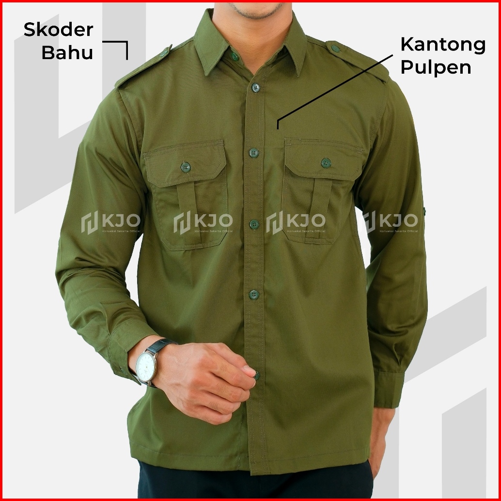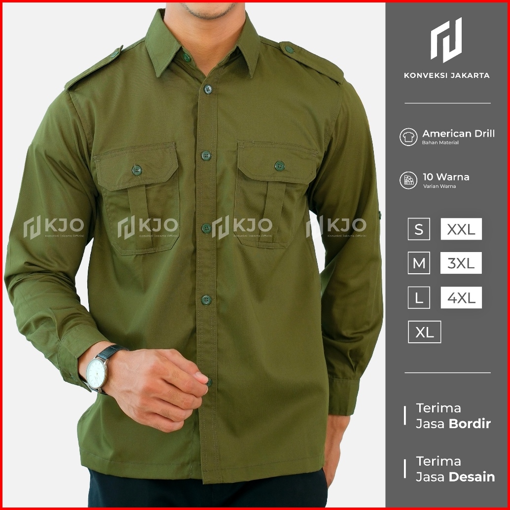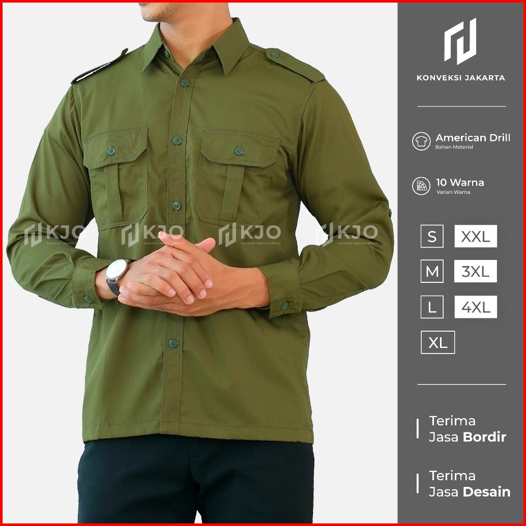 Baju Kemeja Pdl Lengan Panjang Pria - Seragam Pakaian Kerja Dinas Lapangan Outdoor Gunung Warna Hijau Army - Konveksi Ja