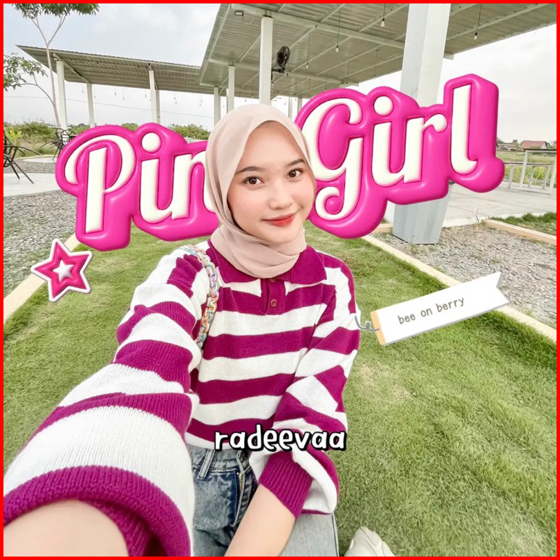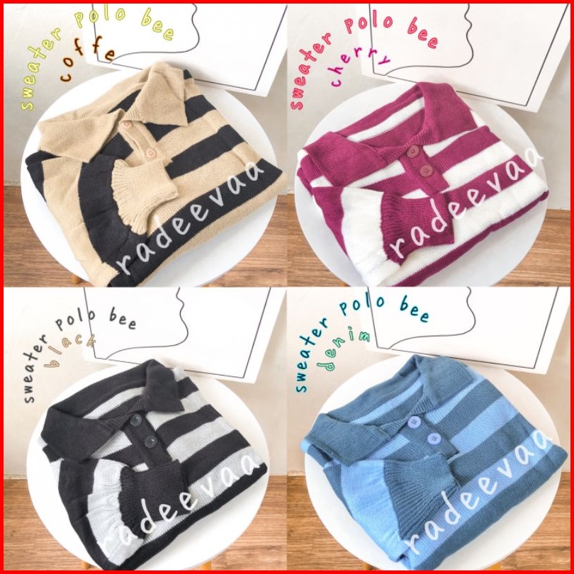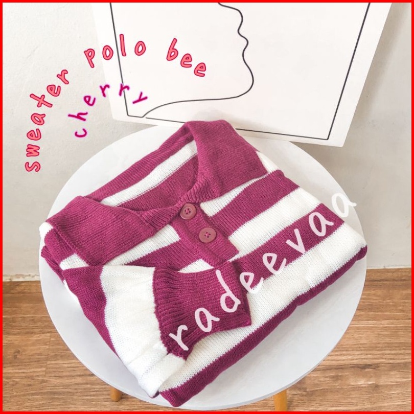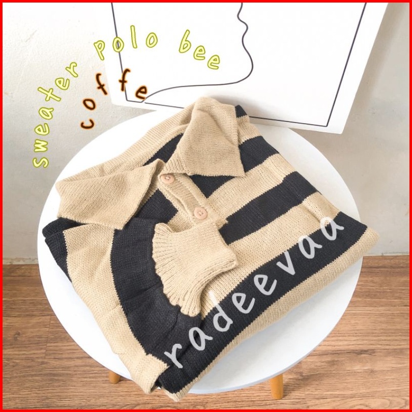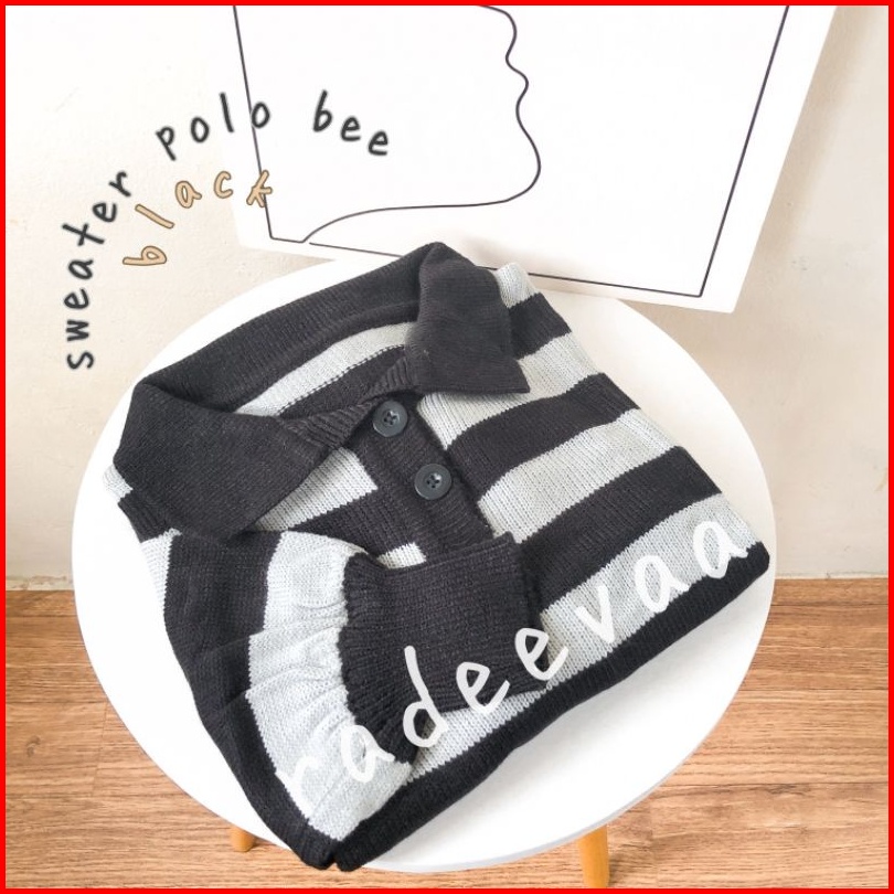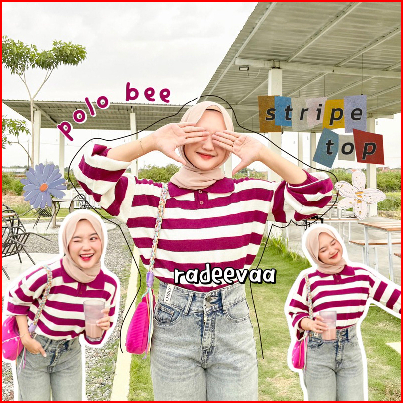 Polo Bee Sweater Knit Crop Top Kerah Stripe Oversize Atasan Rajut Wanita Motif Garis Korean Style