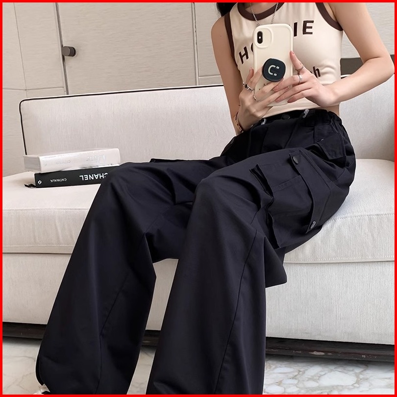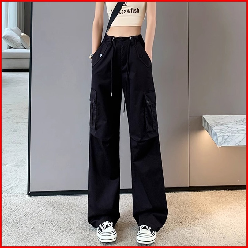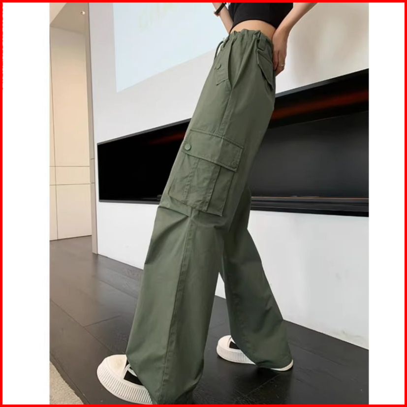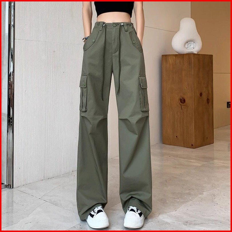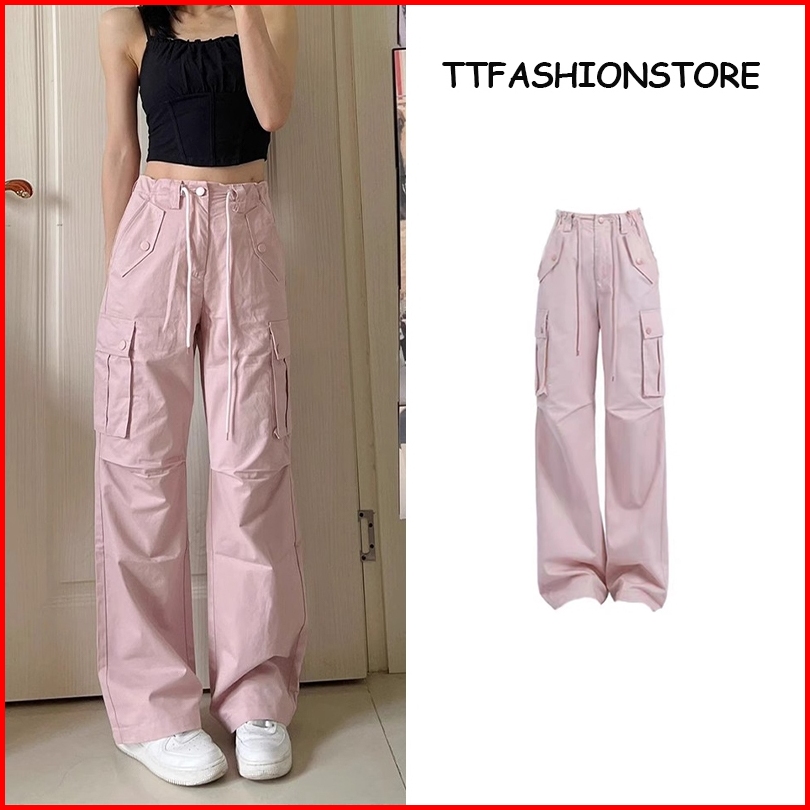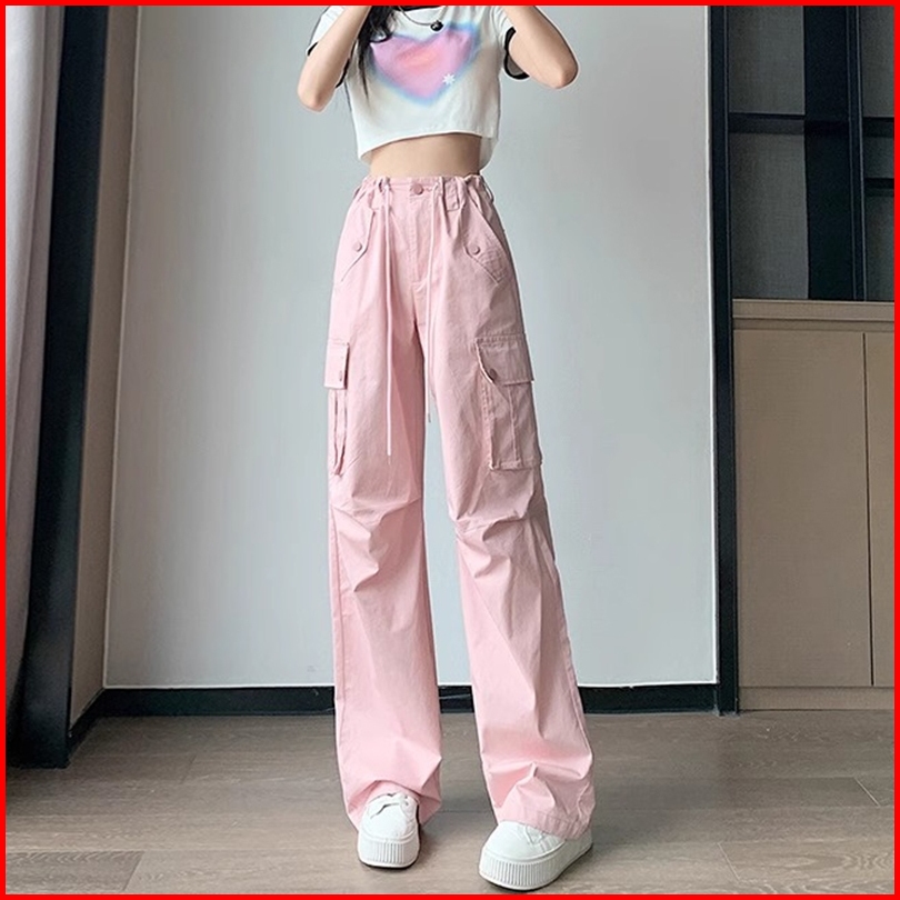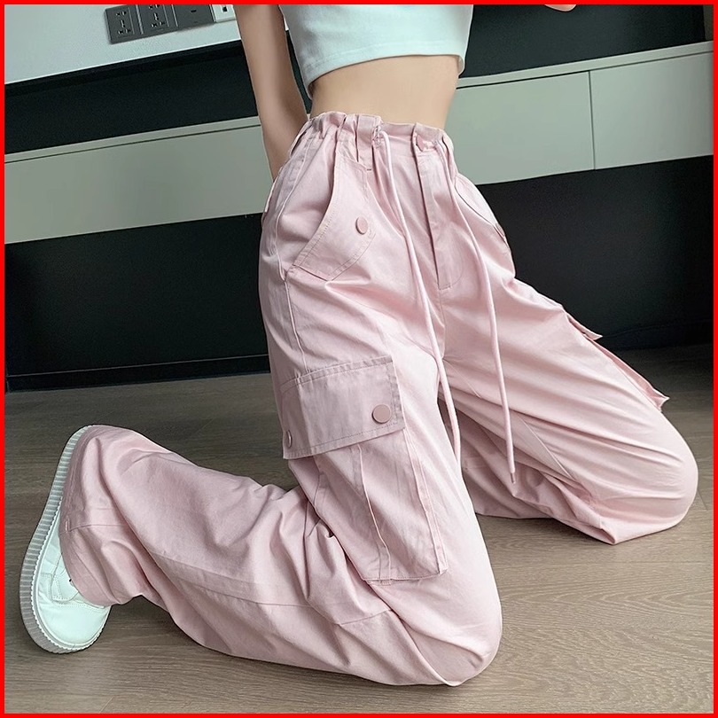 Celana Cargo Lurus Pinggang Tinggi Gaya Korea Kulot Serut Pink Kasual Wanita