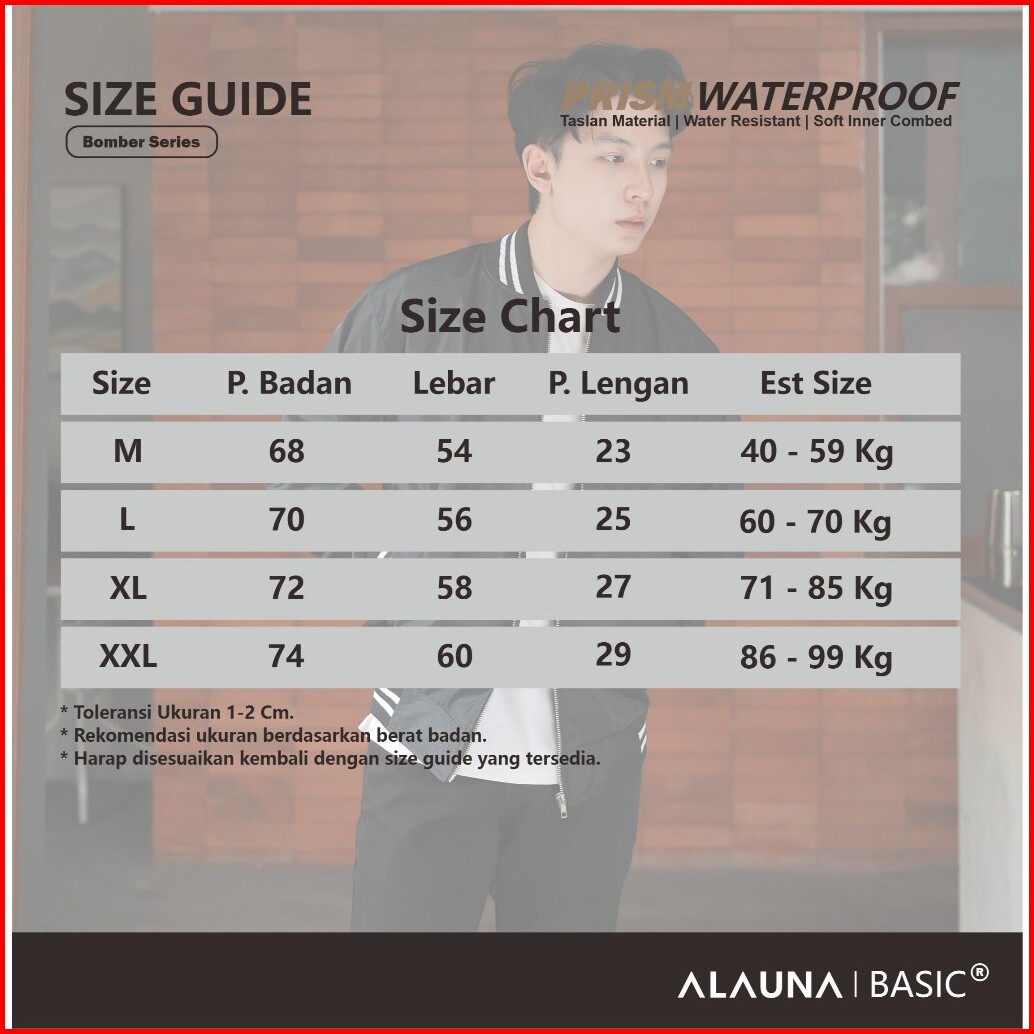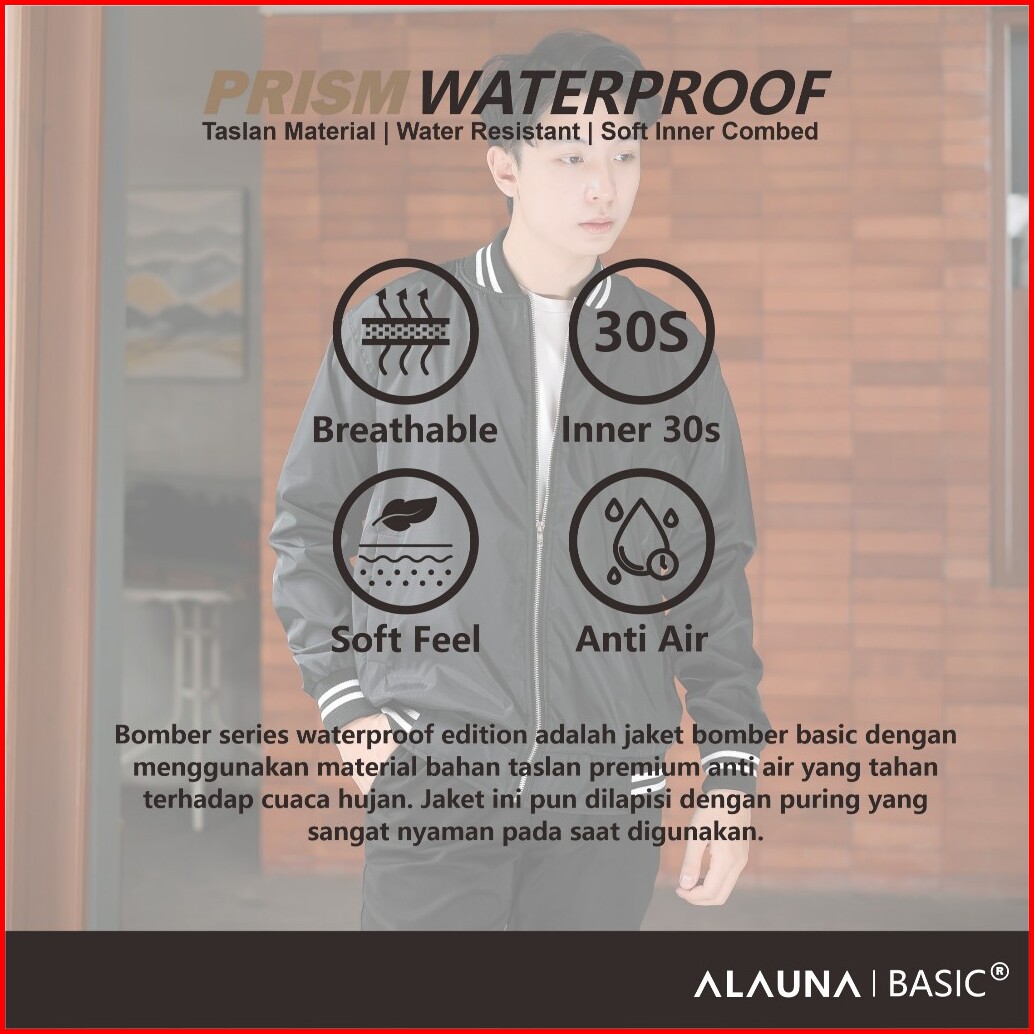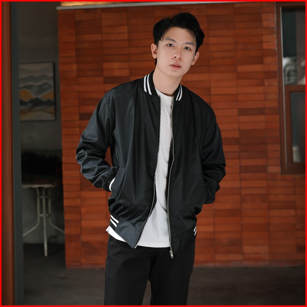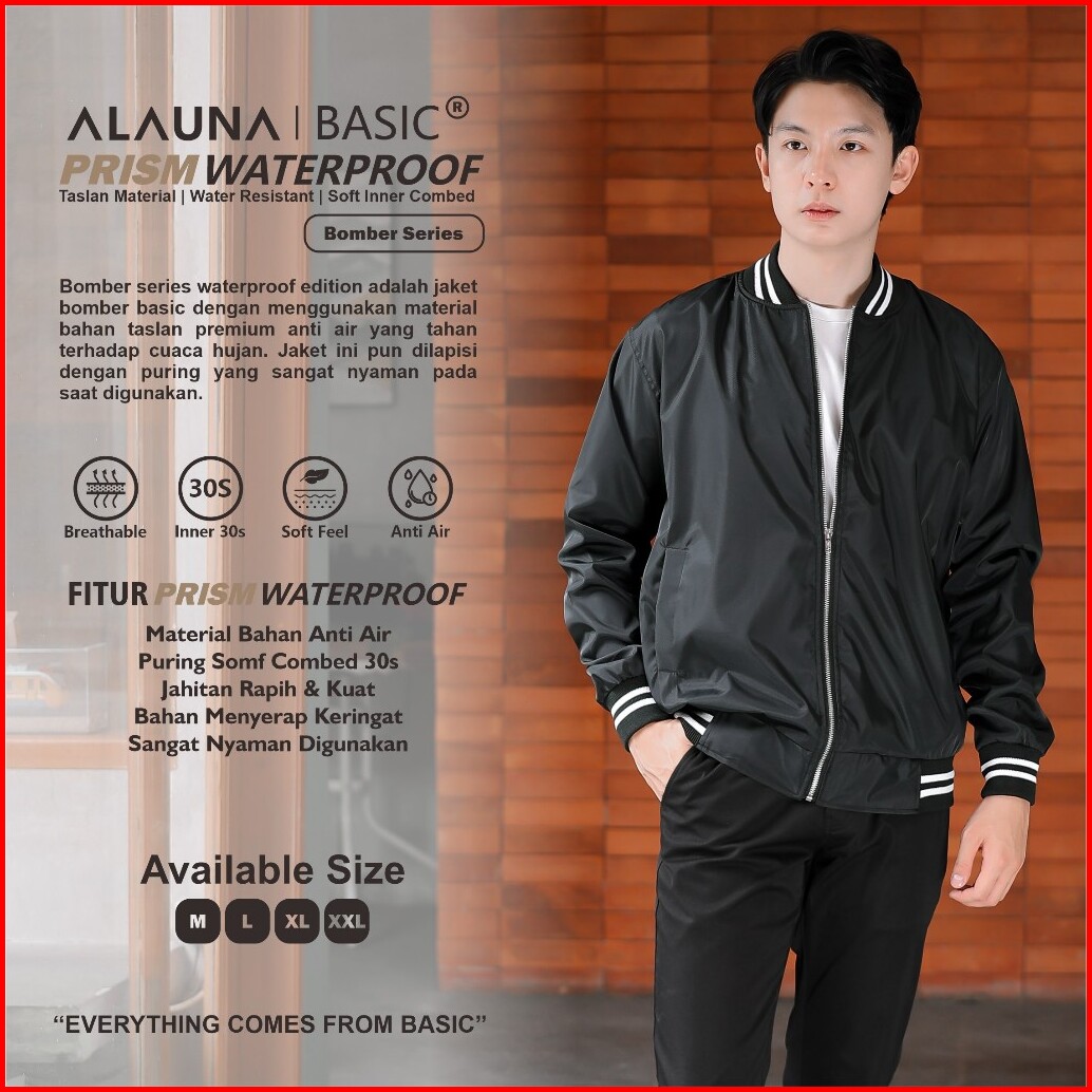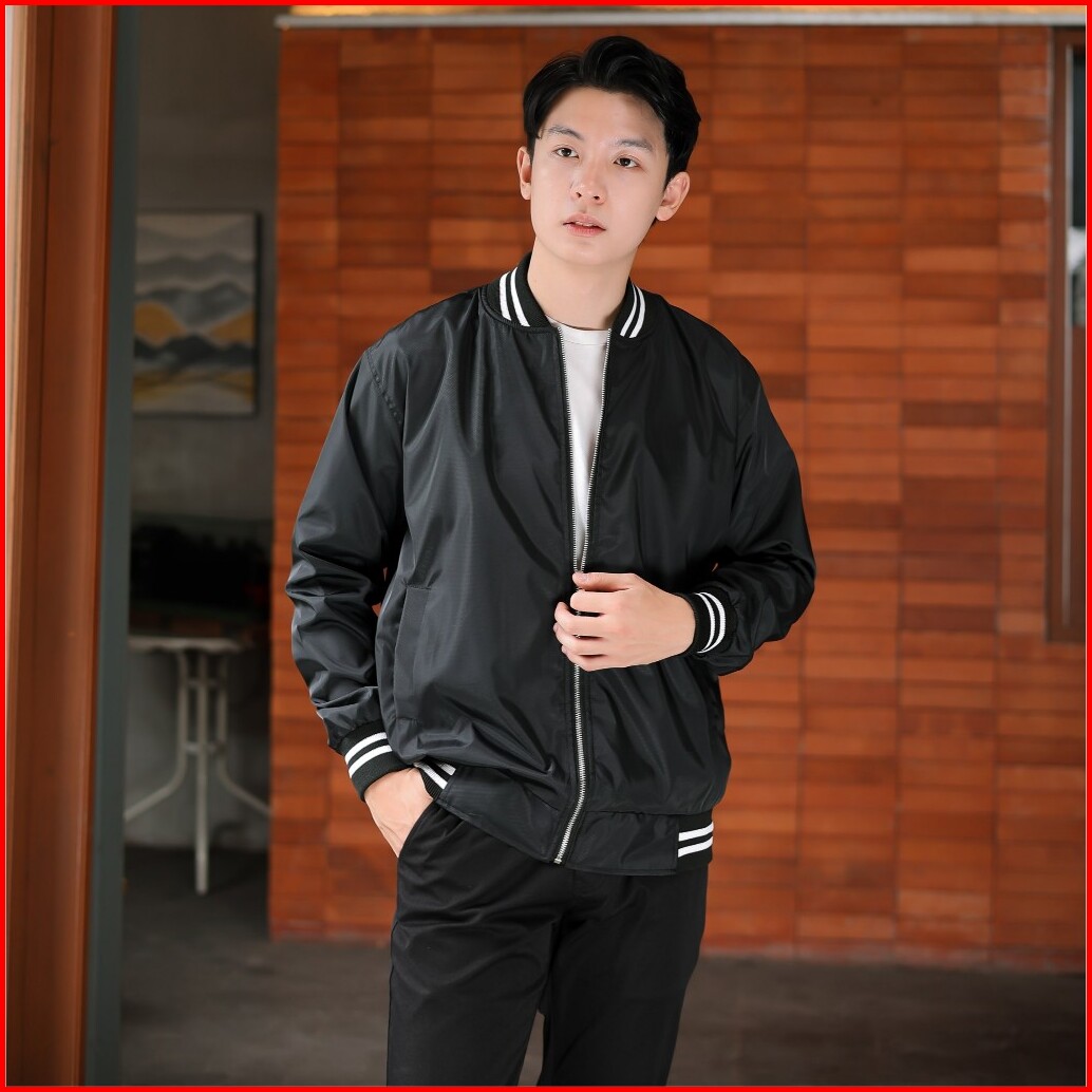 Alauna Basic - Jaket Bomber Pria Bahan Taslan Waterproof Anti Air Basic Premium List Stripes Hitam