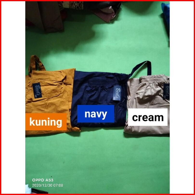 Hitam, Abu tua, Hijau army, Abu muda, Navy, Coklat tua, Putih, Mocca, Pink dusty, Merah bata, Coksus, Maroon, Kuning, Pink fanta, Merah cabe, Coklat muda, Burgundy, Biru, Ungu, Magenta, Broken white, Hijau fuji, Hijau daun, Hijau botol, Mustard, Hijau mint, Lilac, Orange, Lavender, Sage, Biru langit