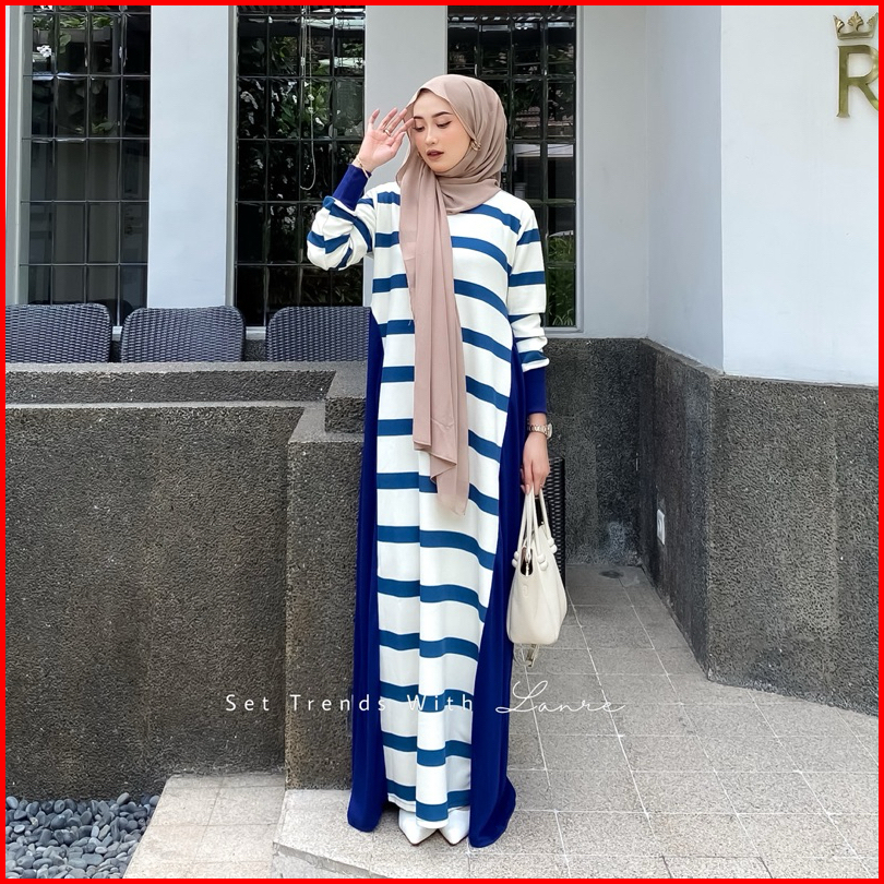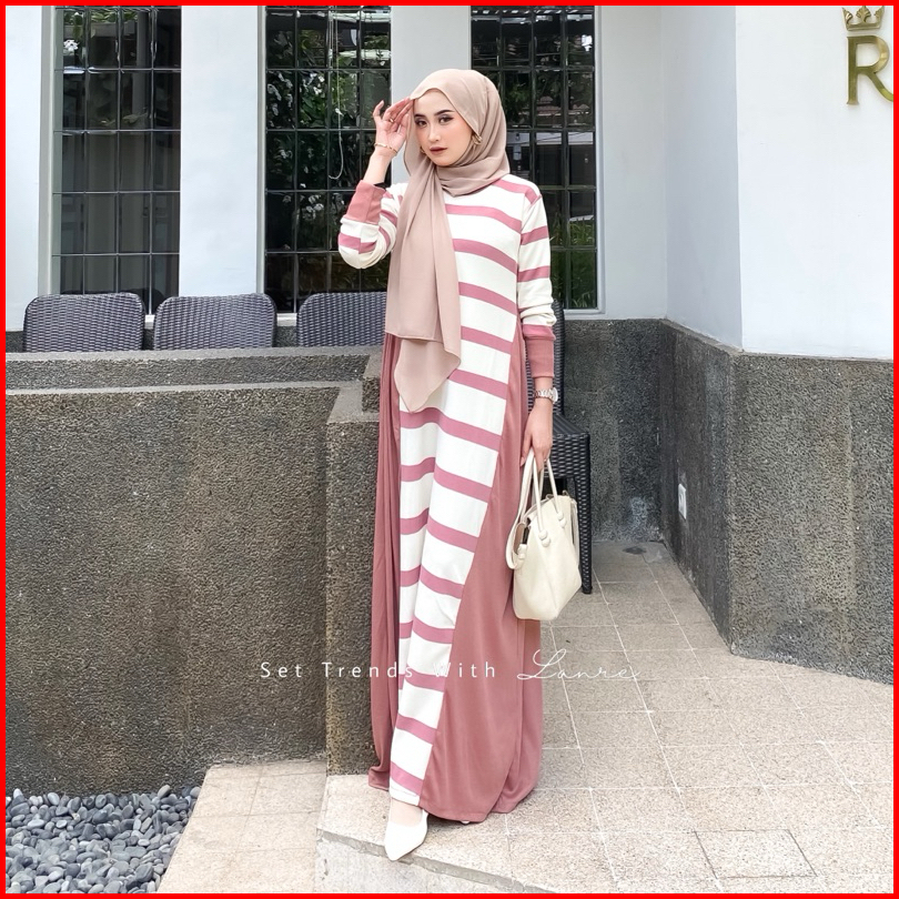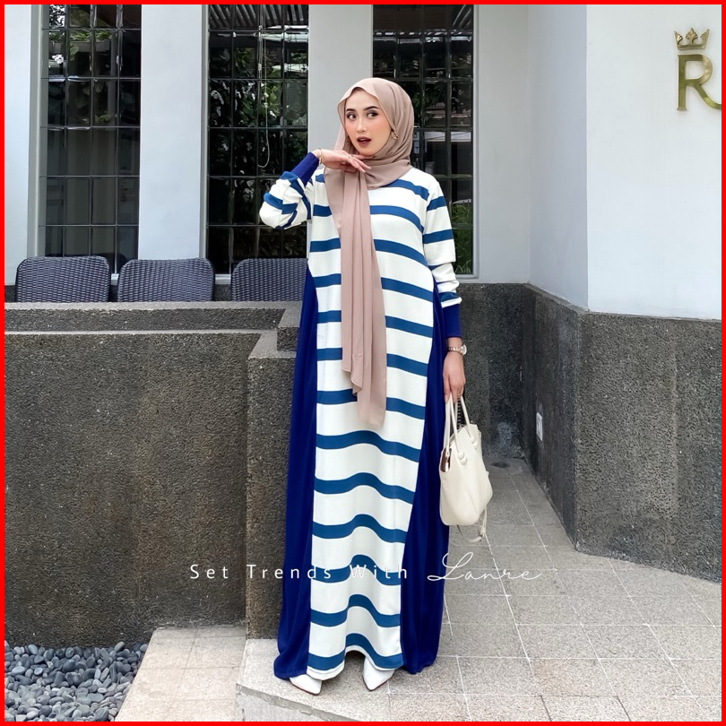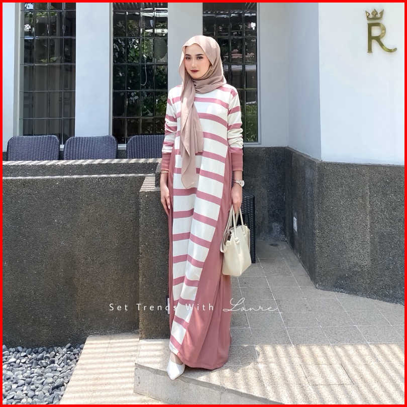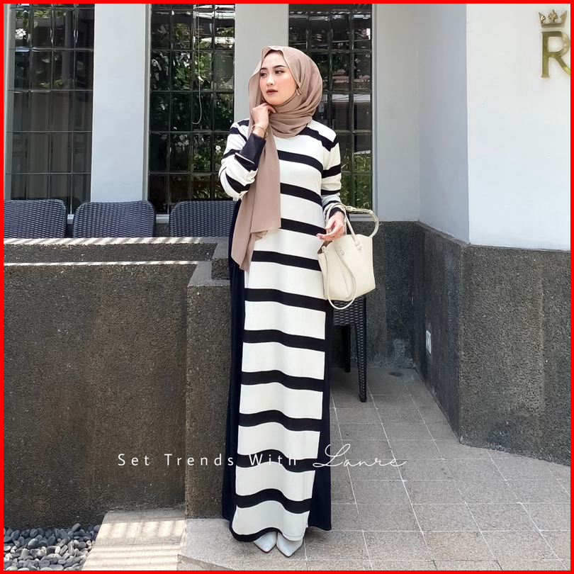 Viona Dress Motif Strip Hitam By Lanre Gamis Dengan Kesan Anggun Berbahan Knit Lembut