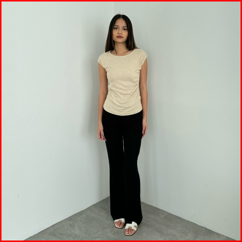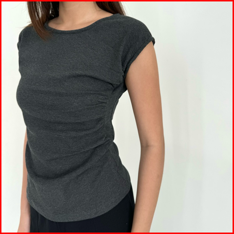 Jill Top Atasan Knit Wanita Lengan Pendek Rample Ruched Pleated Basic Korean Top Summer Baju Knit Kerut Rib Wanita Short