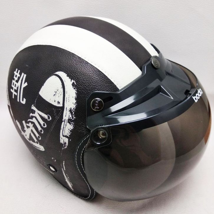 Helm bogo Retro Kulit dan Glossy Motif Sepatu Hitam Putih Kaca Bubble halfface TERLARIS