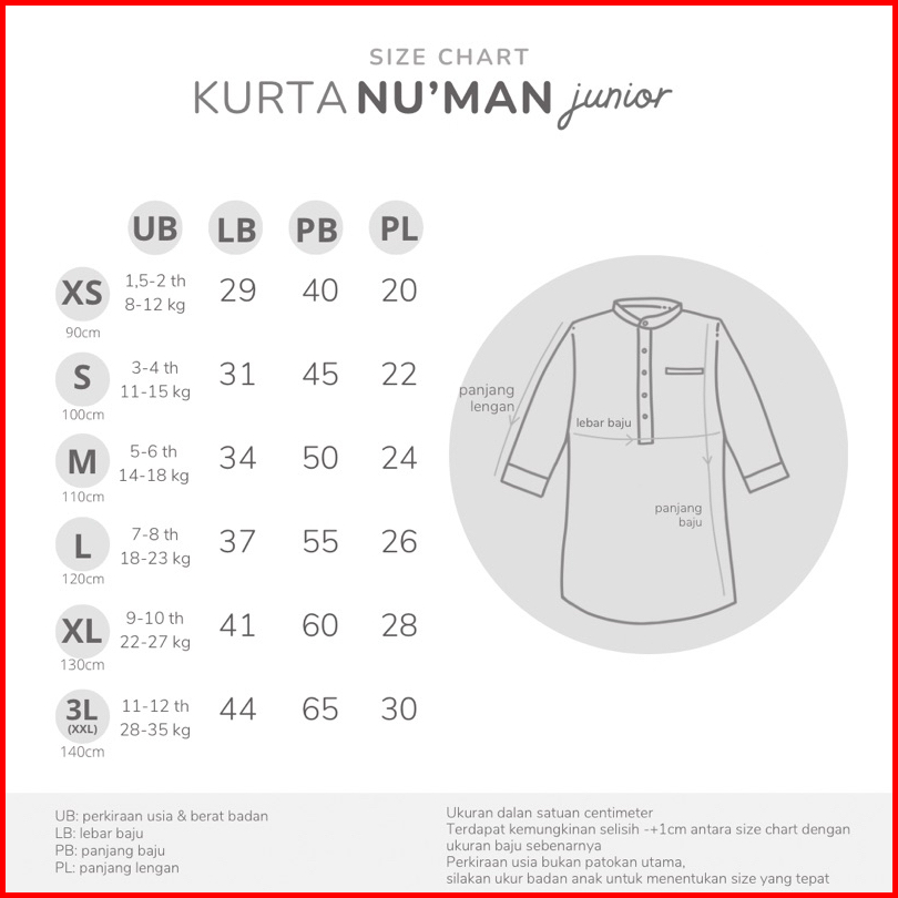 Size 1 (XS anak), Size 3 (S anak), Size 5 (M anak), Size 7 (L anak), Size 9 (XL anak), Size 11 (XXL/3Lanak)