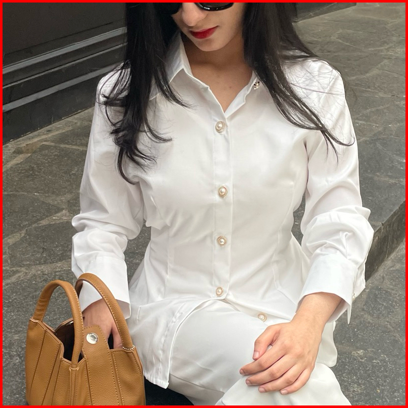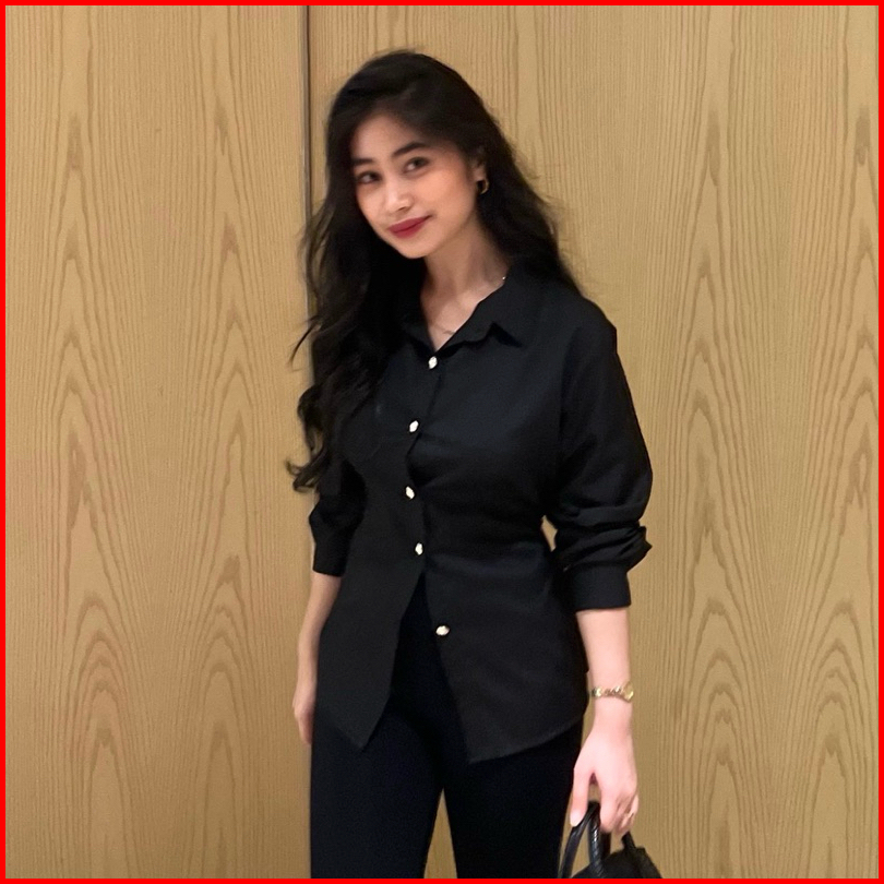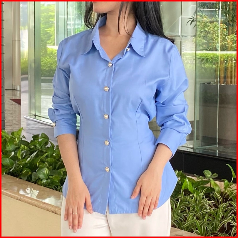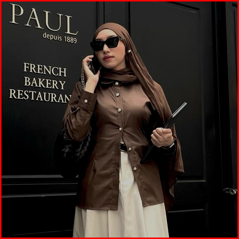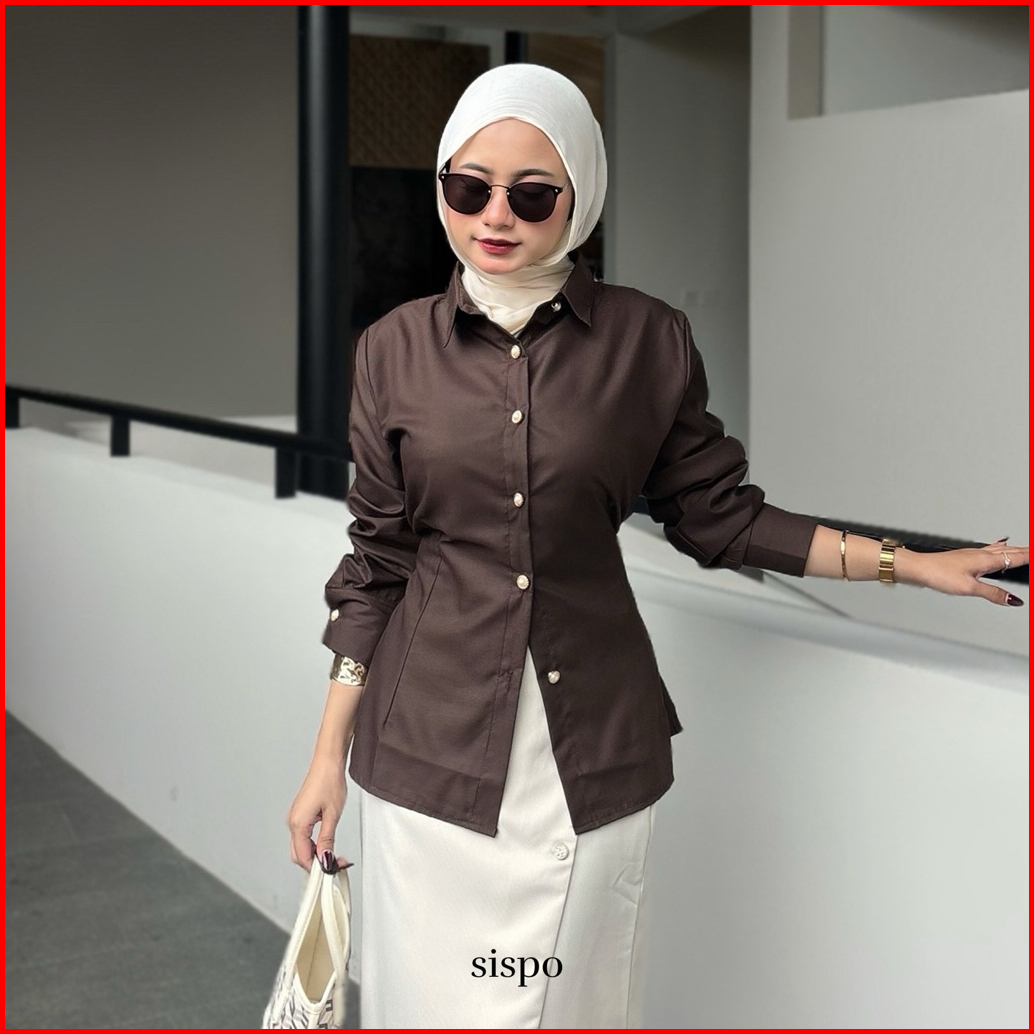 Sispo Valora Top Kemeja Atasan Wanita Brown Fitted Shirt Coklat Mahogany Kantor Kerja Polos Putih Katun Lengan Panjang H