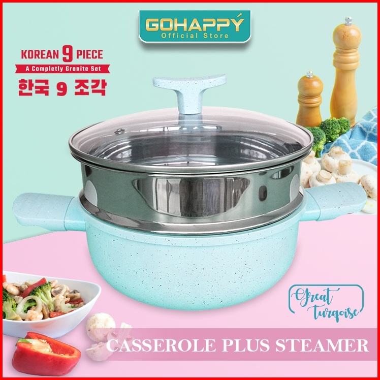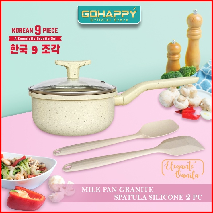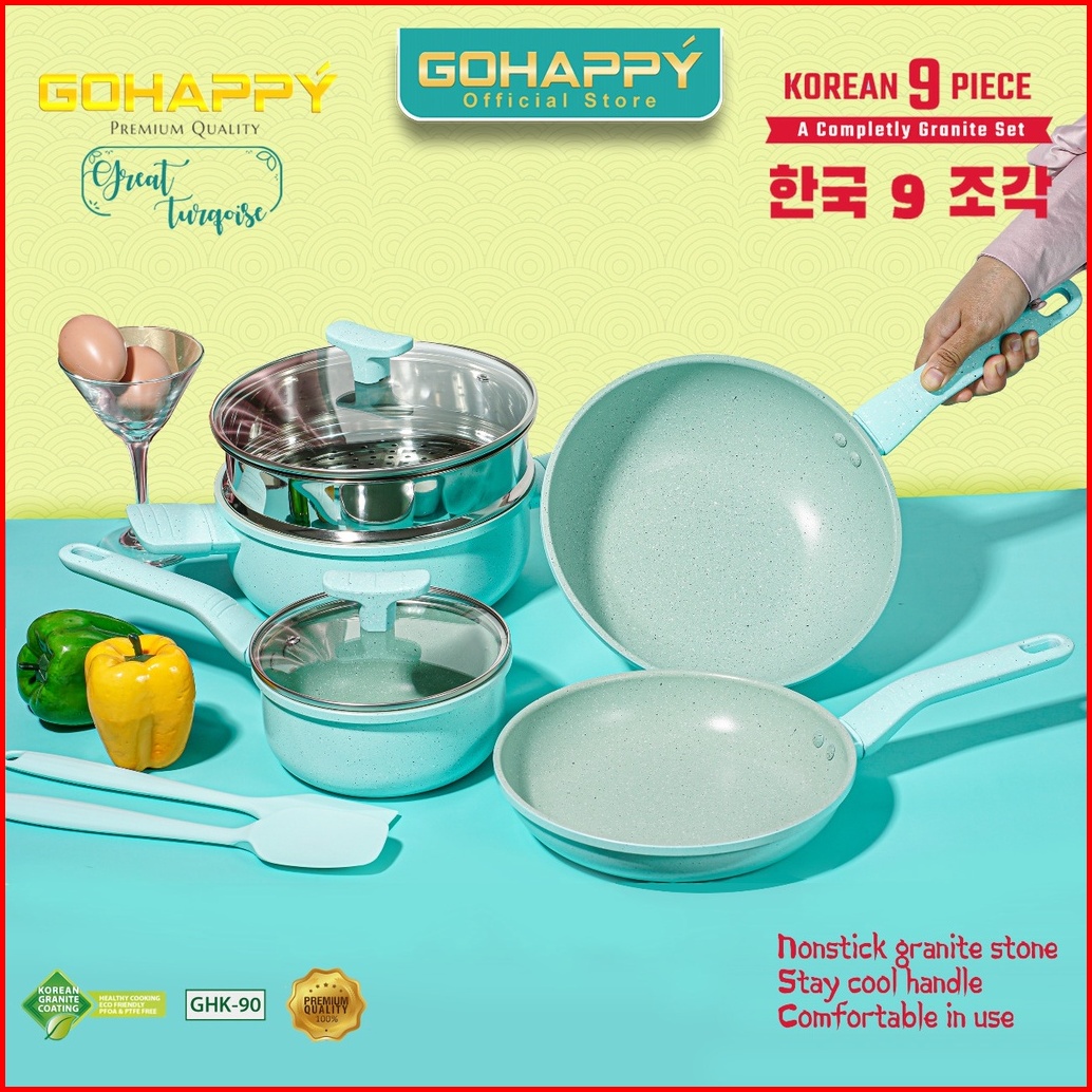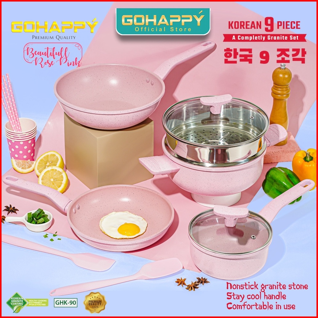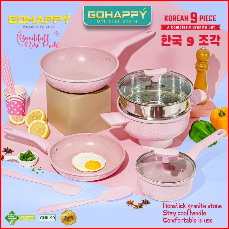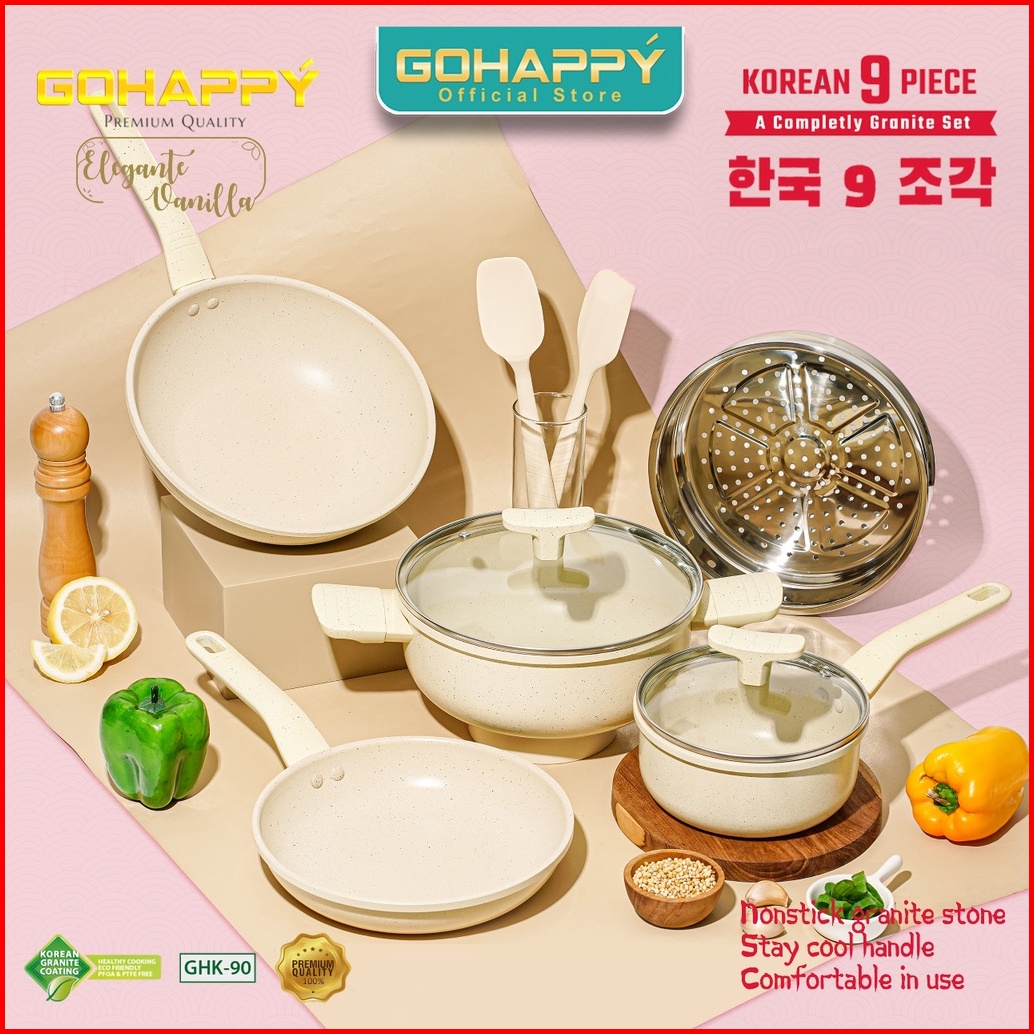 Gohappy Panci Set Korean 9 Piece - Vanilla Granite Cookware 9pc - Dutch Oven Wok Fry Sauce Pan