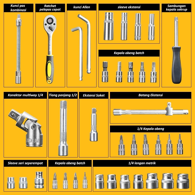 KEELAT 53Pcs Kunci Shock Socket Set 1/4"【60HRC】CR-V Socket Wrench Tool Kit Lengkap Set Sok Motor Extention Bar Chrome Va