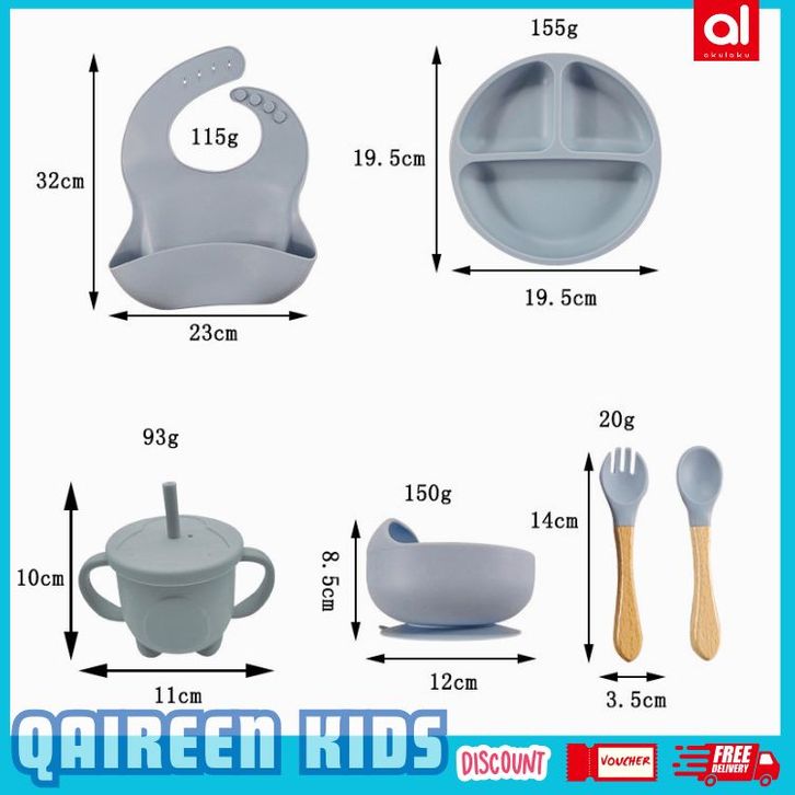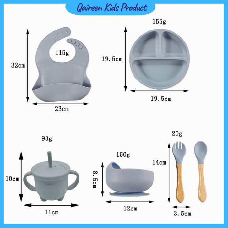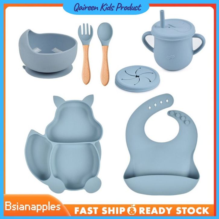 [Mall] 8 Buah Mangkok Piring Sendok Garpu Bib Cup Silikon Bayi Set Anak-anak Non Slip Peralatan Makan Bayi Import