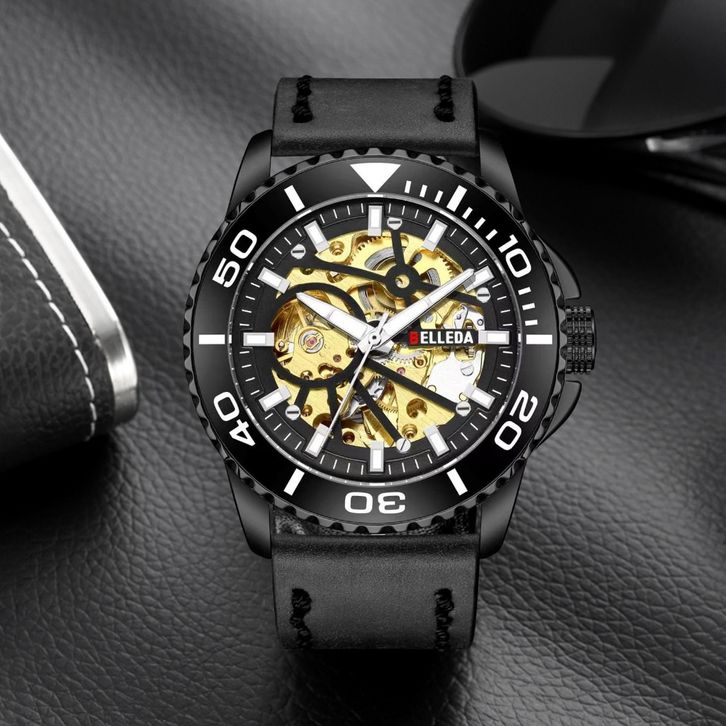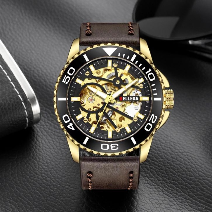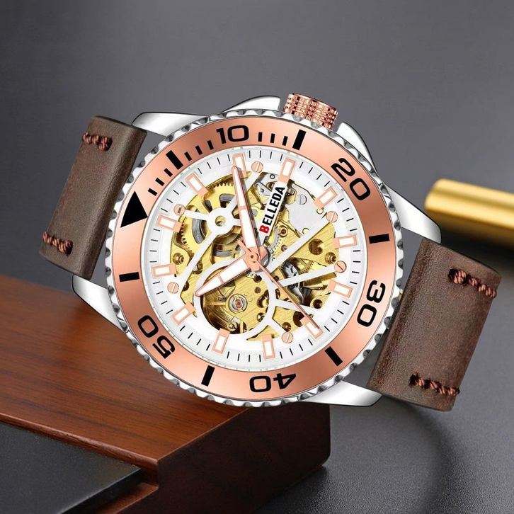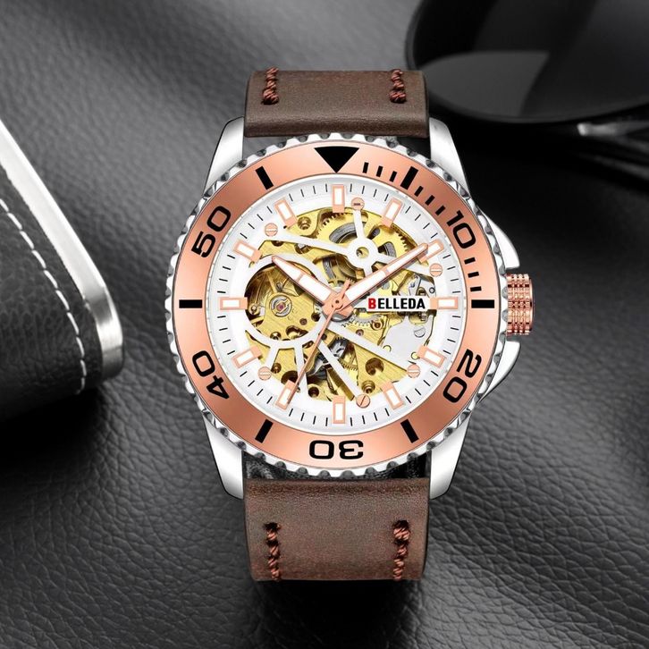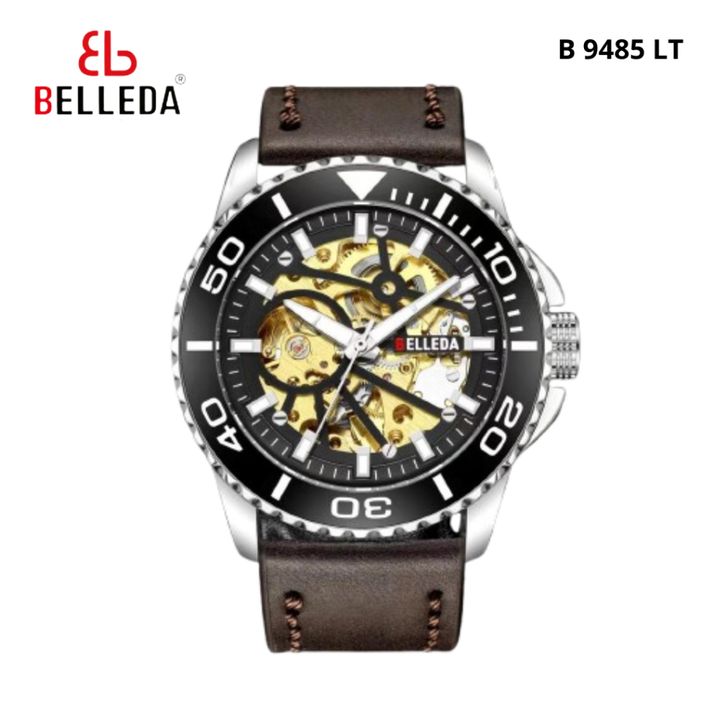 TERLARIS JAM TANGAN PRIA BELLEDA 9485 TALI KULIT MESIN OTOMATIS SAKELTON WATCH ANTI AIR 30 METER