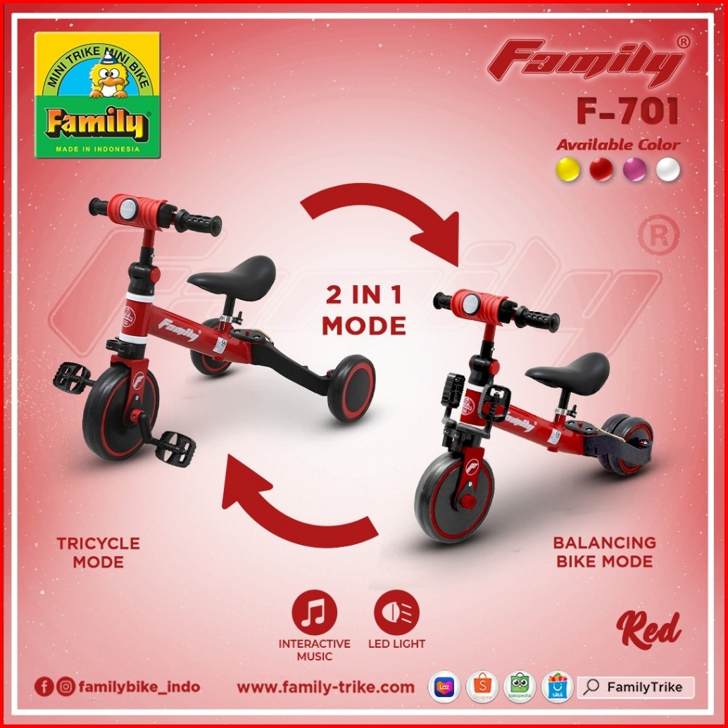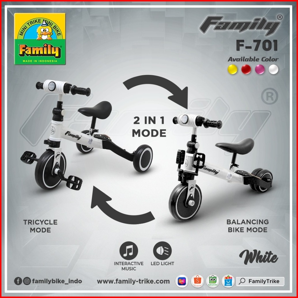 Family Balance Bike F-701 Sepeda Anak Roda 3 Sepeda Keseimbangan Anak Tricycle Stroller Anak 2 In 1 Lampu Dan Musik Sni