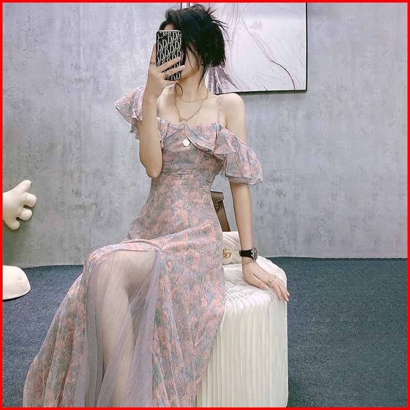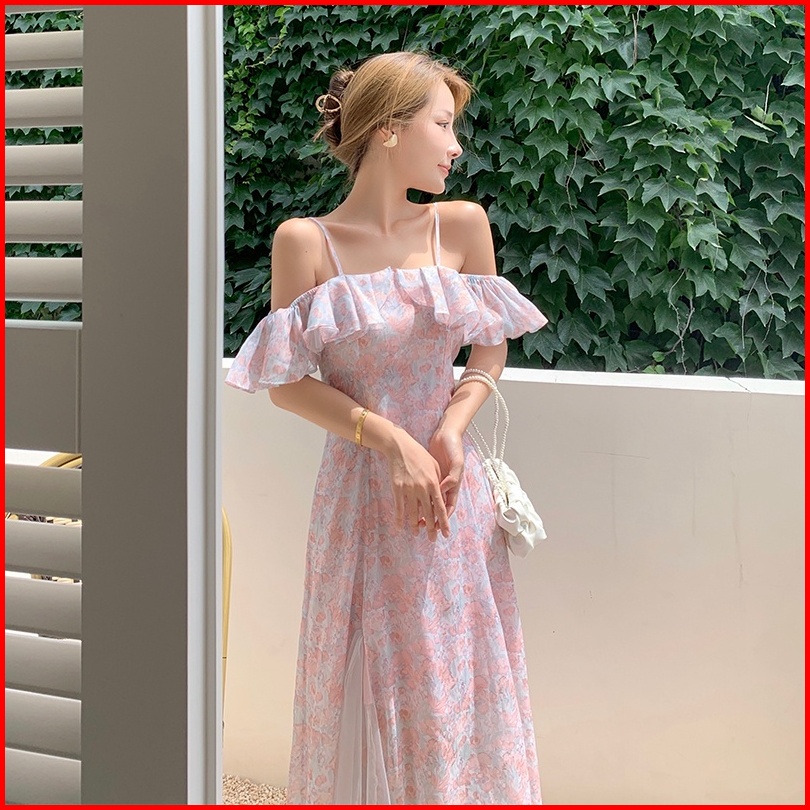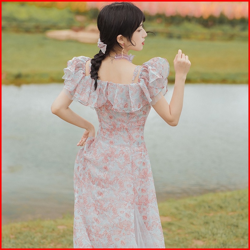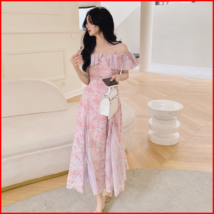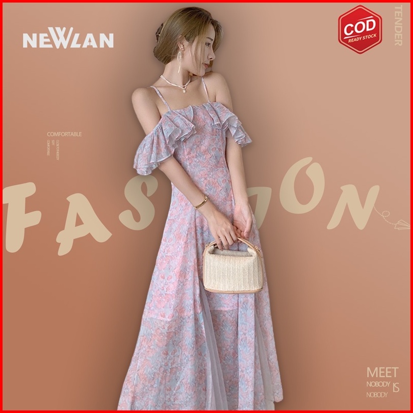 Newlan Qz047 Gaun Panjang Pantai Fairy Dress Wanita Seksi Foral Dress Korea Style Wanita Baru Perancis Santai Pink Dress