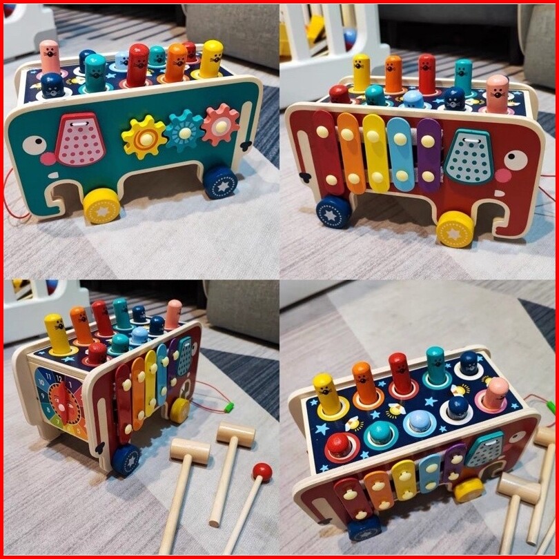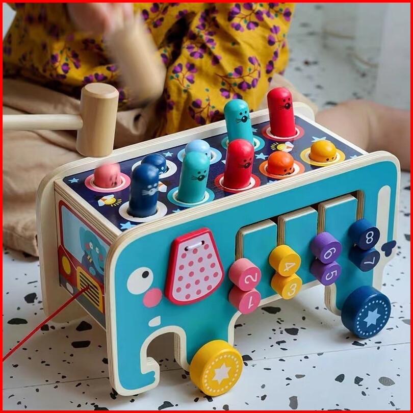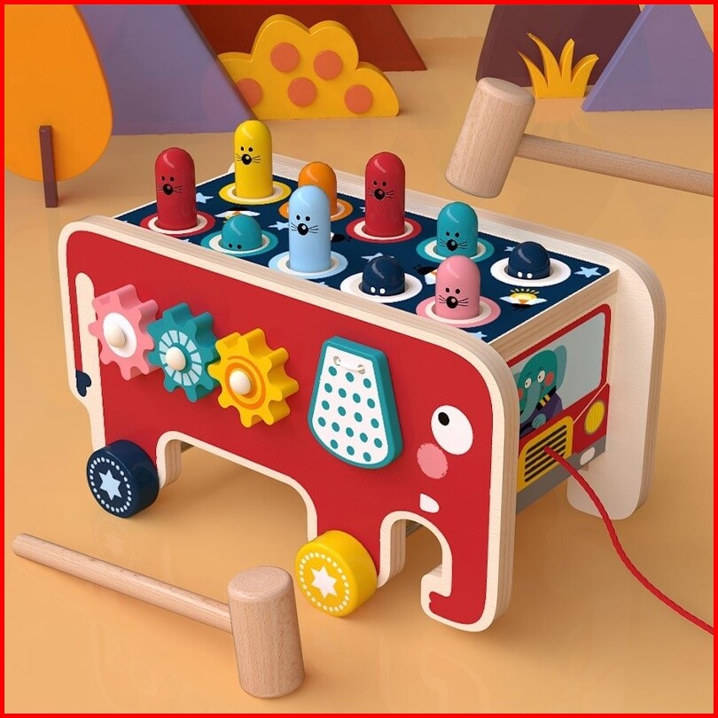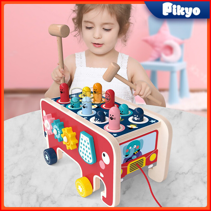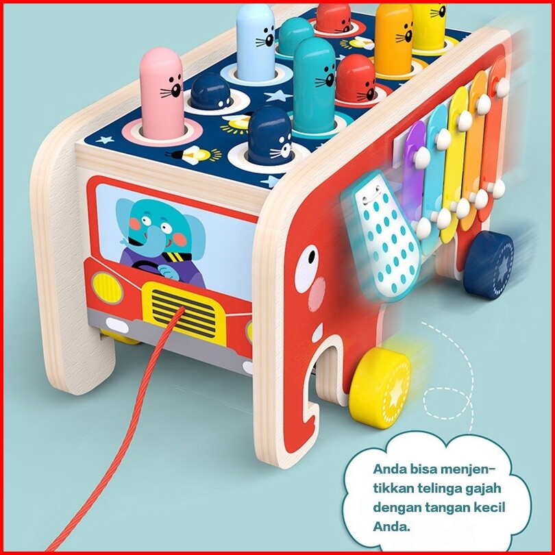Pikyo Hammering Elephant Knock Toys Hamster Wooden Hammer Pull Push Truck Mainan Pukul Pukulan Bentuk Gajah Mainan Eduka