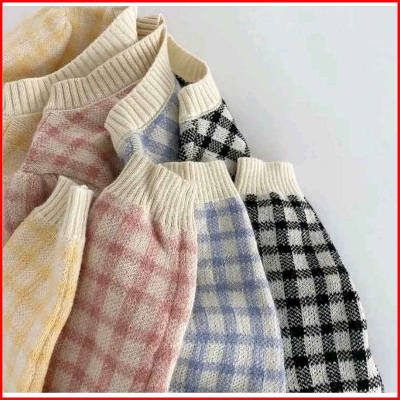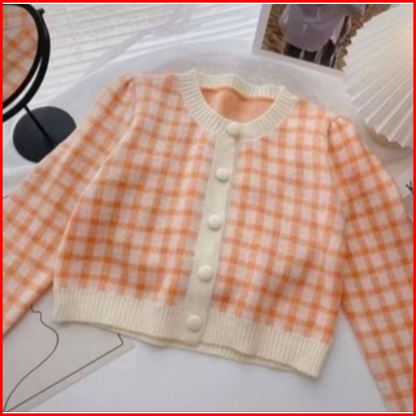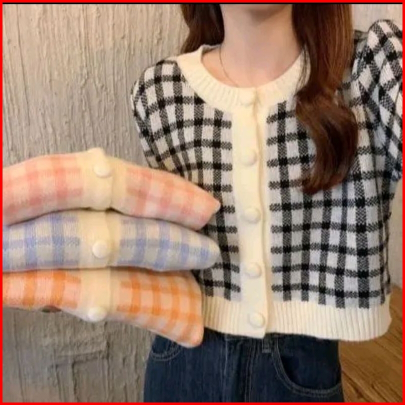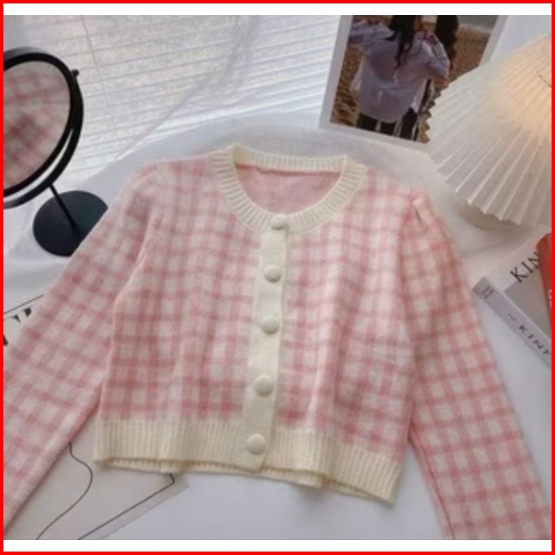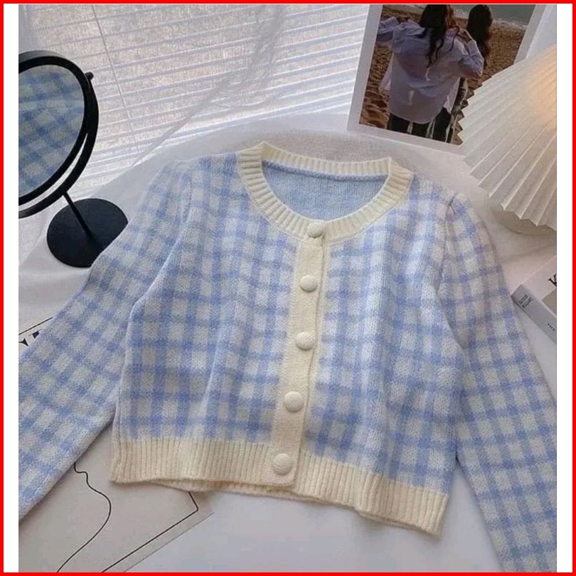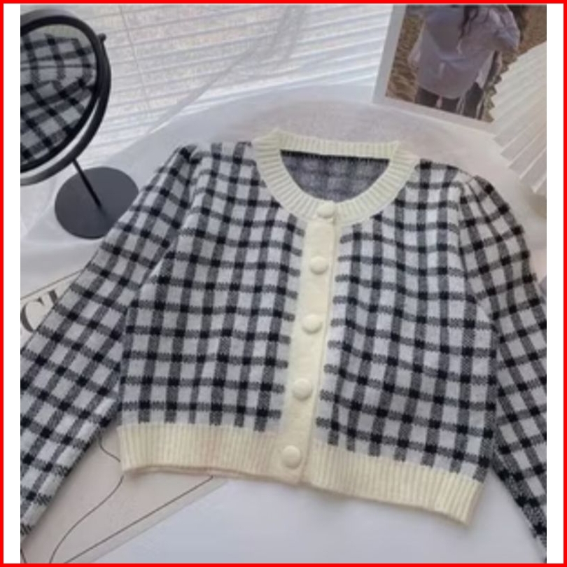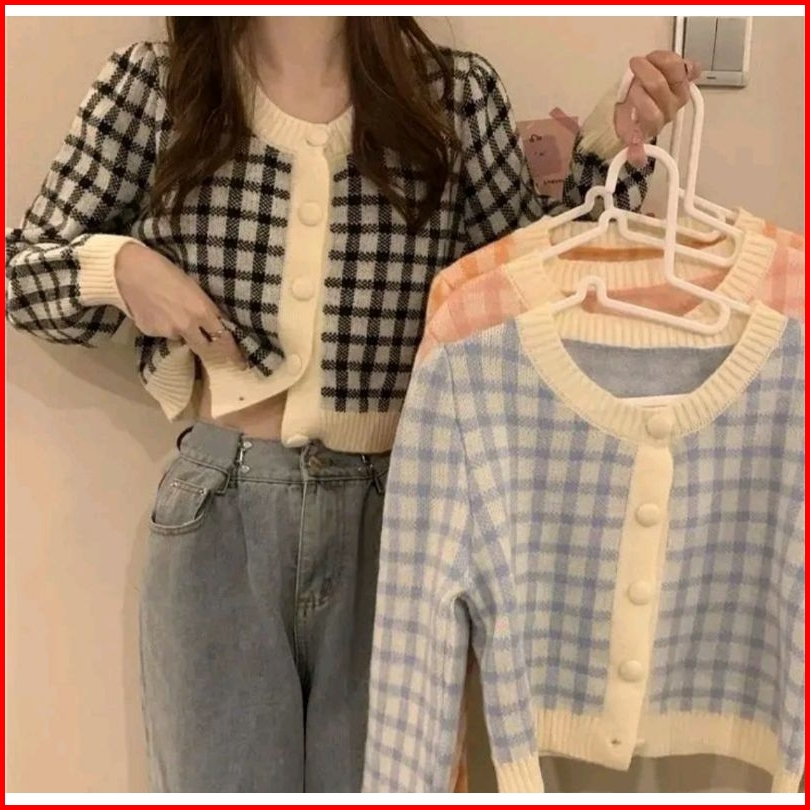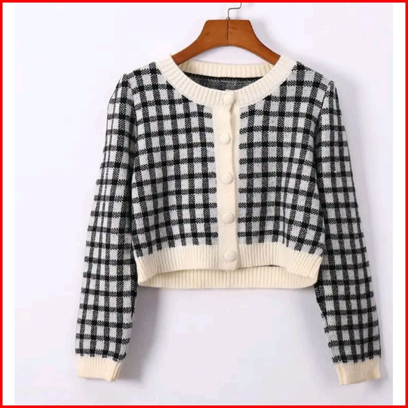 Cardigan Crop Rajut Snowy- Crop Cardi Knit Motif Kotak Kotak