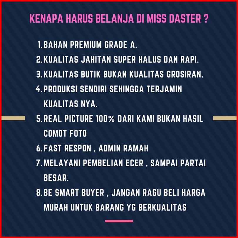 PLUM, LIME, KUNING AYU, DUSTY ROSE, KHAKI, MUSTARD, MILO, NAVY, RANDOM, BS/RIJECT, LILAC, TOSCA, SALEM TUA, TEMBAGA, ABU ABU, AVOCADO, HITAM, DENIM, MINT, ARMY MUDA, HIJAU APEL, EMERALD, MAROON, UNGU, TERACOTTA, LILAC TUA, EMERALD MUDA, WARDAH, ARMY TUA, BURGUNDY, MAGENTA, IJO LUMUT, PINK, STONE, COKLAT TUA, TARO, SILVER, TEMBAGA MUDA, MARUN TUA