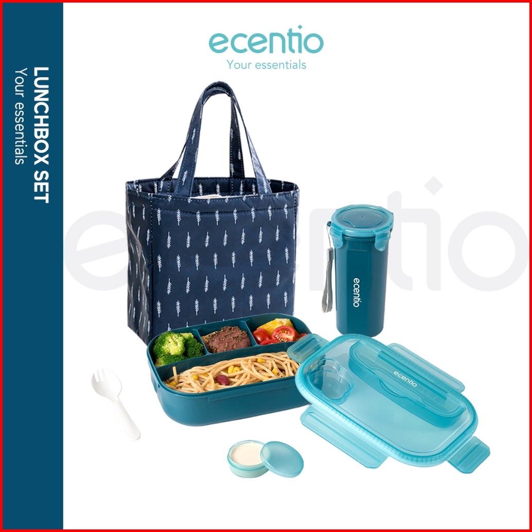 Ecentio Lunch Box Set Kotak Bekal Anti Tumpah Kotak Tempat Bekal 1200ml 500ml Free Sendok Kotak Saus Bpa Free
