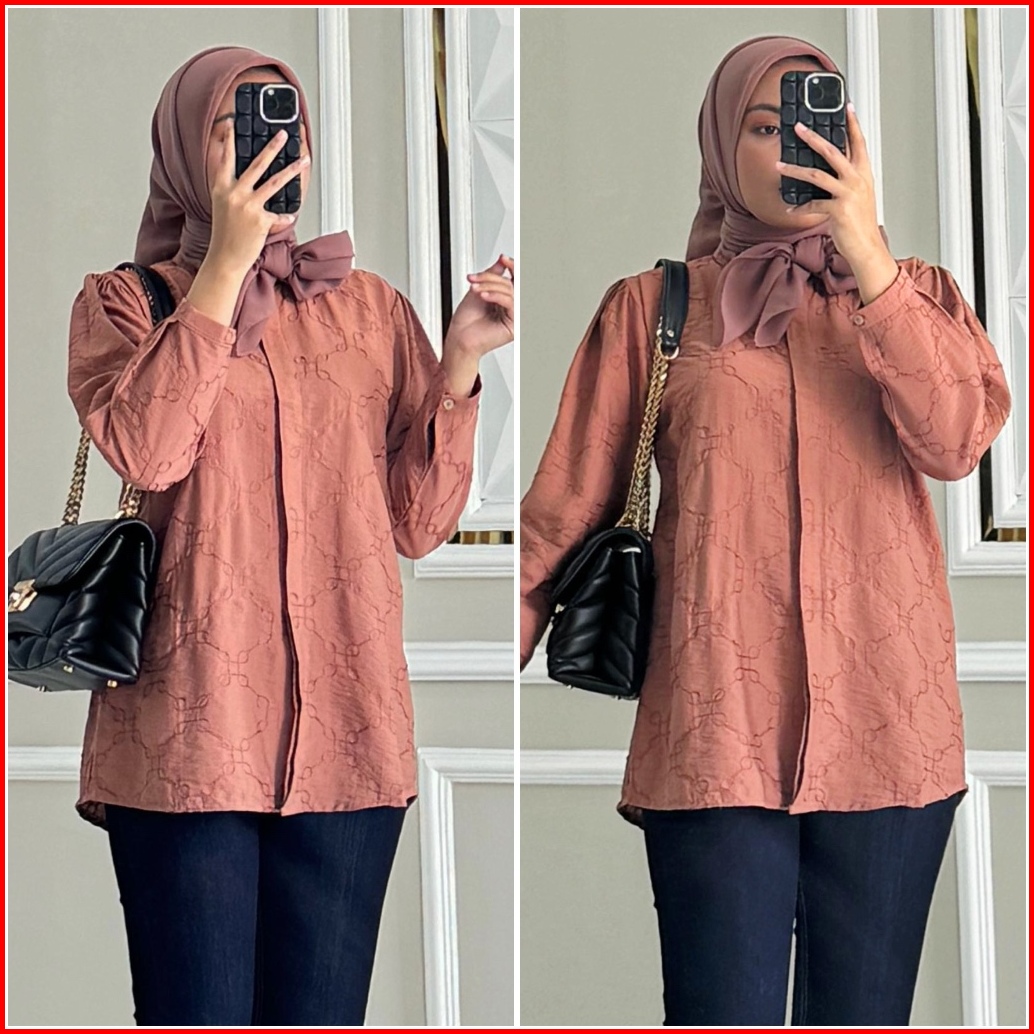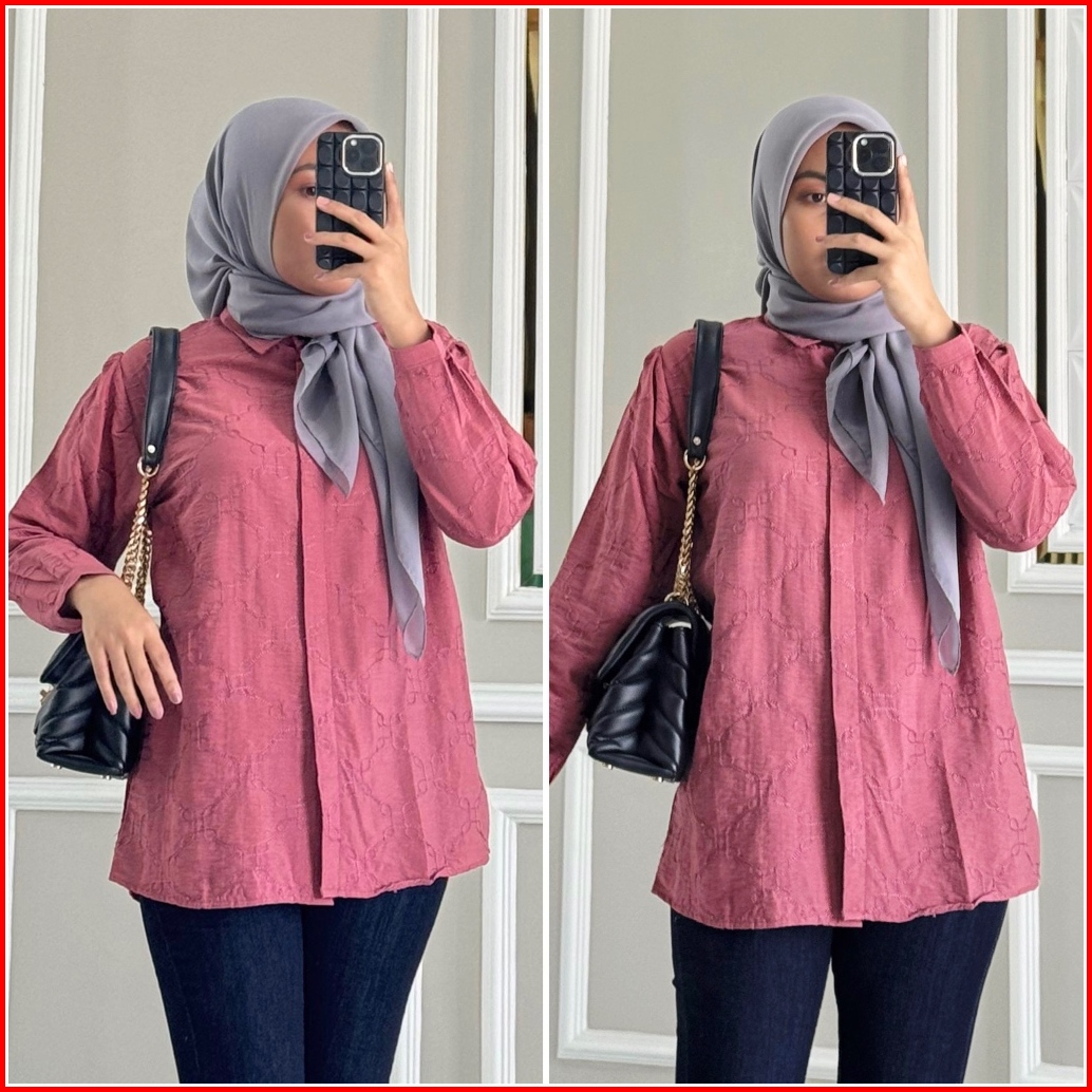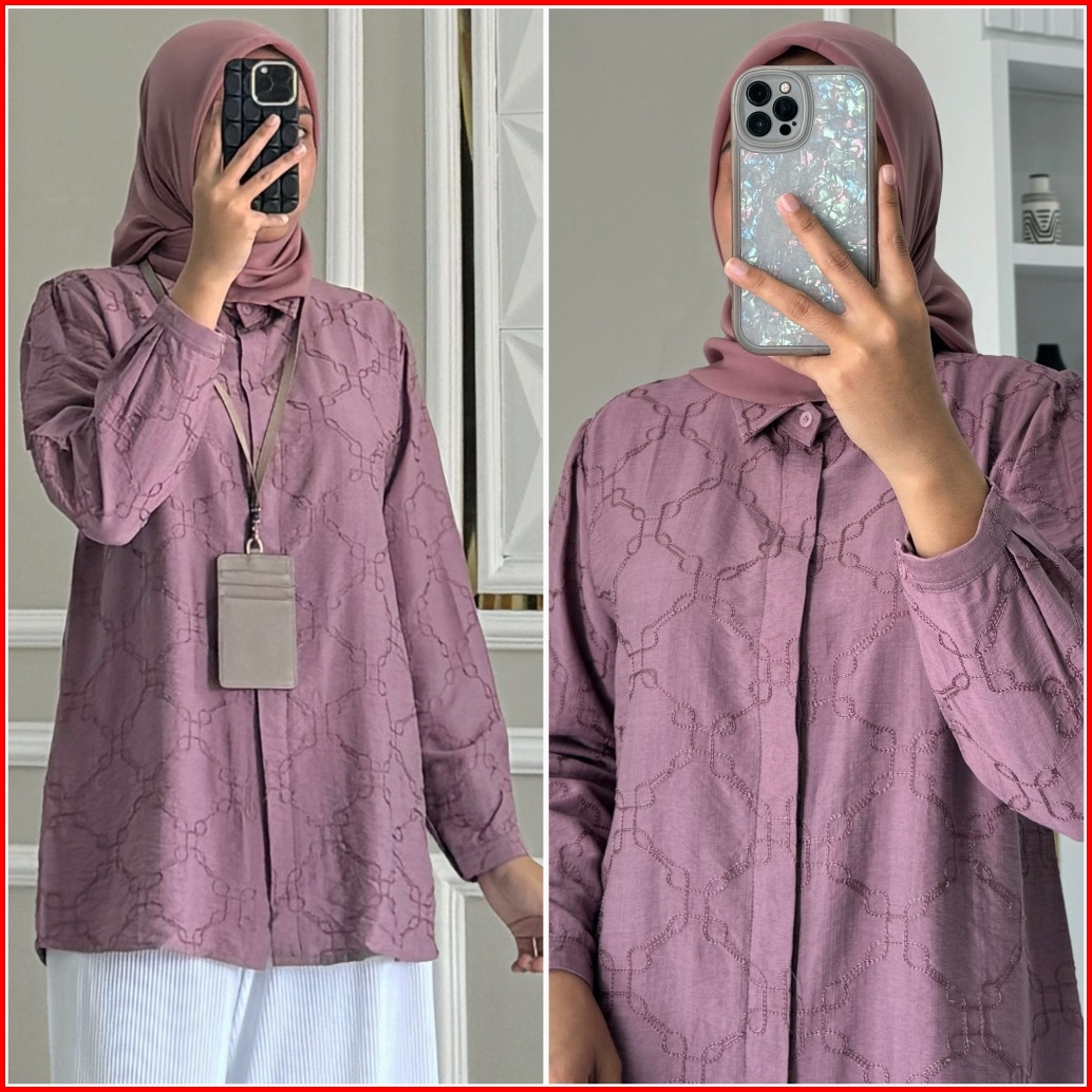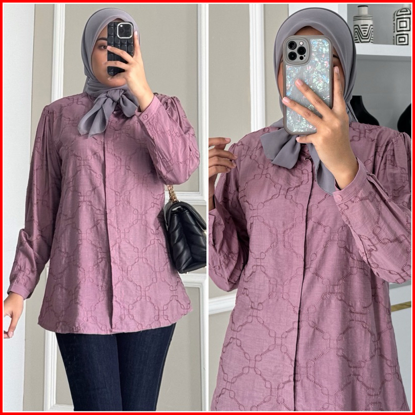 Arzeta Blouse By Zalfa Outfit Baju Atasan Wanita Muslim Blouse Kerja Kuliah Basic Embos Polo Linen Premium Lengan Panjan