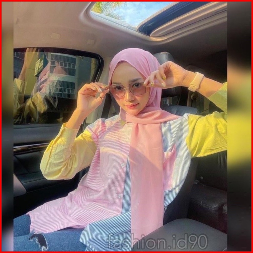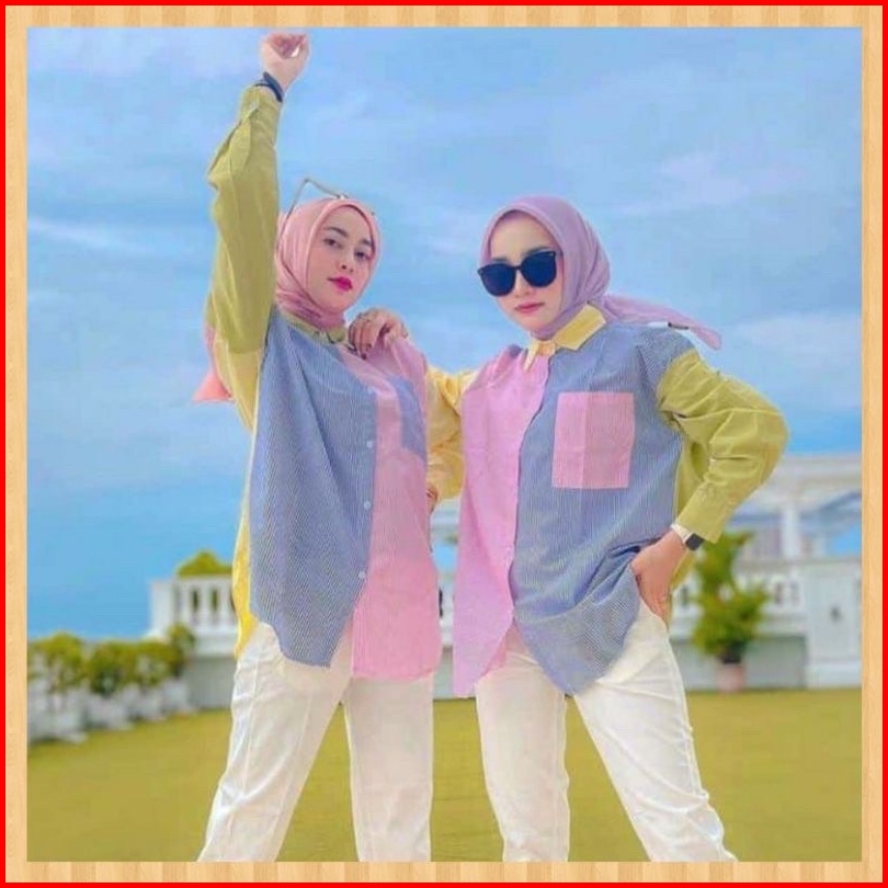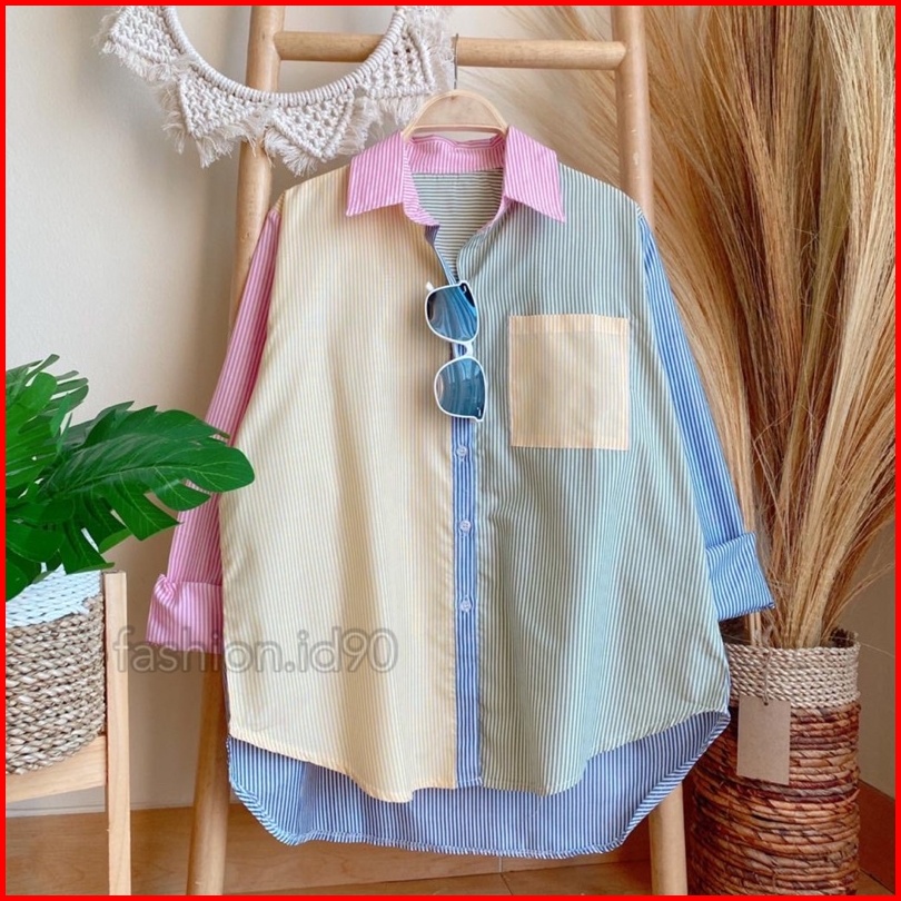 Kemeja Wanita Pastel Pelangi Garis Salur Kombinasi 066 Oversize