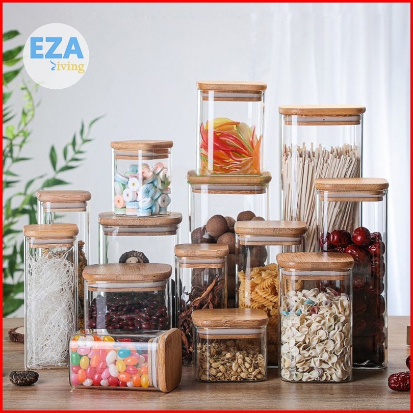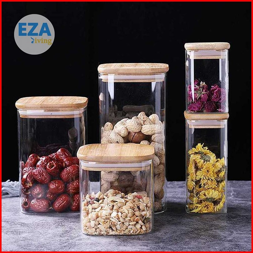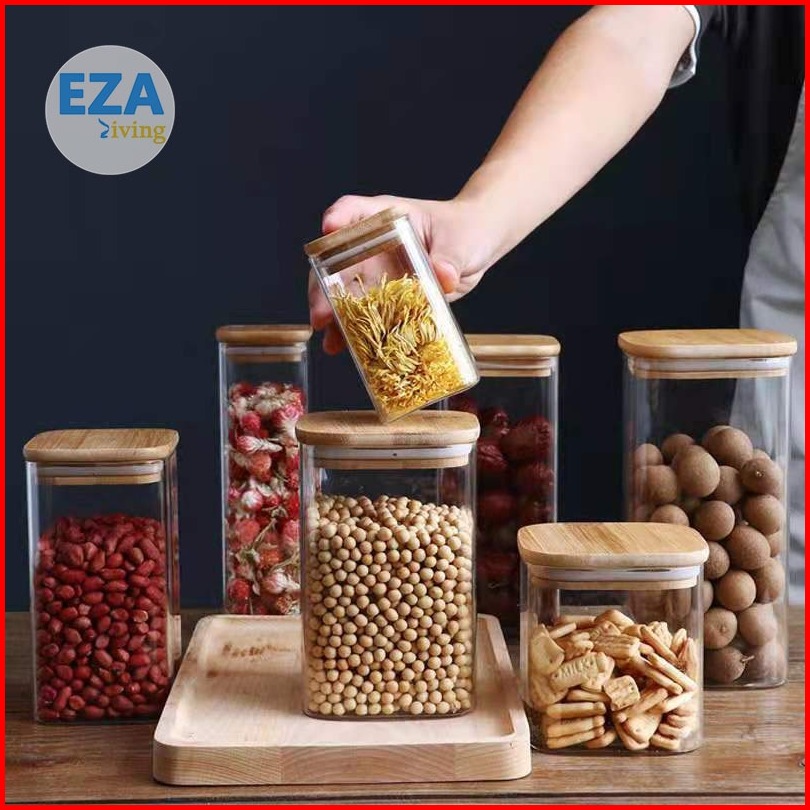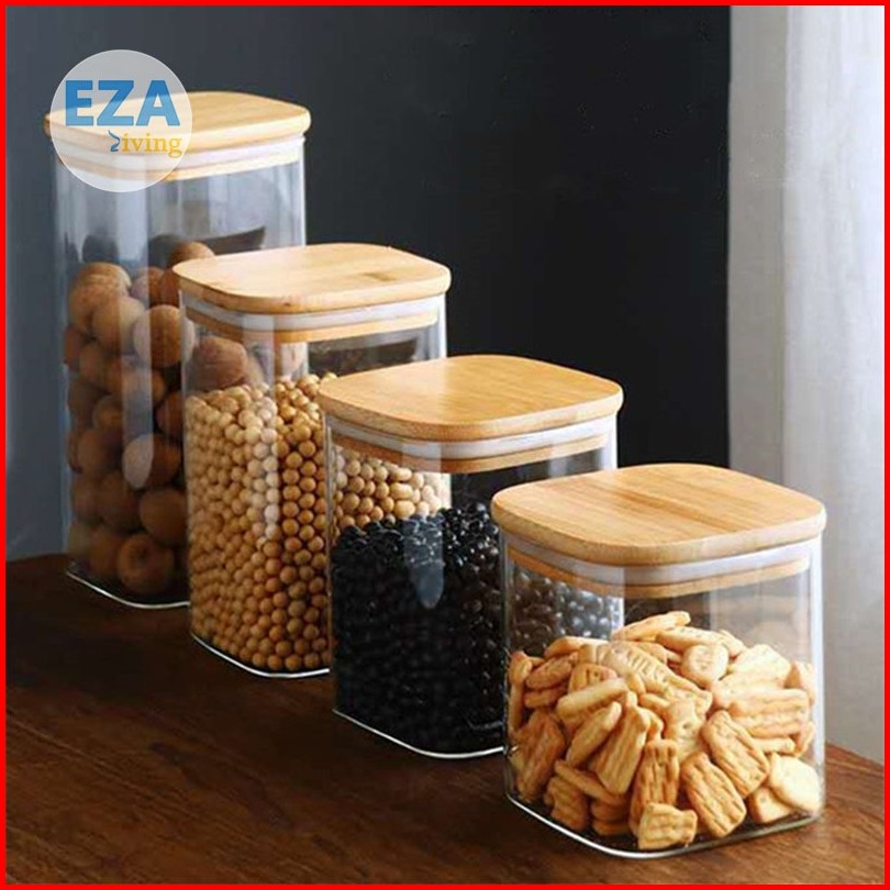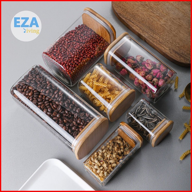 Toples Kaca Aesthetic Tutup Kayu Penyimpanan Makanan Bening Transparan Kedap Udara Anti Mlempem Desain Kotak Hc1019