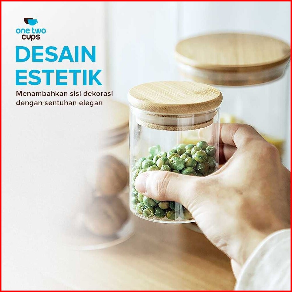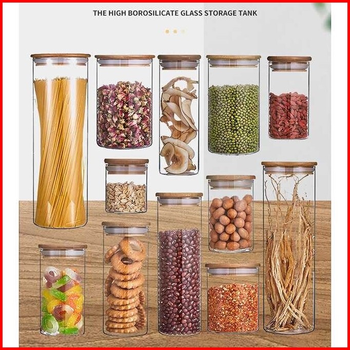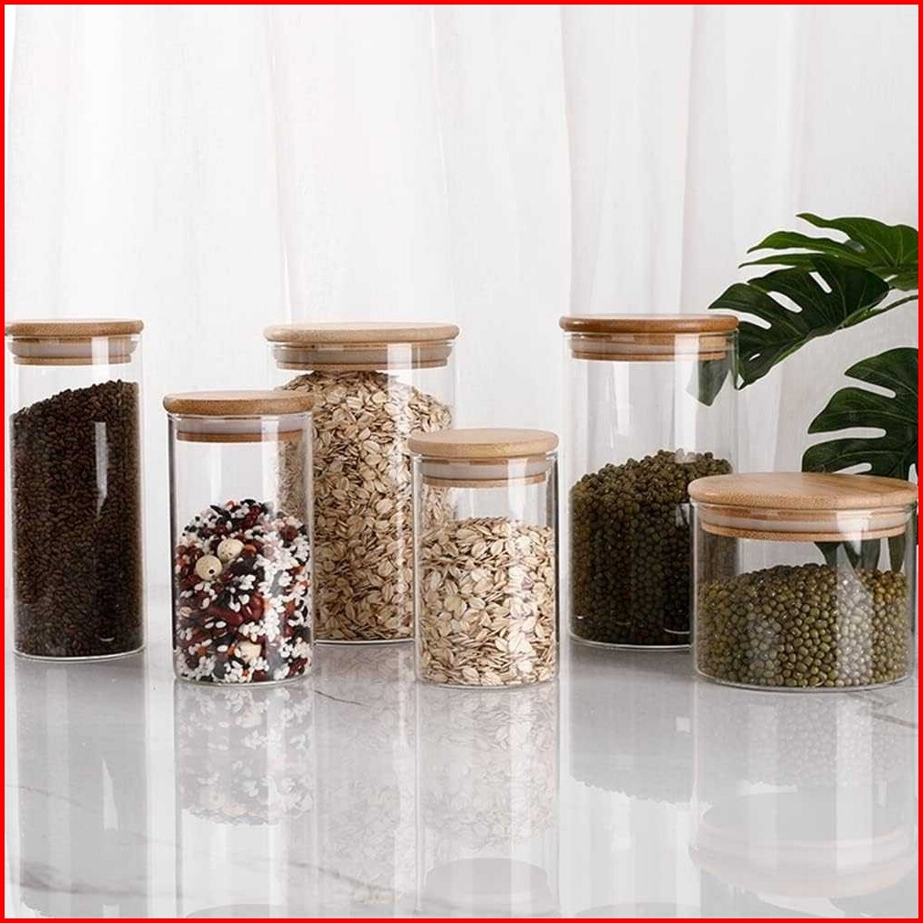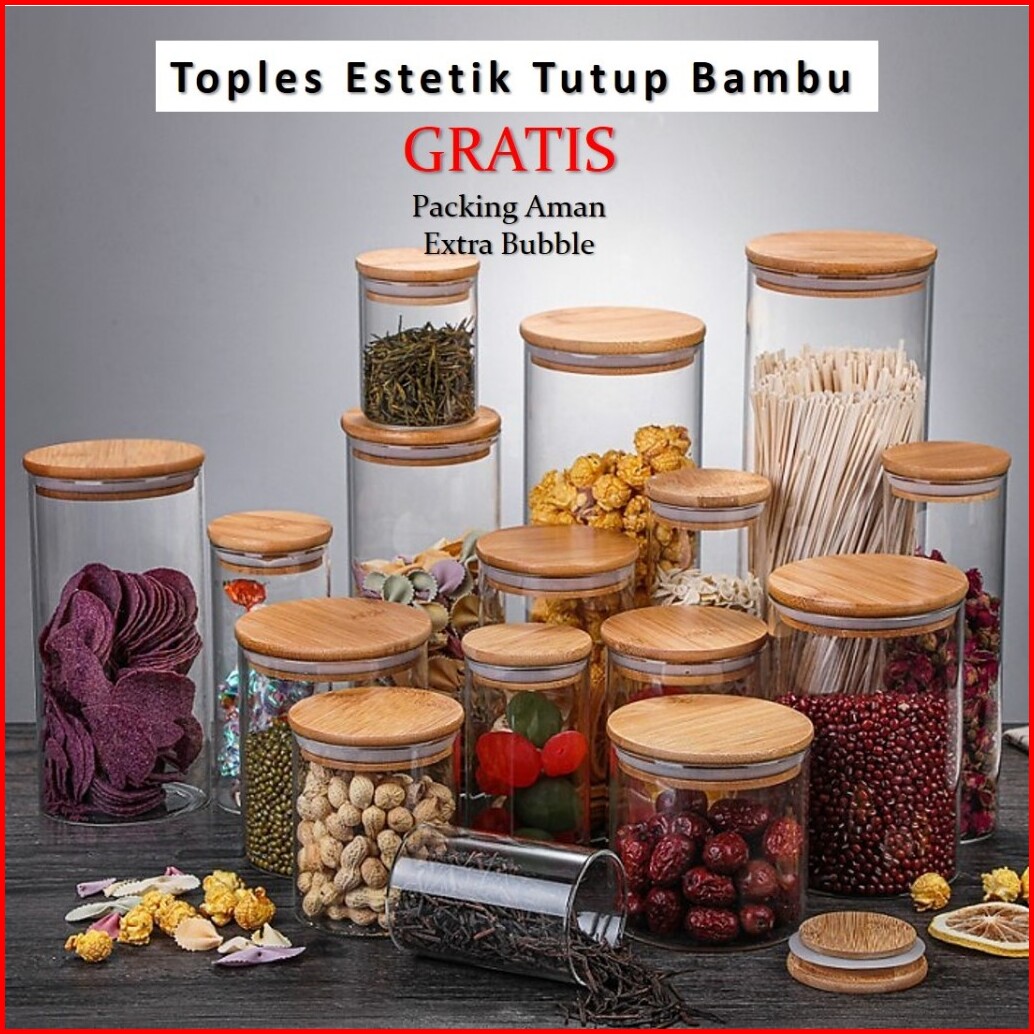Toples Estetik Tempat Penyimpanan Makanan Bumbu Dapur Garam Lada Dll Toples Kaca Transparan Tutup Kayu Toples Kaca Tutup
