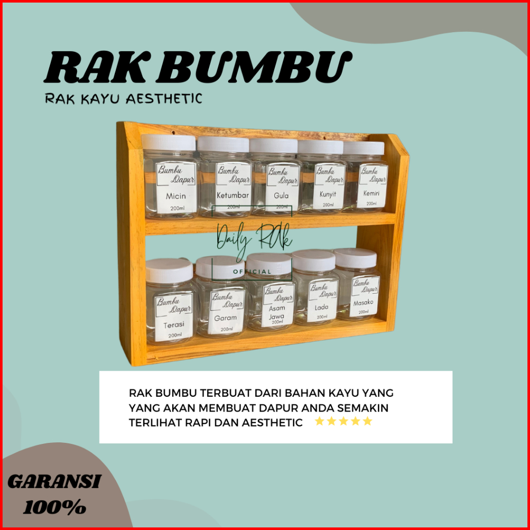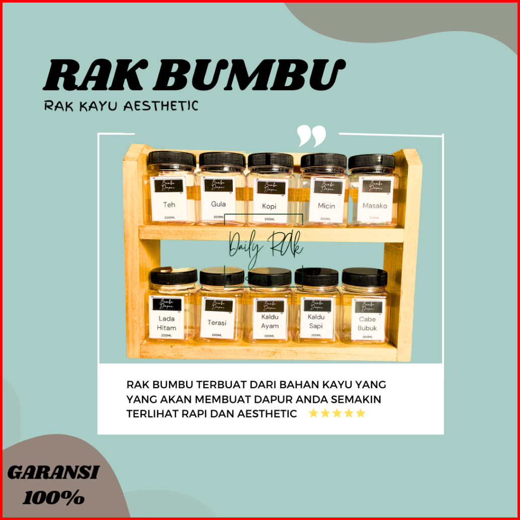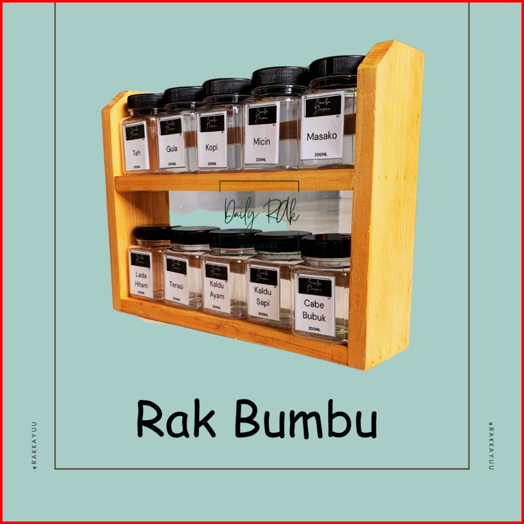 Rak Bumbu Dapur Kayu 2 Susun Free 10 Toples Dan Stiker Variasi Toples Hitam