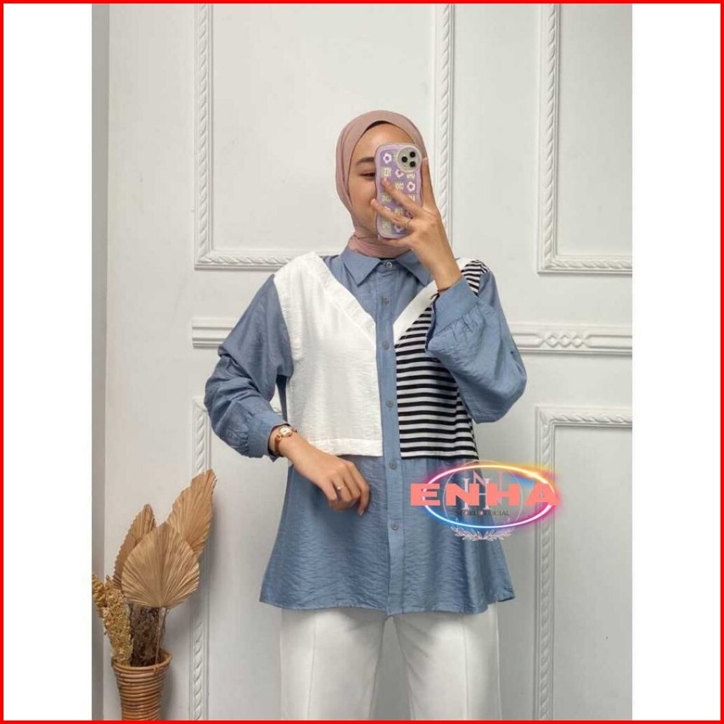 Silvi Kemeja Pollo Linen Kombinasi Rompi Salur Atasan Formal Casual Wanita