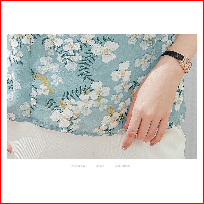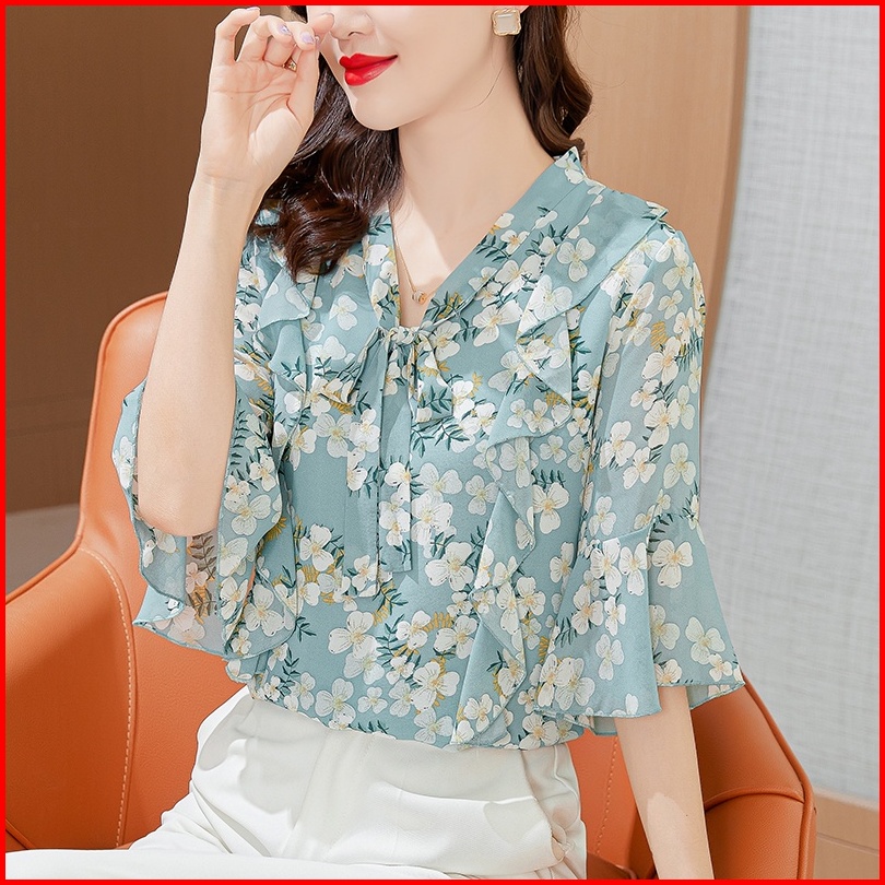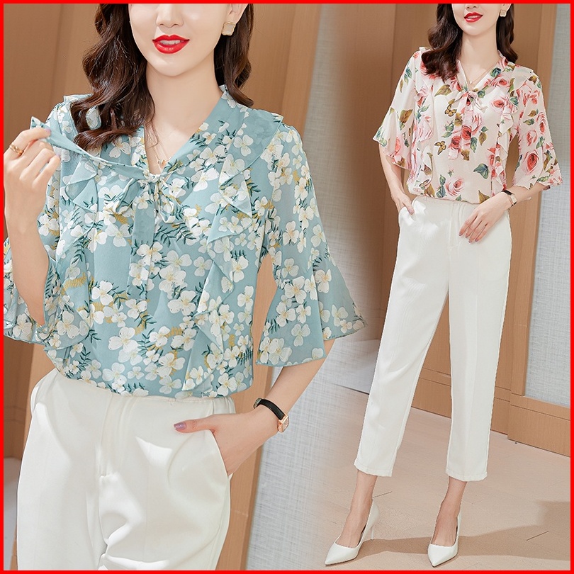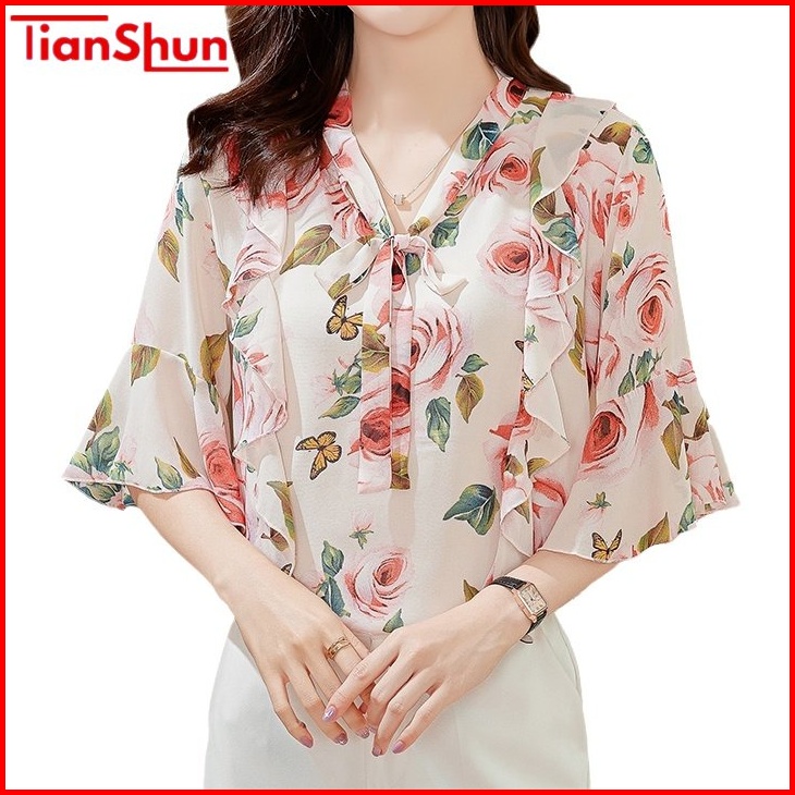 Tianshun Fashion Korean Chiffon Floral 3 4 Sleeve Shirts Pink Blue Women Blouse Tops Pakaian Serban