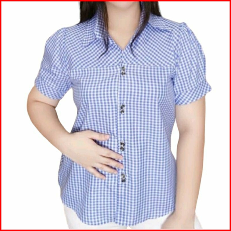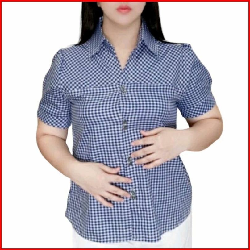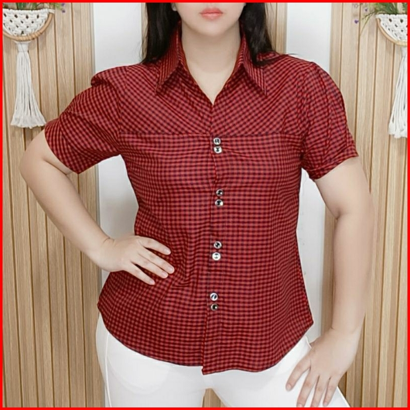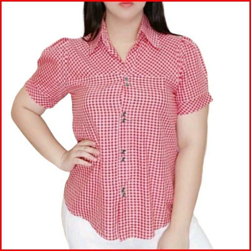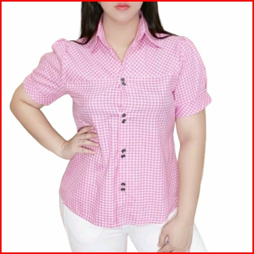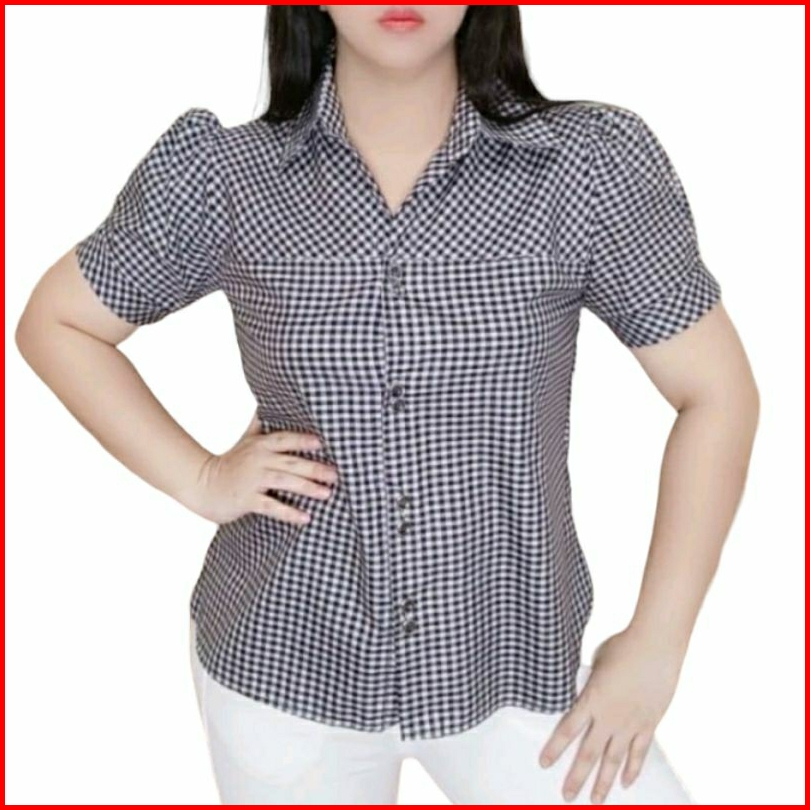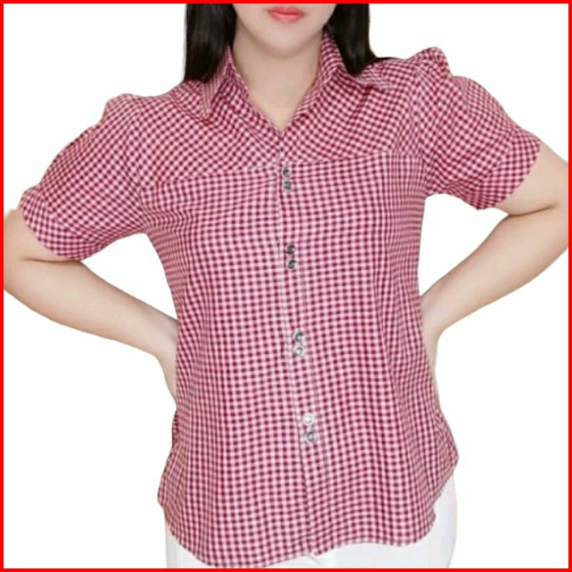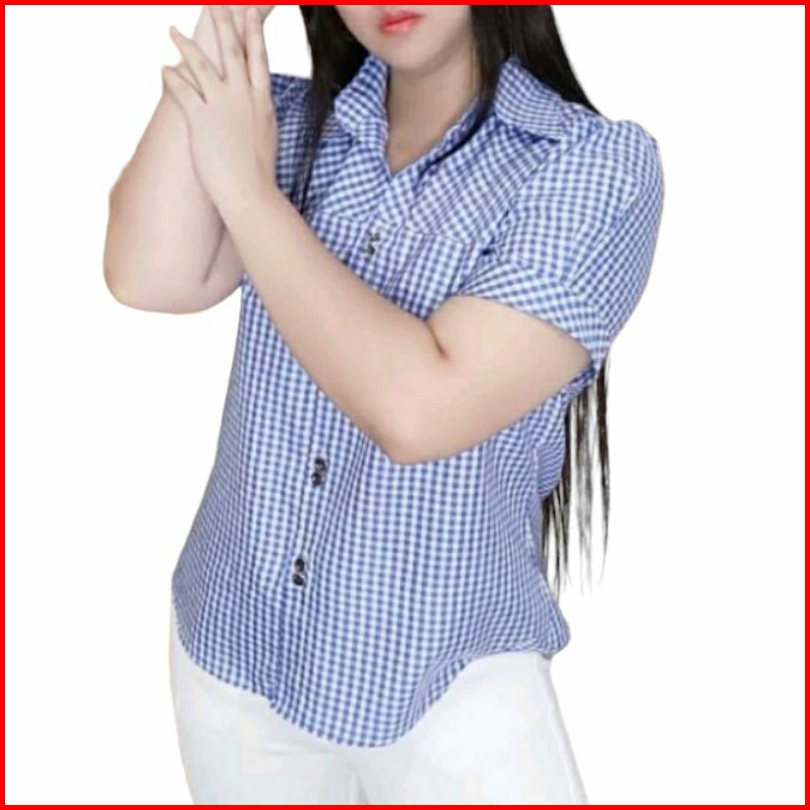 Kemeja Jumbo Motif Kotak Catur Kasual Wanita Bahan Katun Kotak Lengan Pendek Kerah Kemeja