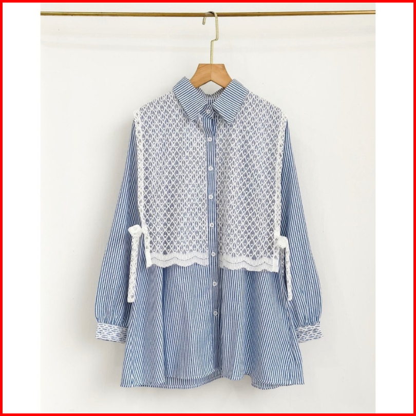 Atasan Wanita Arumi Blouse Salur Kombinasi Brukat Kemeja Tangan Panjang Casual Kekinian