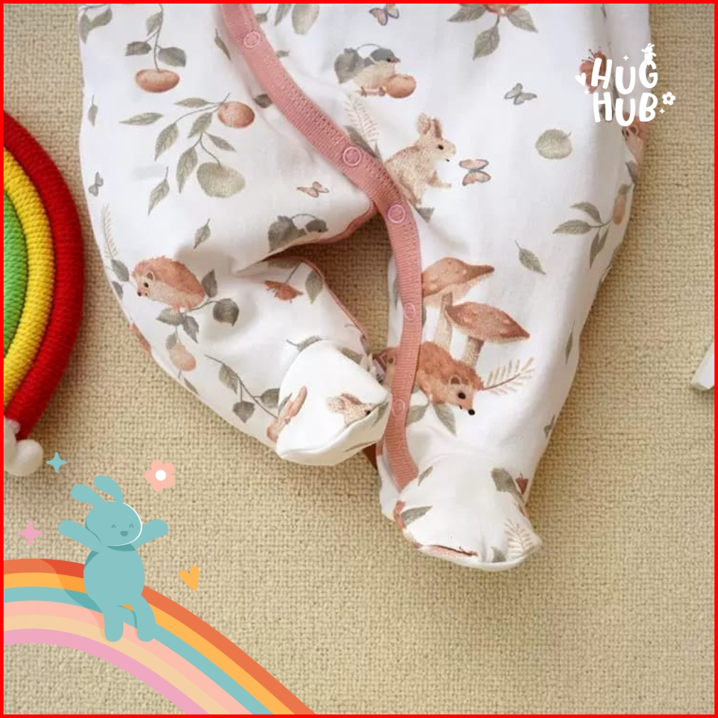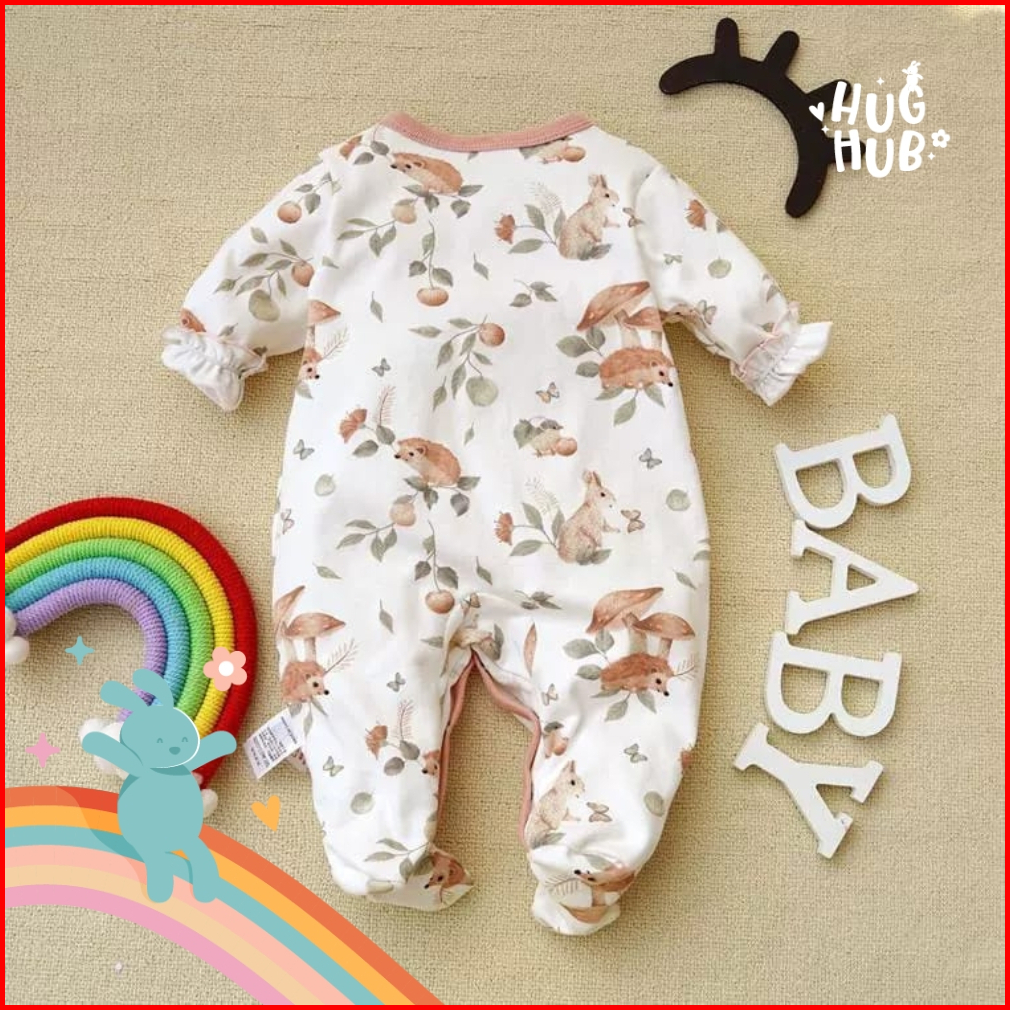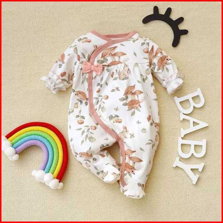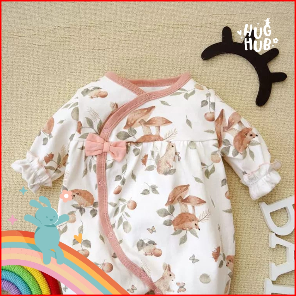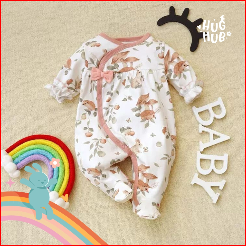 Hughub Baju Jumper Bayi Cewe Motif Pita Pink Jumpsuit Bayi Usia 0-12 Bulan Katun 100 Persen