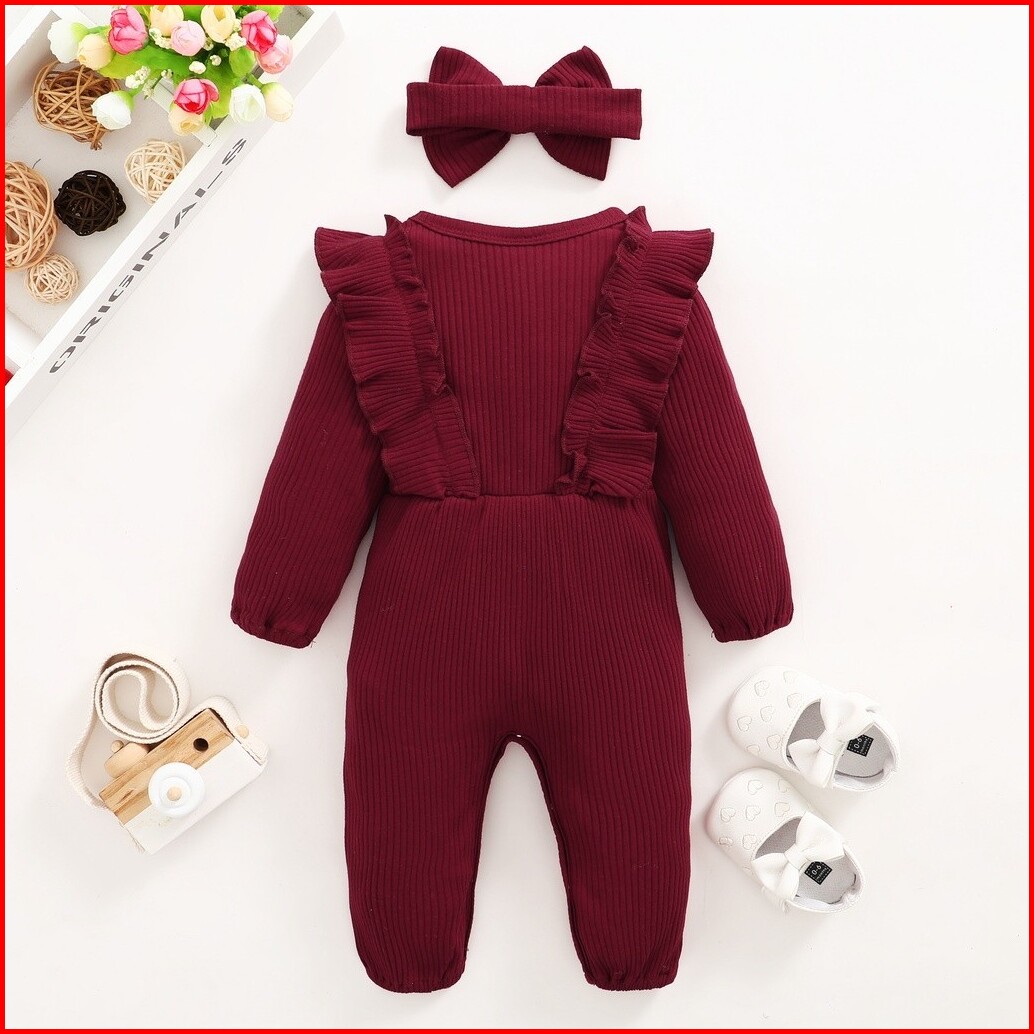 Haasya Kids Baju Baby Girl Bodysuit 0-18 Months Newborn Baby Clothing Set Long Sleeved Ruffle Solid Color Playsuit Headb