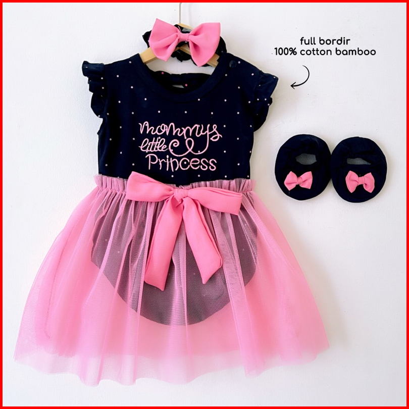 Mommy Little Princess Jumper Tile Newborn Baju Setelan Jumper Rok Bandana Sepatu Pergi Lucu Fashion Anak Bayi Perempuan