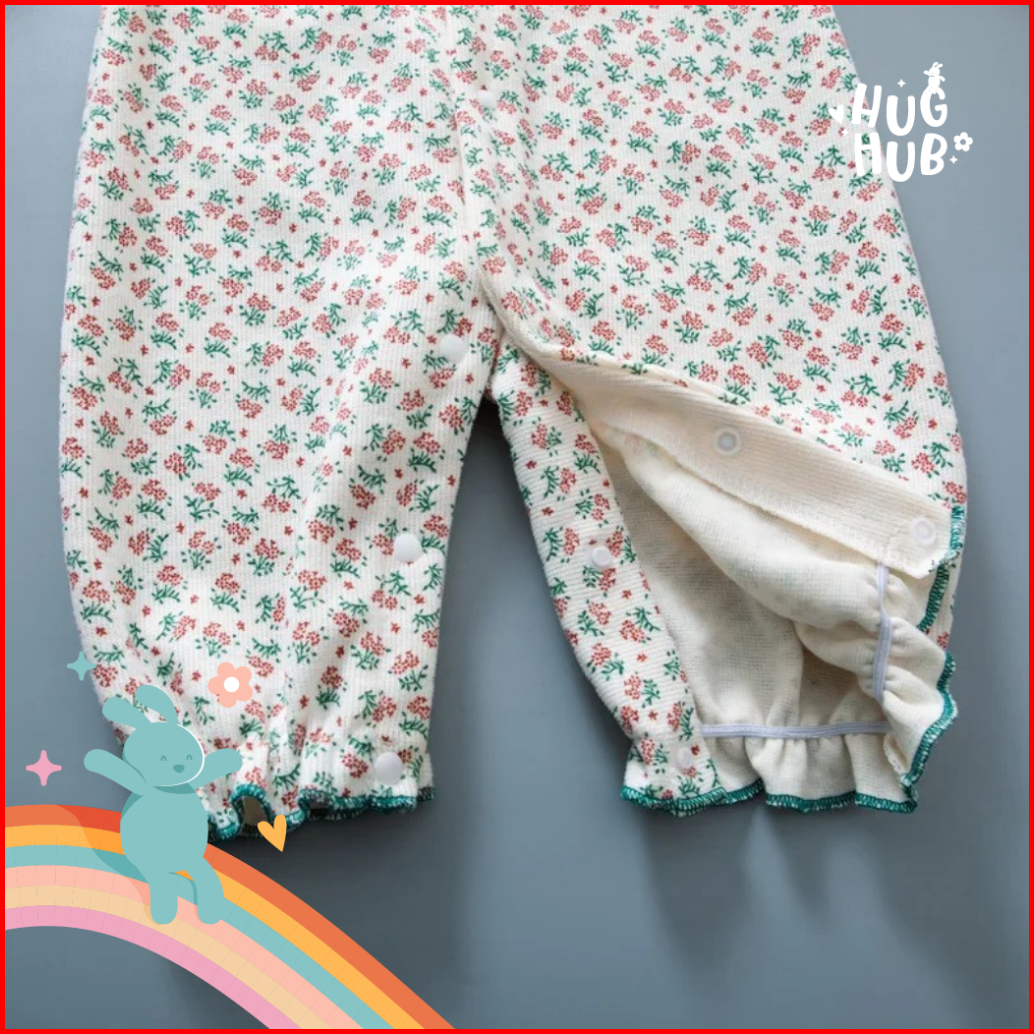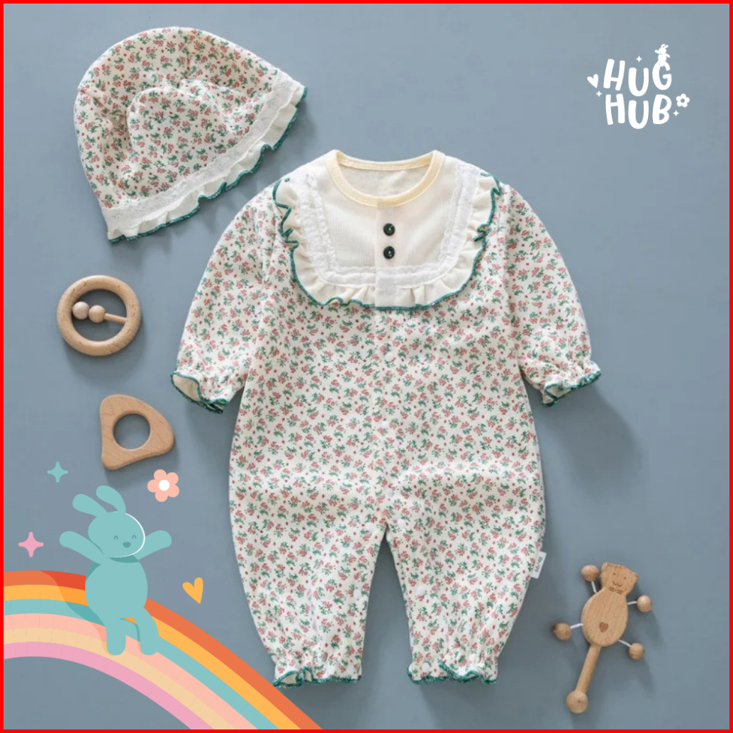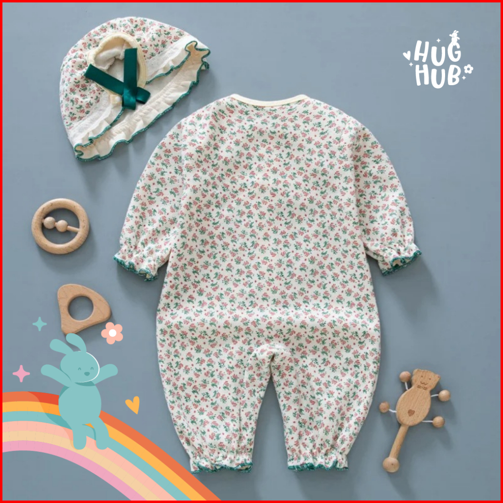 Hughub Jumper Bayi Perempuan Premium Usia 3-12 Bulan Jumpsuit Anak Motif Bunga Dan Topi Lucu