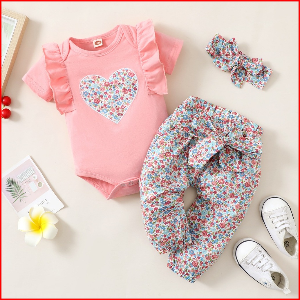 His.baby 0-18 Bulan Set Bodysuit Bayi Perempuan Dengan Bando Dan Celana Motif Bunga Import Warna Pink