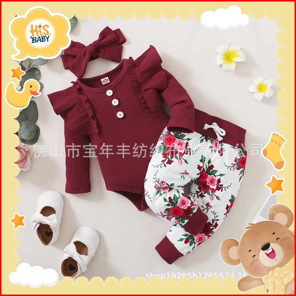 His.baby 0-12 Bulan Set Baju Bayi Perempuan Dengan Bando Dan Celana Bunga Merah Import Warna Maroon