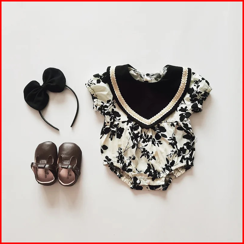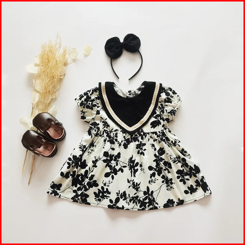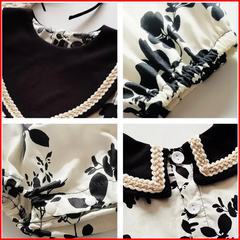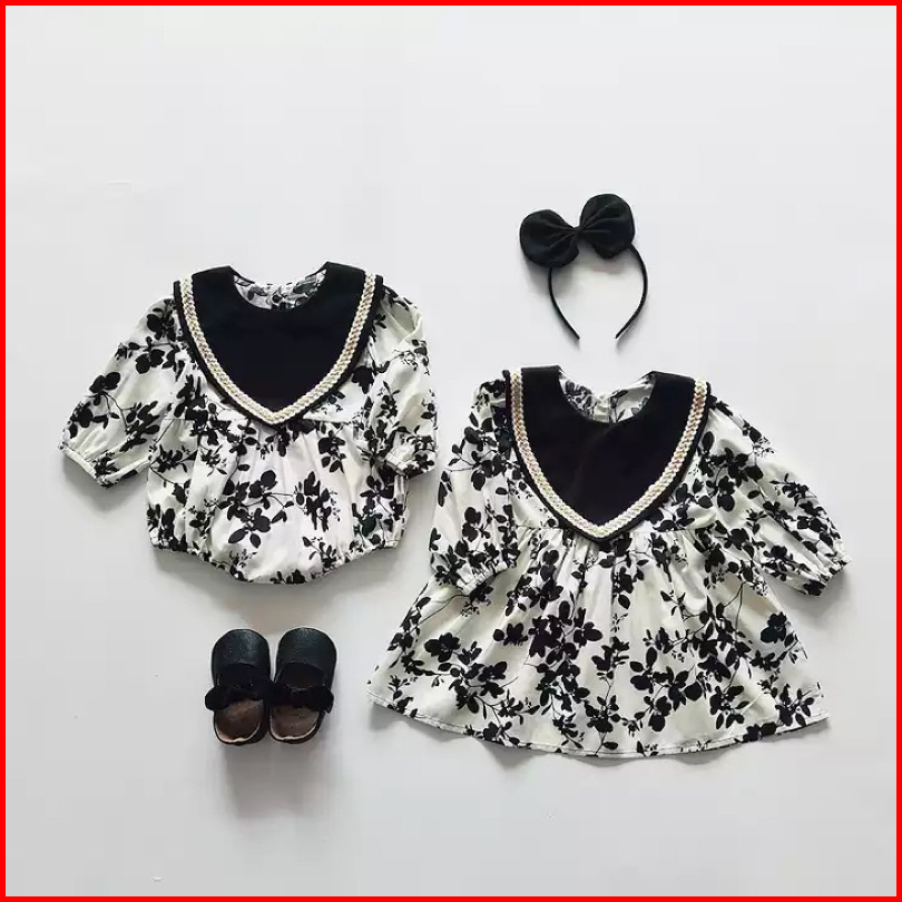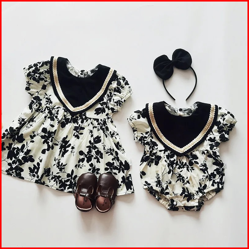 Alincia Dress Dan Romper Alincia Lengan Pendek Hitam Putih Motif Daun Couple Kakak Adik Gaya Eropa Korean Style Bayi Bar