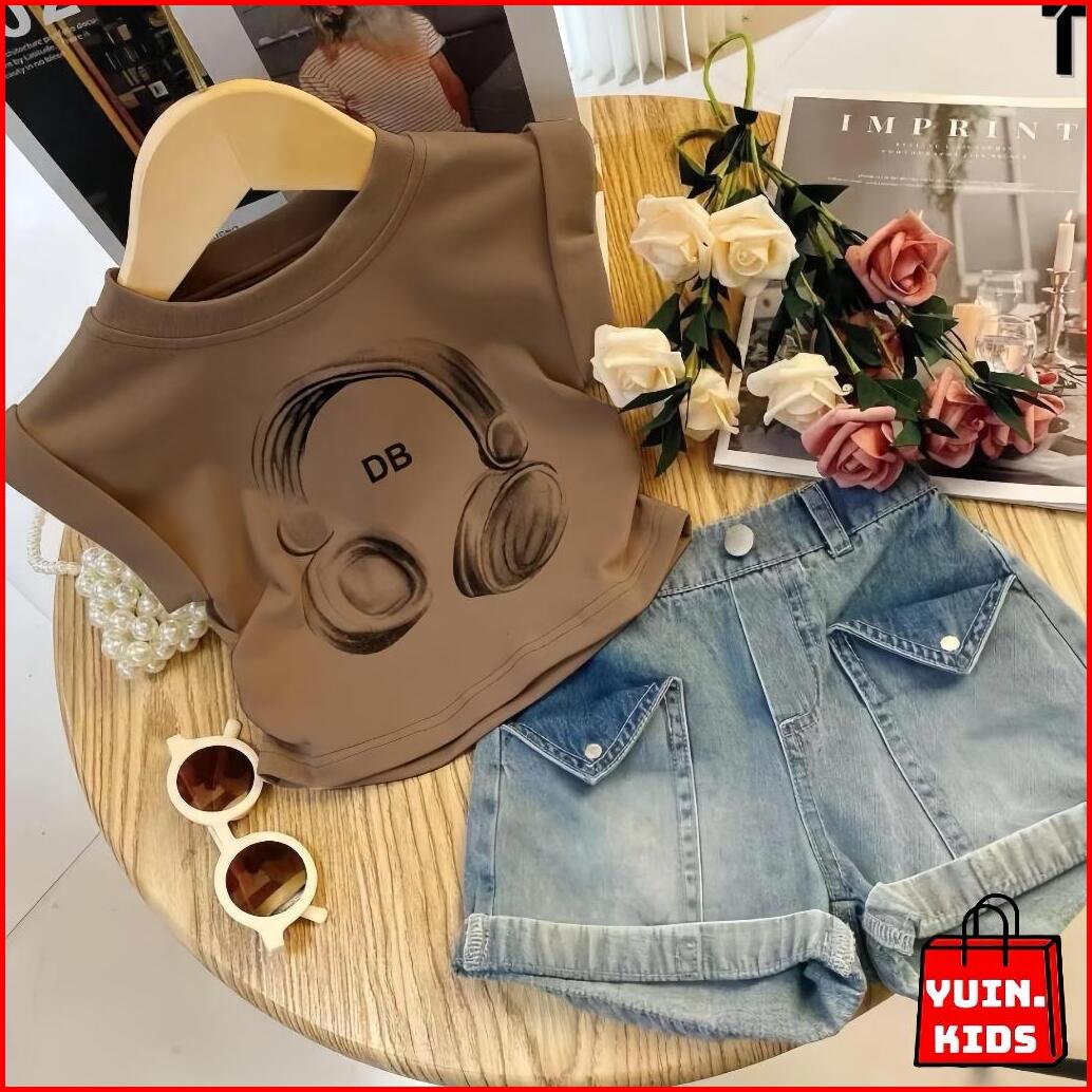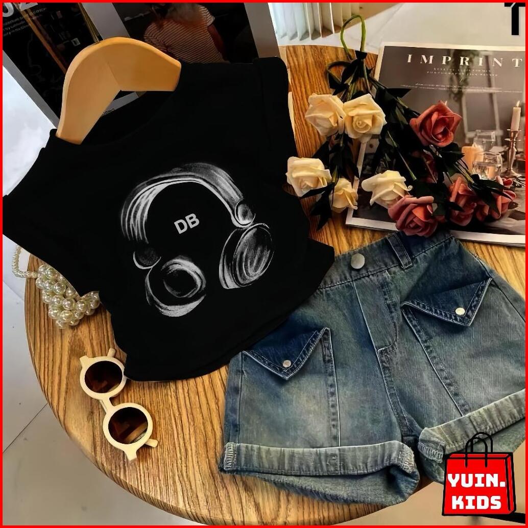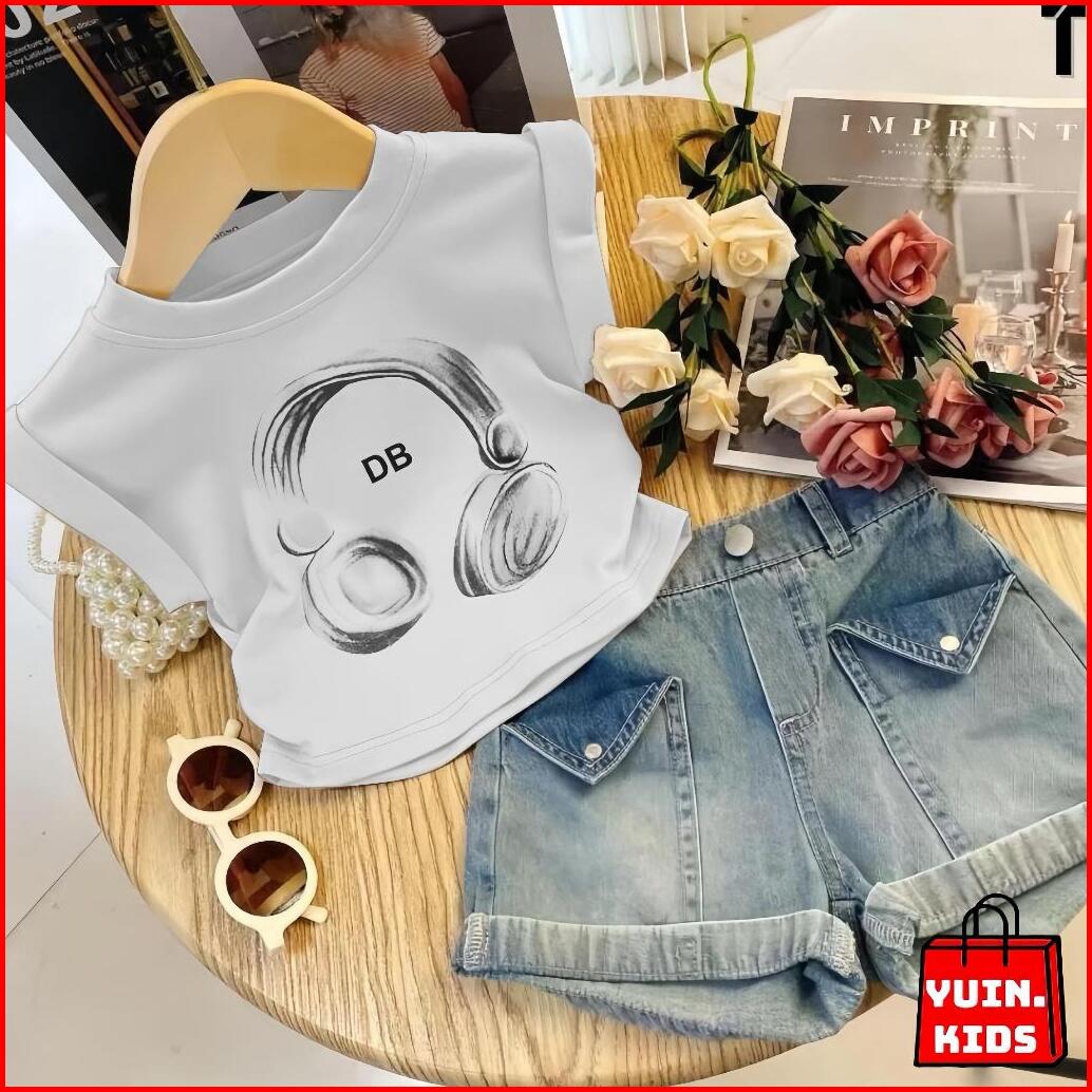 Setelan Anak Perempuan Lucu Motif Earphone Dbox Usia 1-5 Tahun Set Baju Kaos Anak Dan Celana Denim