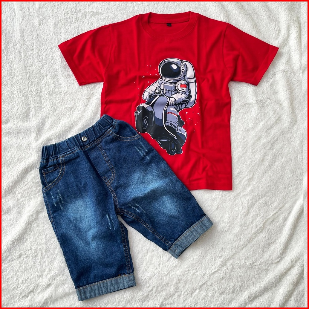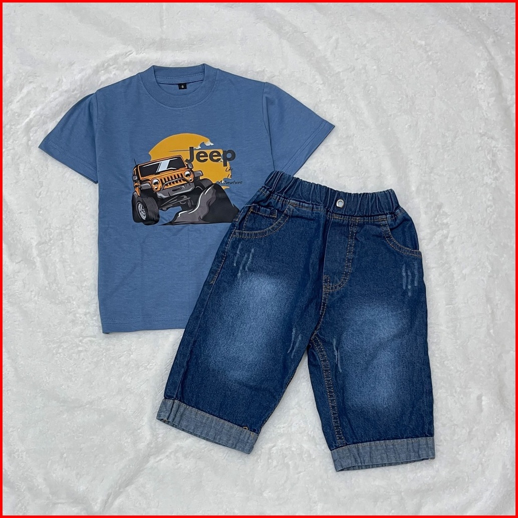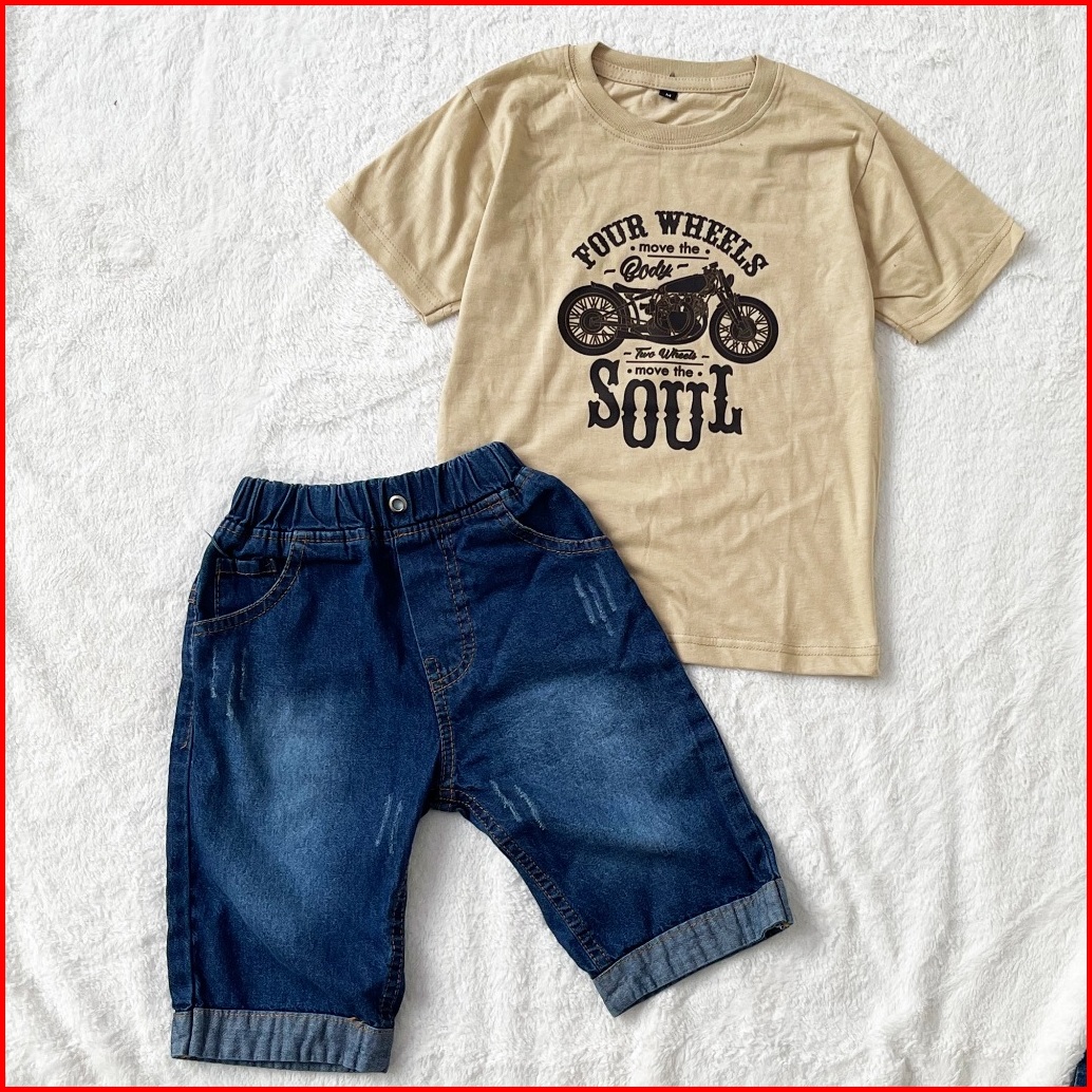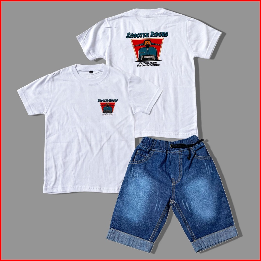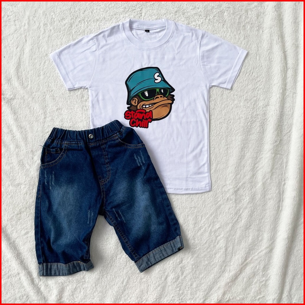 Setelan Celana Jeans Pendek Anak Dan Kaos Distro Bahan Katun Usia 3-12 Tahun