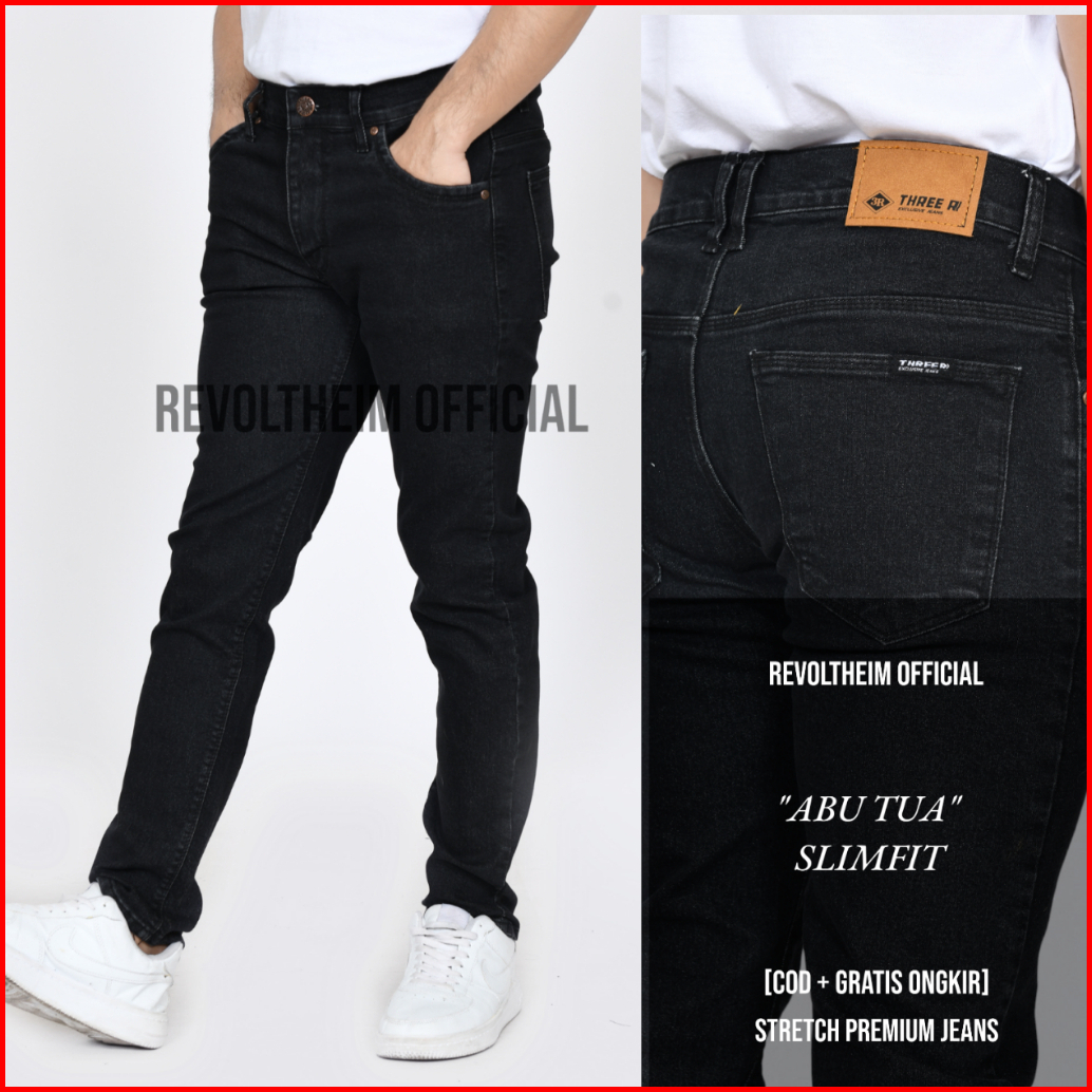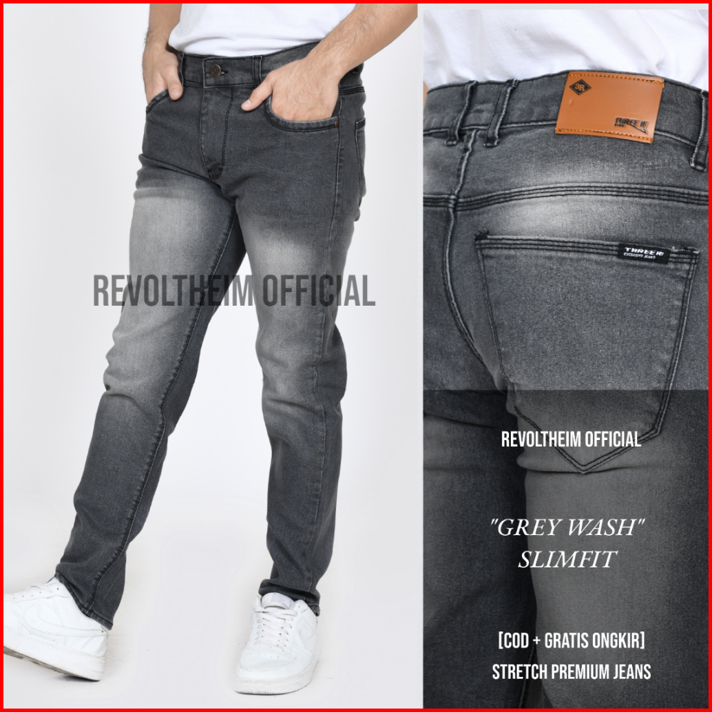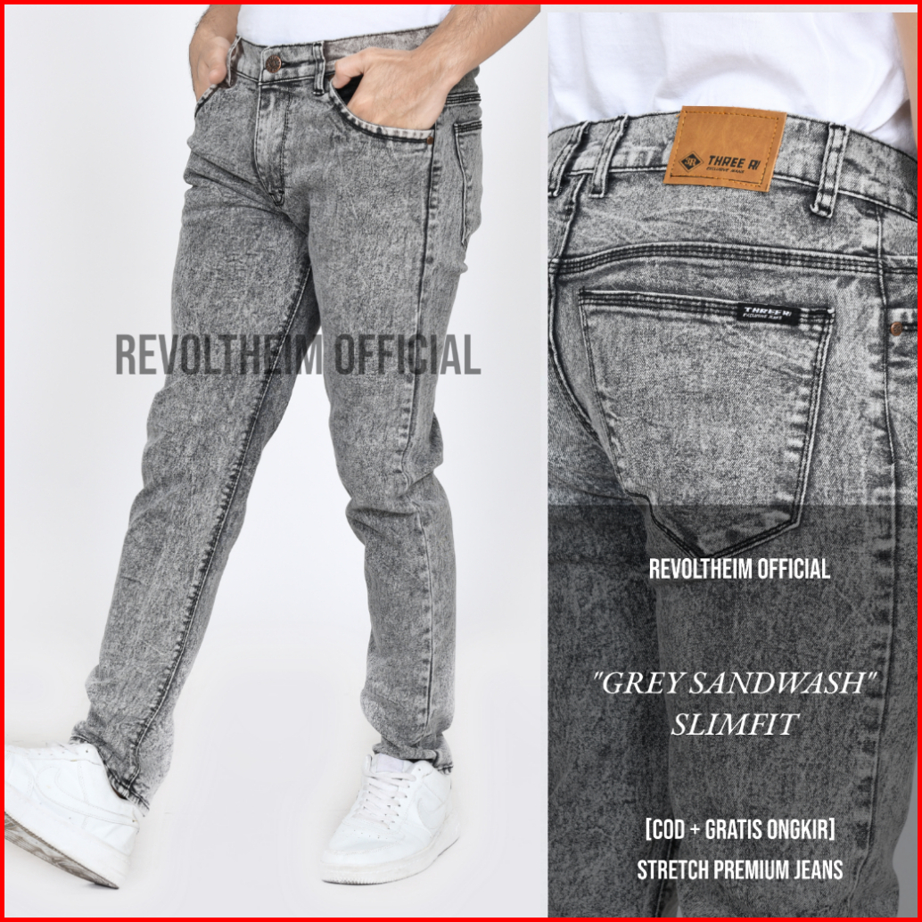Celana Jeans Pria Slim Fit Panjang Stretch Grey Sandwash Acid Abu Cowok Tebal Denim Melar